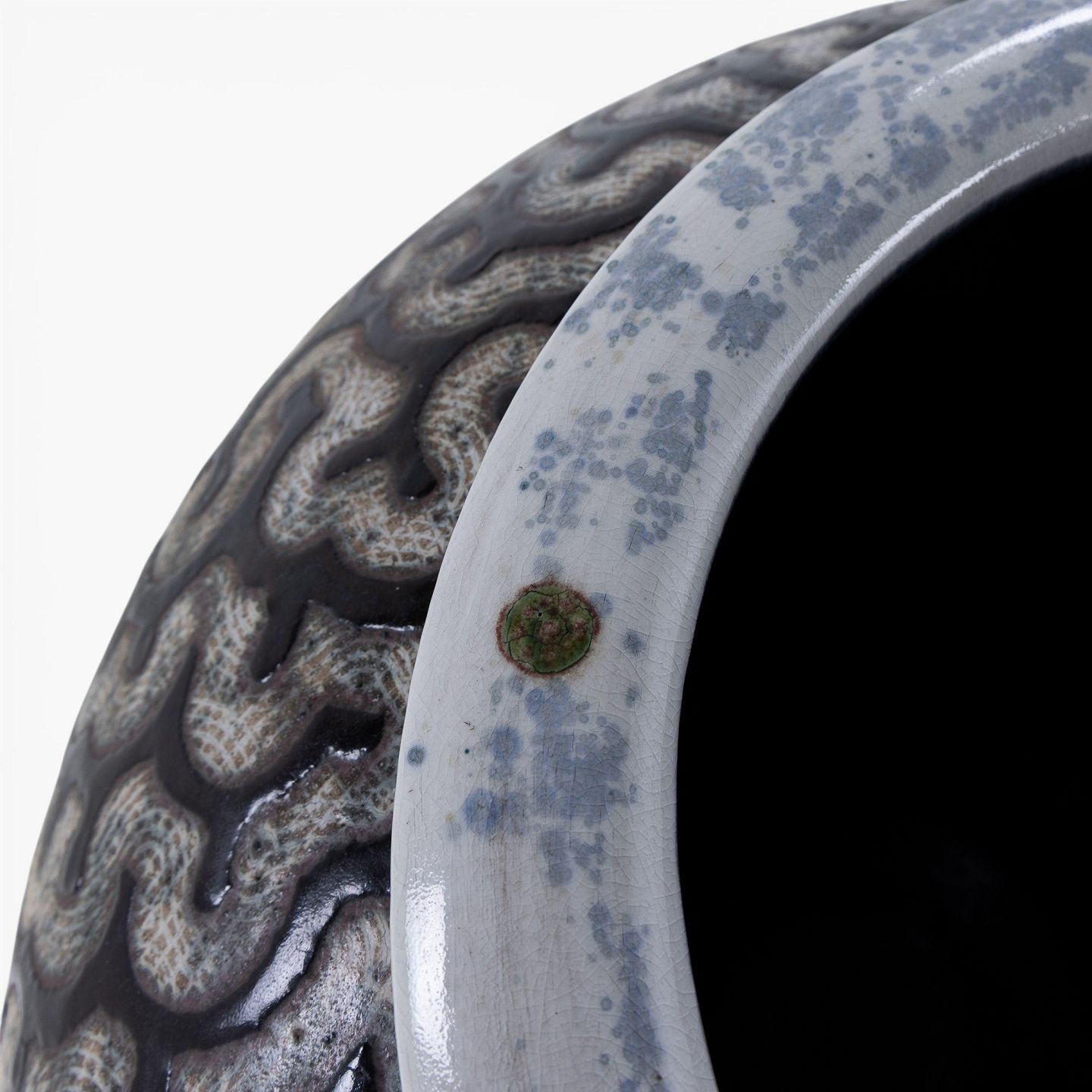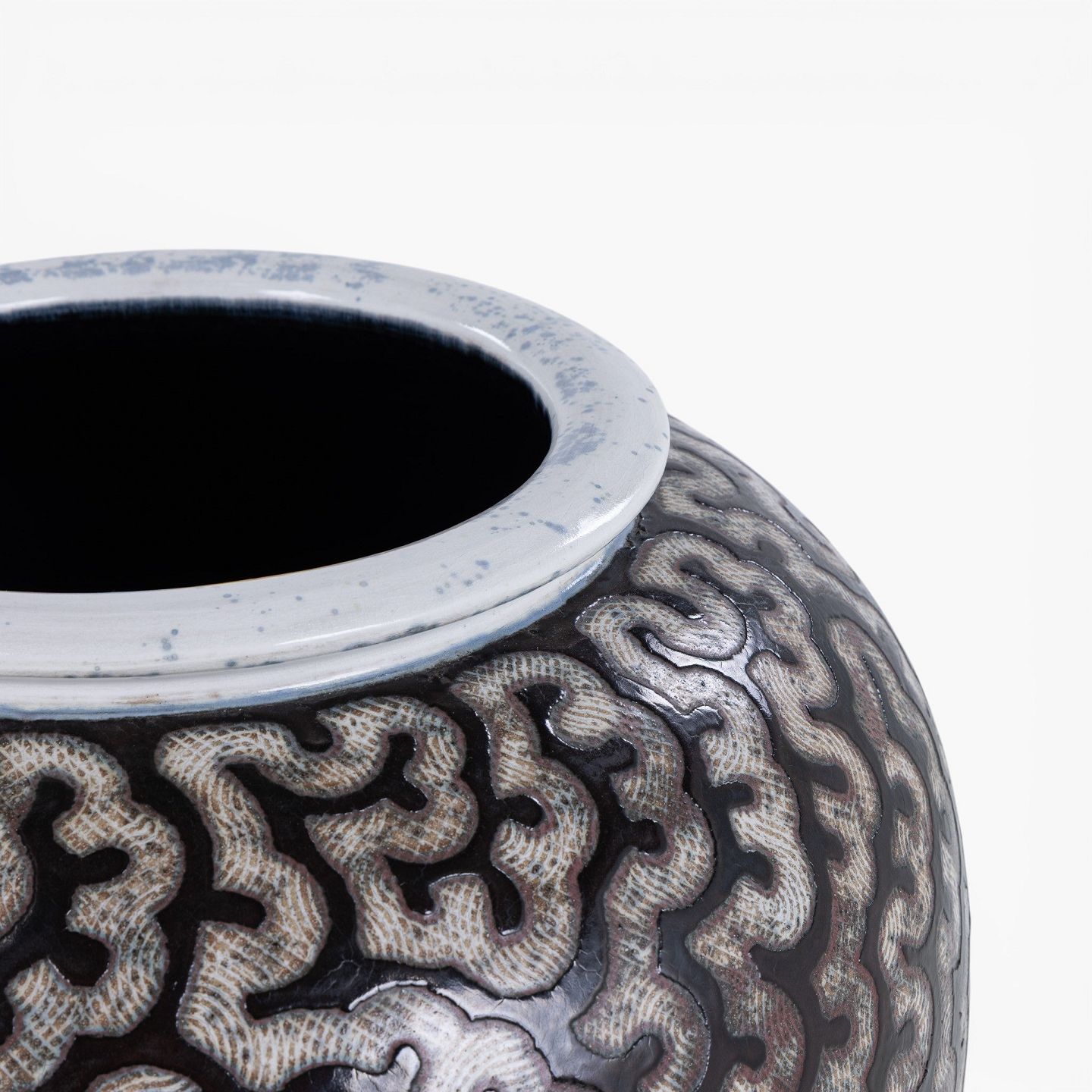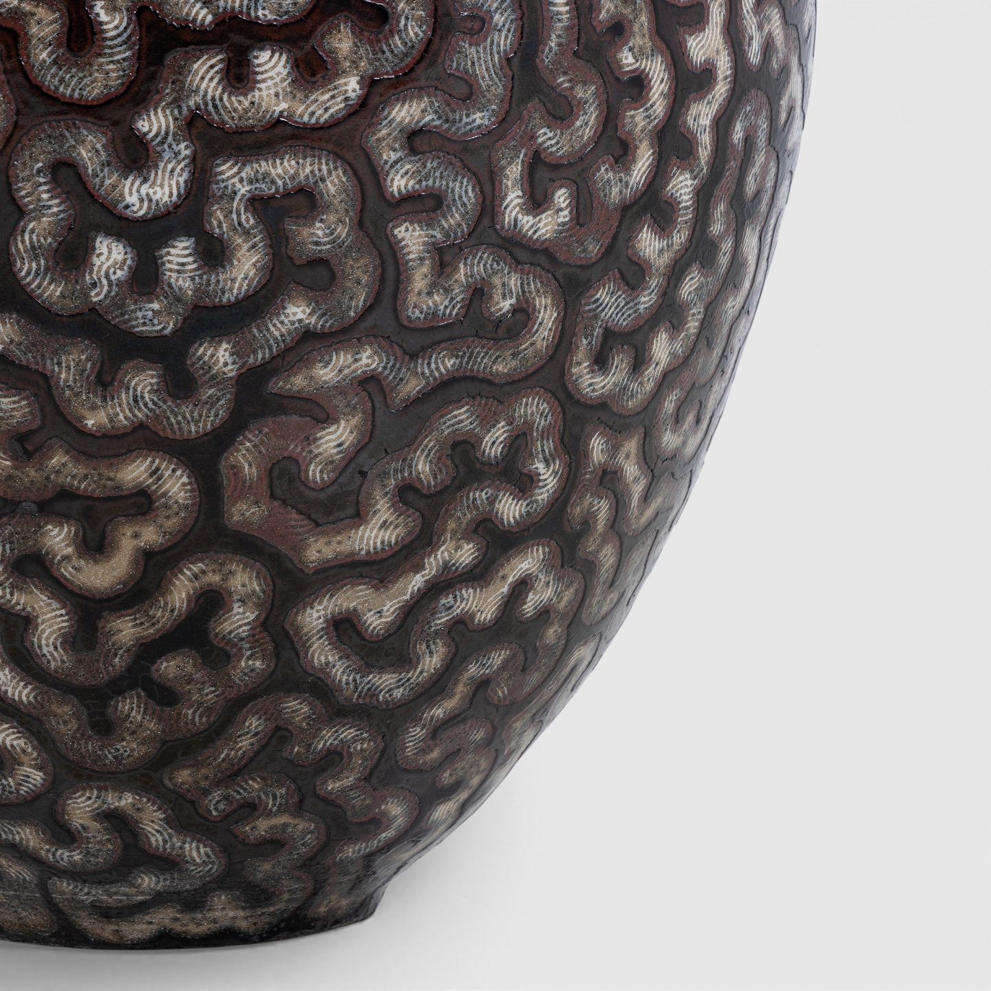 Per Weiss / Eget værksted.Kolossal krukke i stentøj med sort glasur og hvide stafferinger. Signeret.