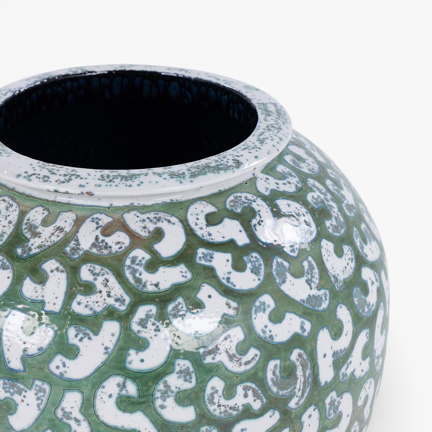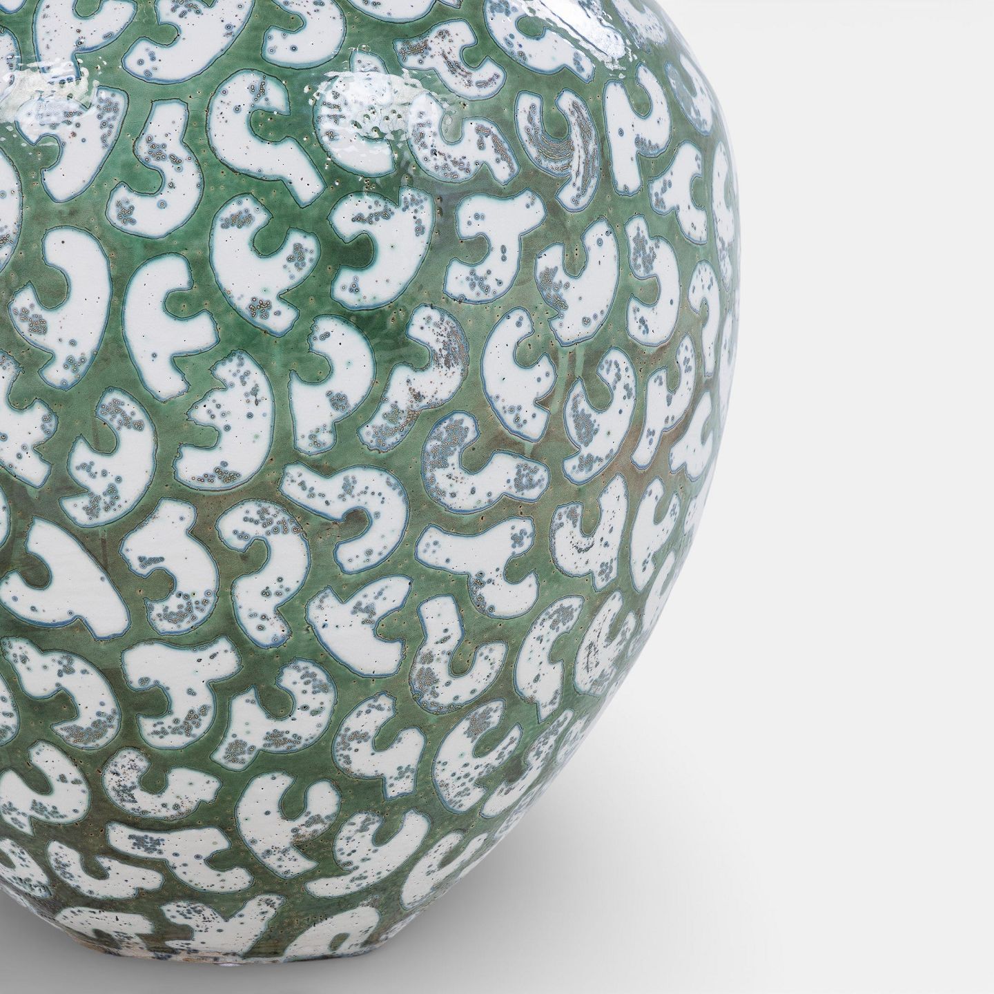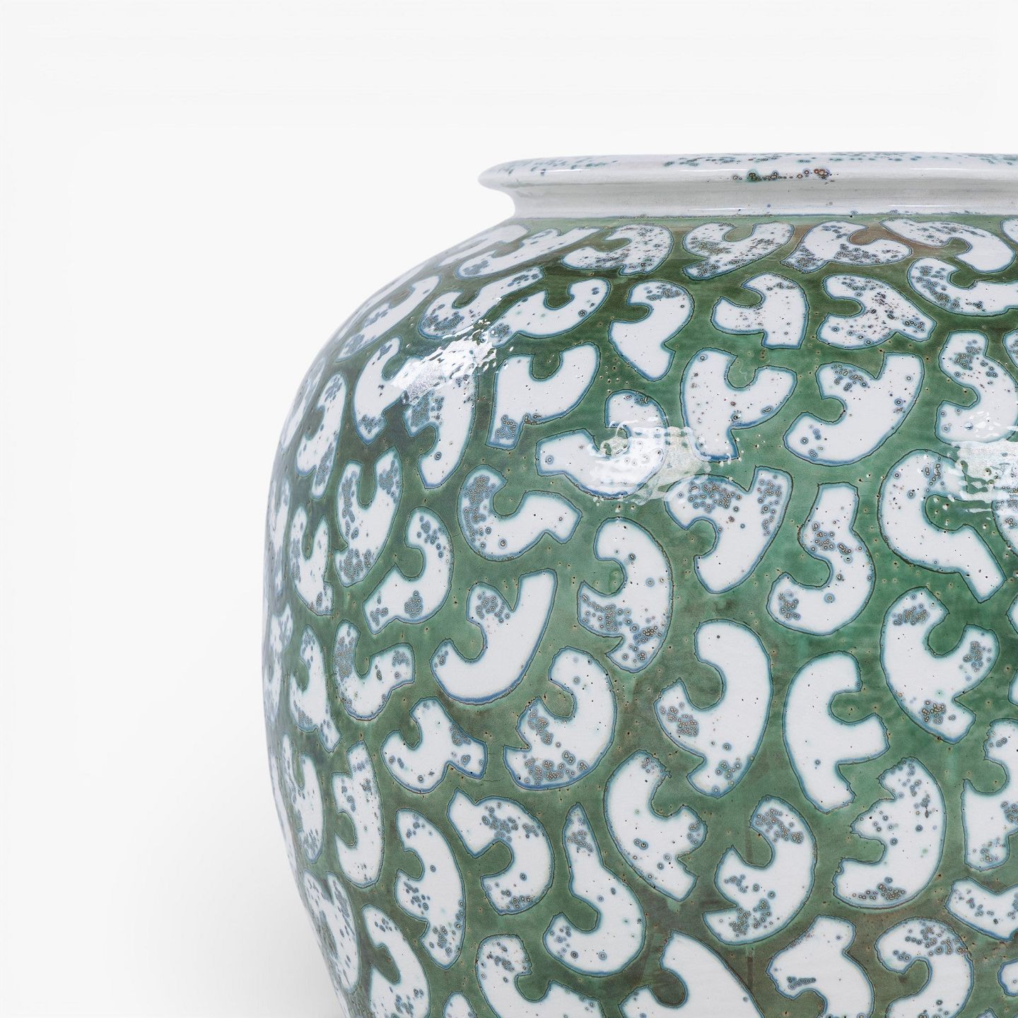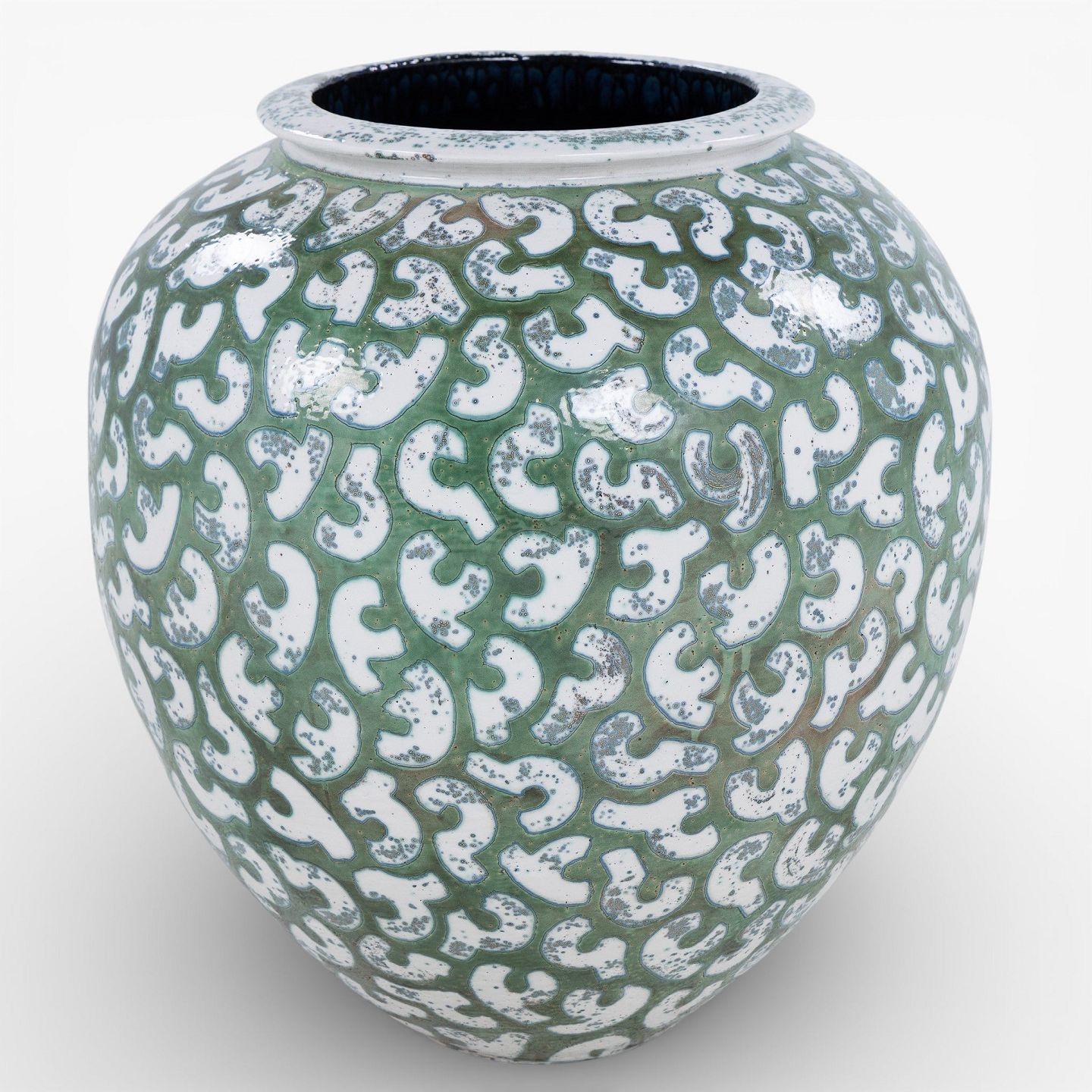 Per Weiss / Eget værksted.Kolossal krukke i stentøj med grøn glasur og hvide stafferinger. Signeret.