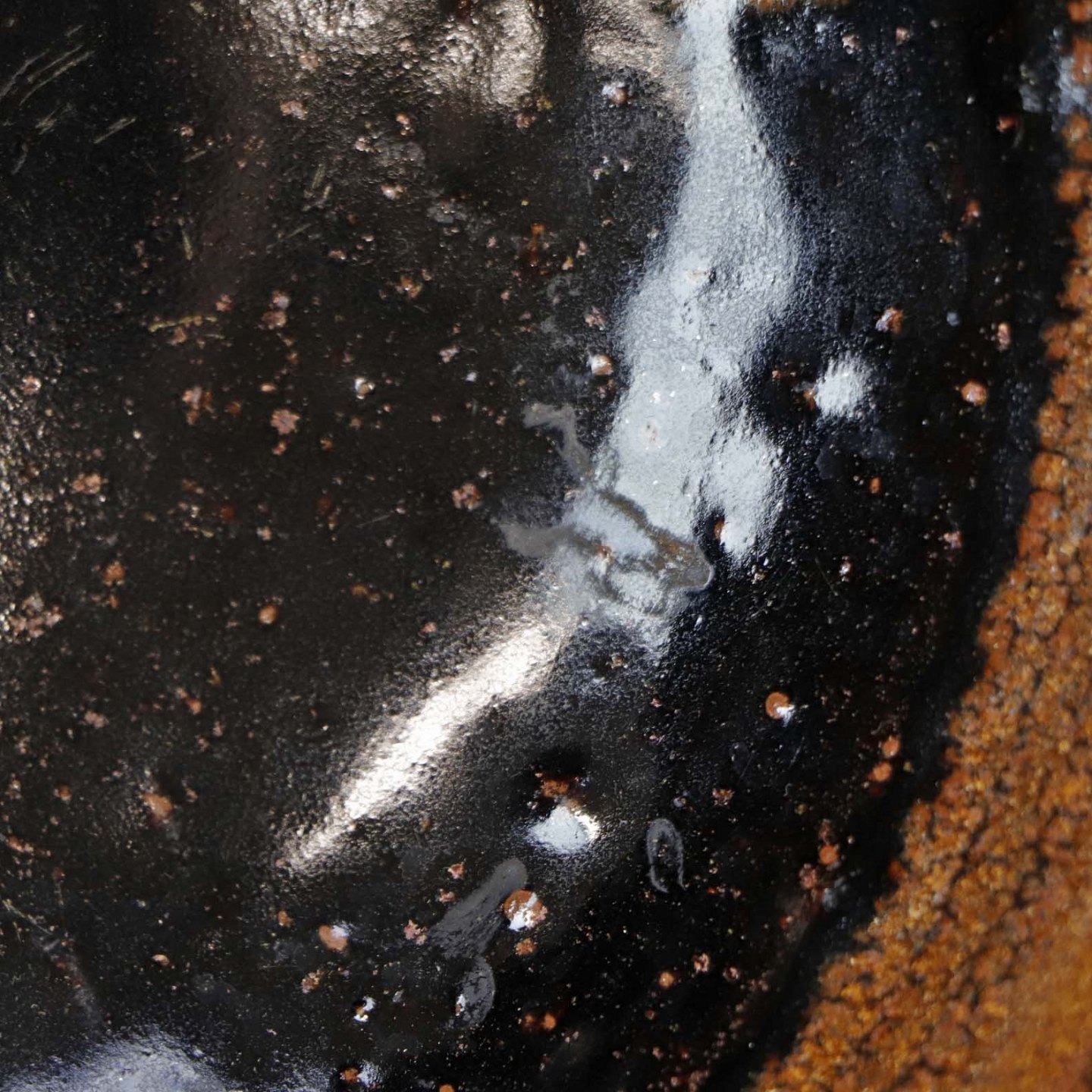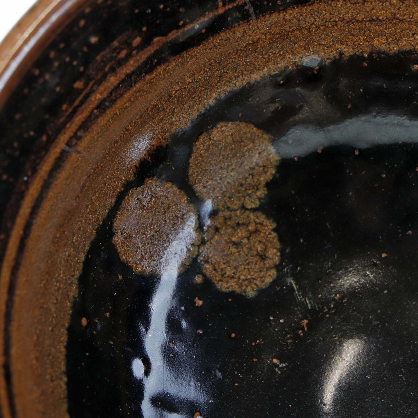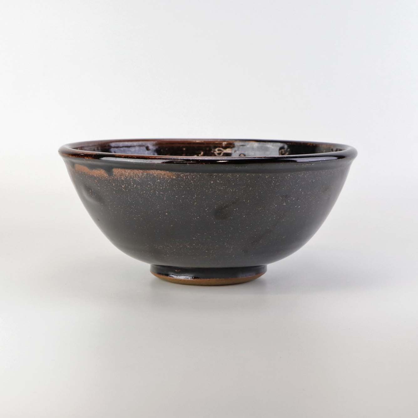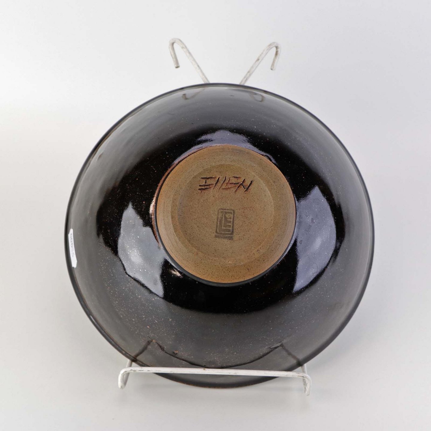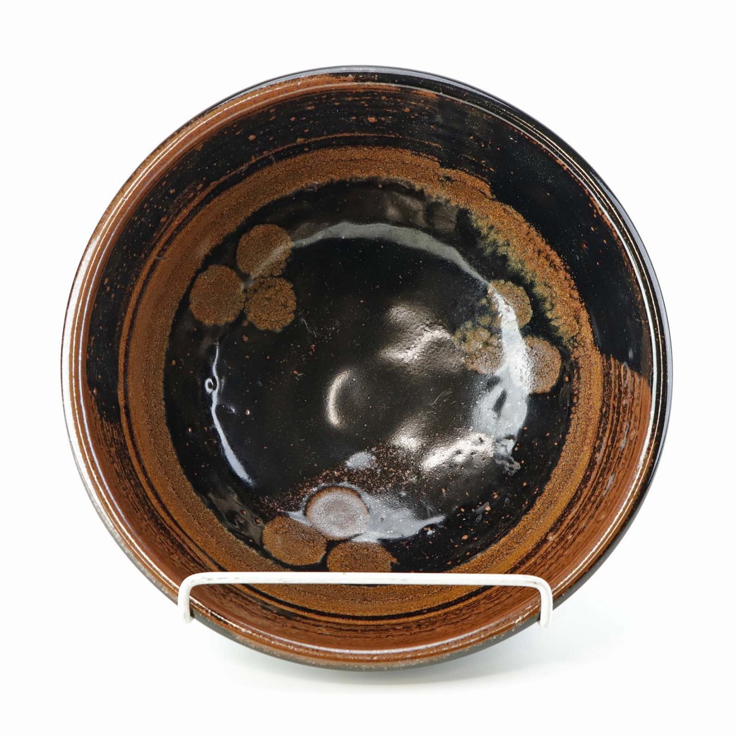 Skål i stentøj med delvist nubret glasur i brunlige nuancer og cirkelformet mønster i bunden. Formgiver Ellen Madsen og Ole Bøgild (1901-1987)