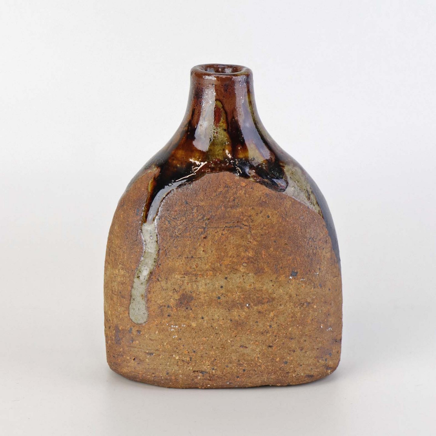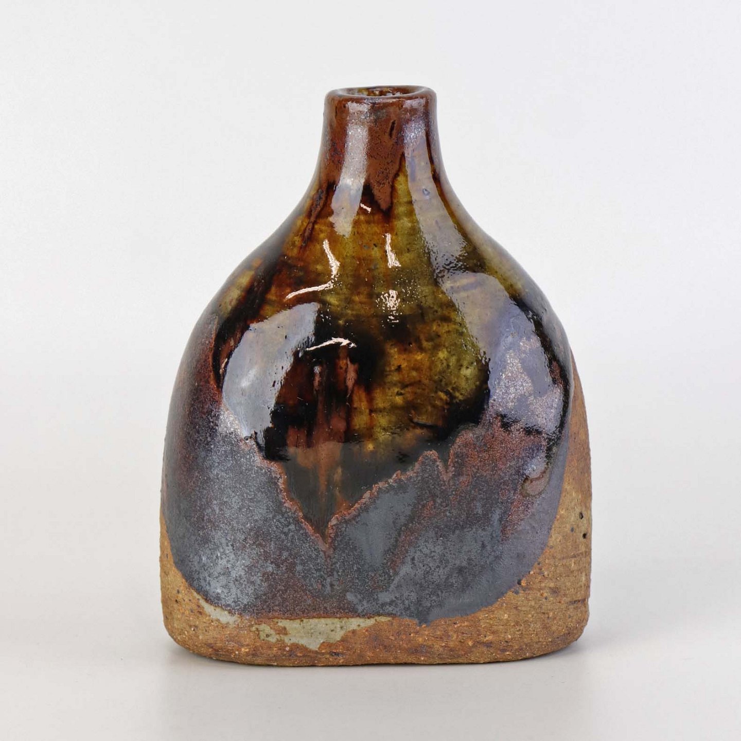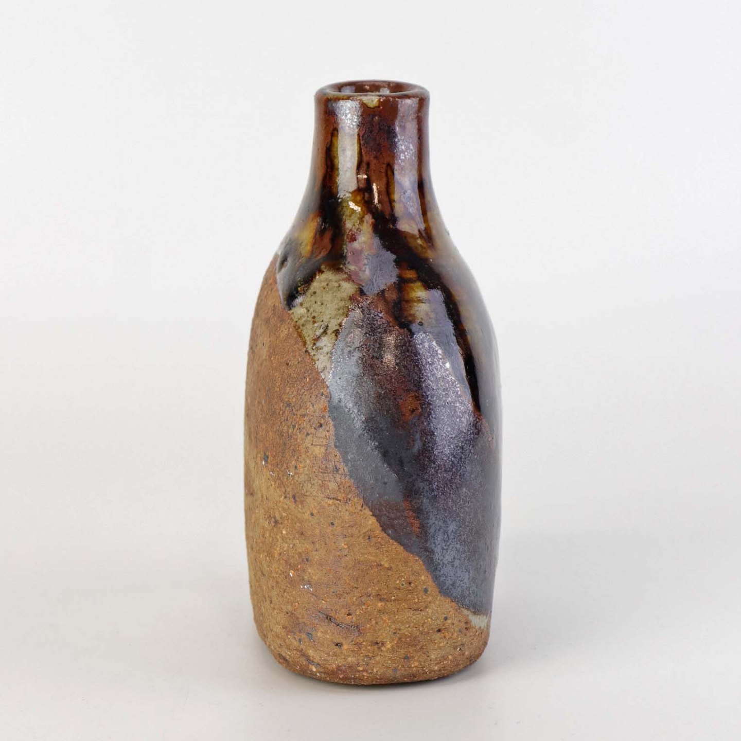 Lille flaskeformet vase i keramik med flerfarvet glansfuld og mat glasur.Formgiver Conny Walther