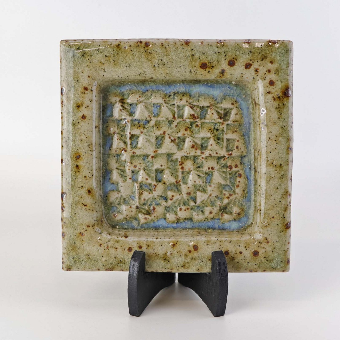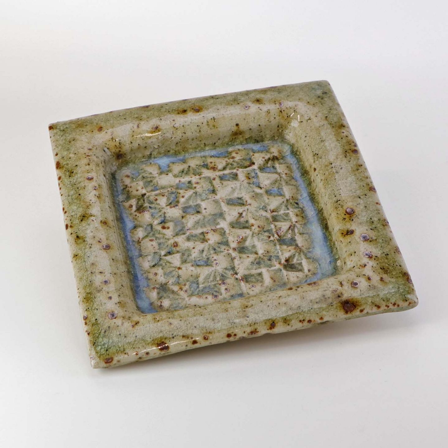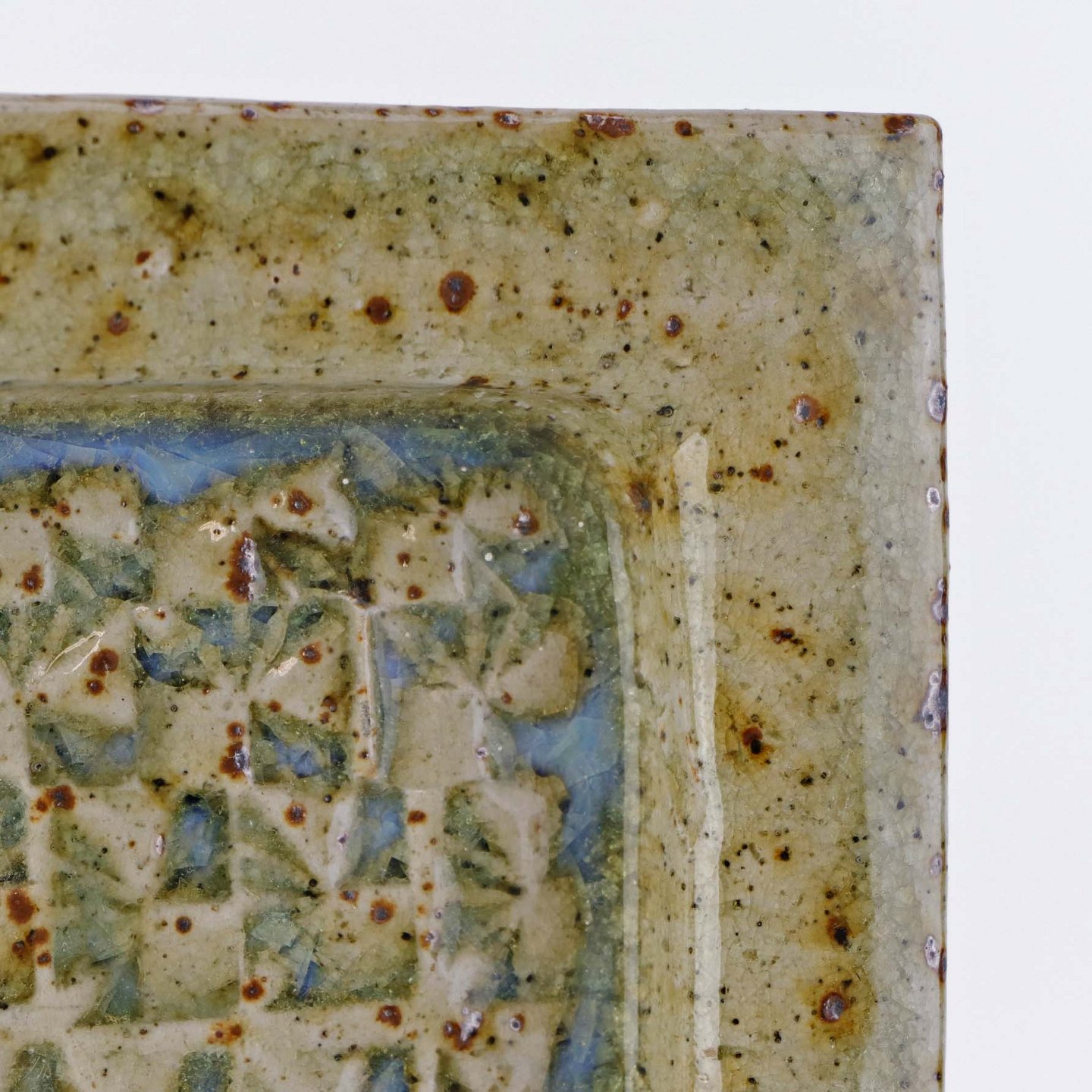 Firkantet fad i keramik med struktureret bund med lyseblå og beige glasur med røde pigmenter.Formgiver Conny Walther