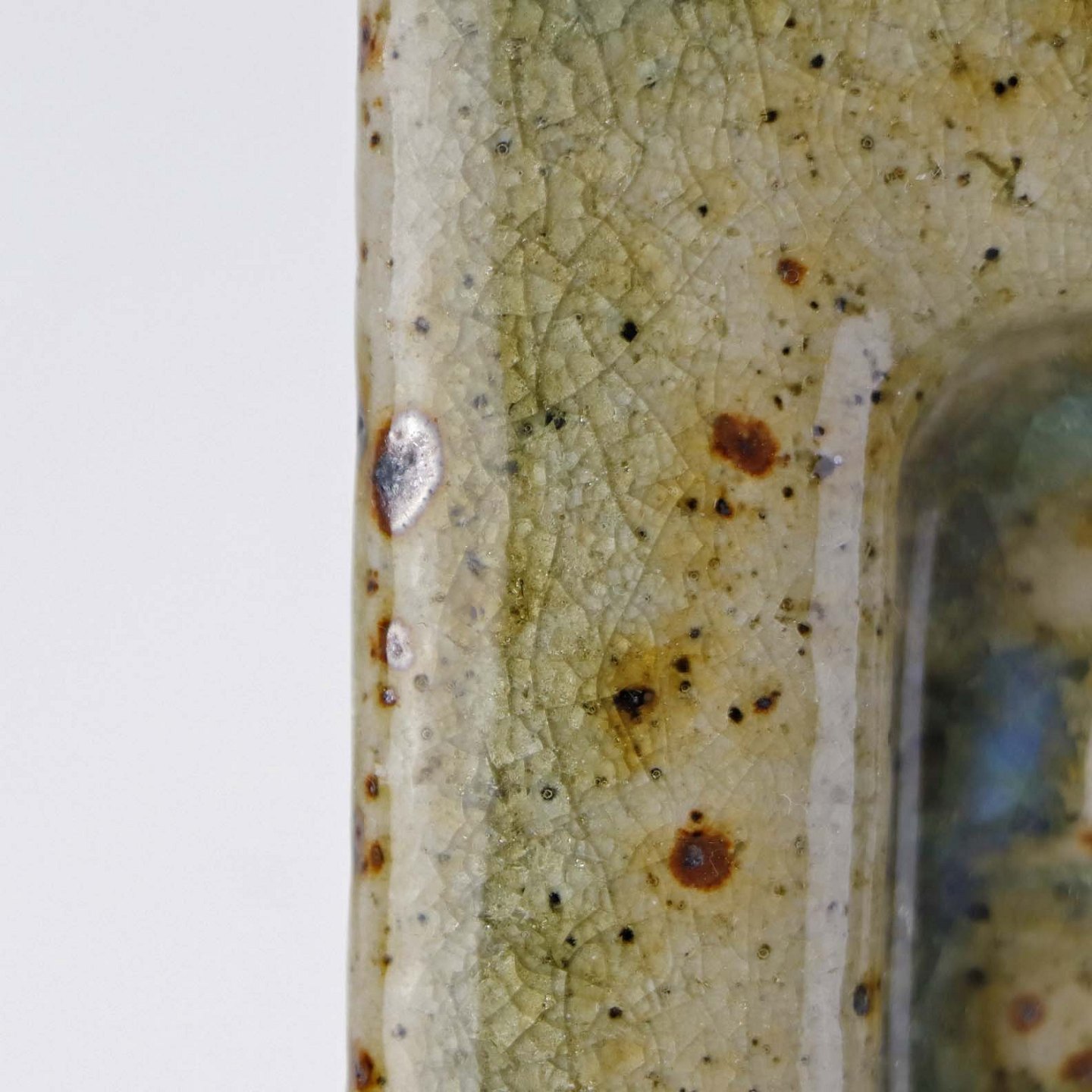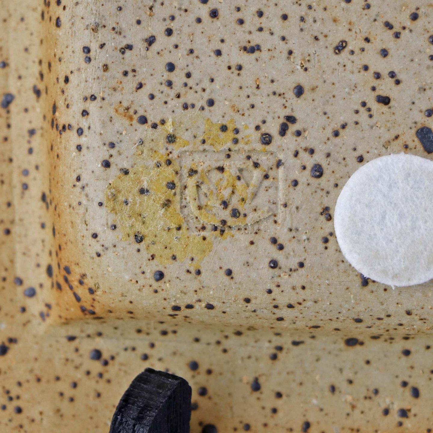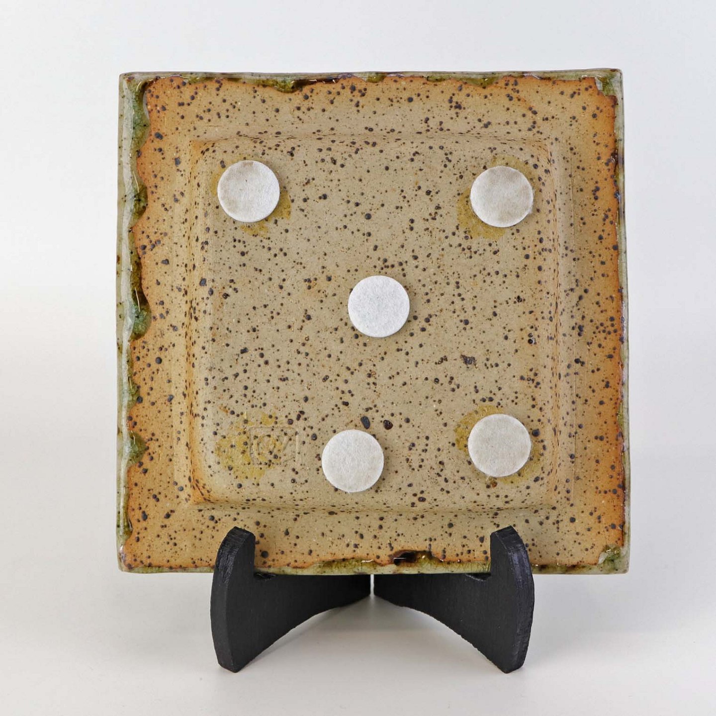 Firkantet fad i keramik med struktureret bund med lyseblå og beige glasur med røde pigmenter.Formgiver Conny Walther
