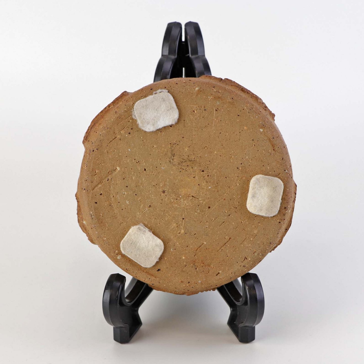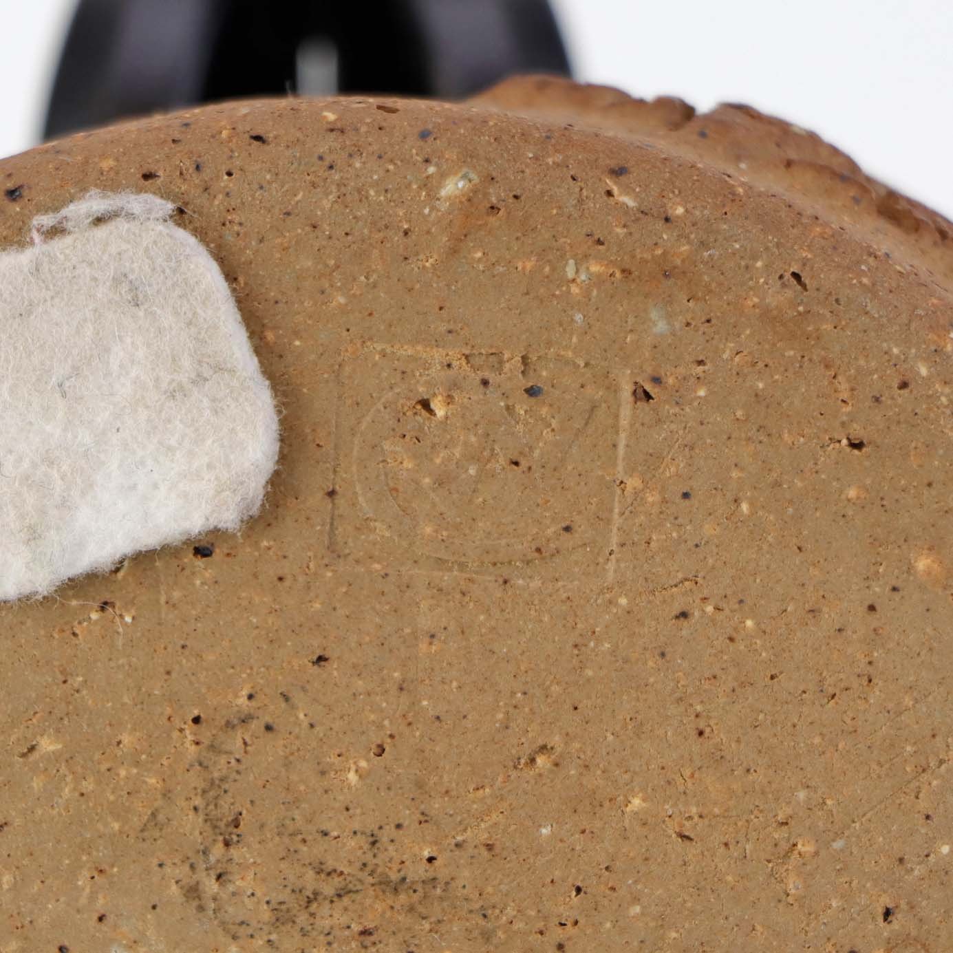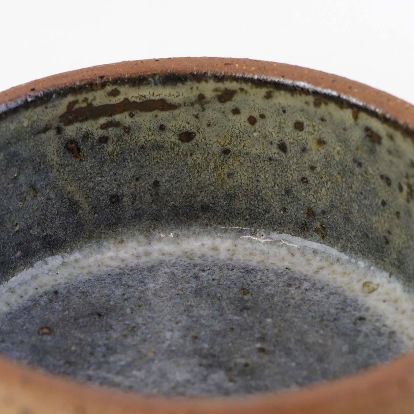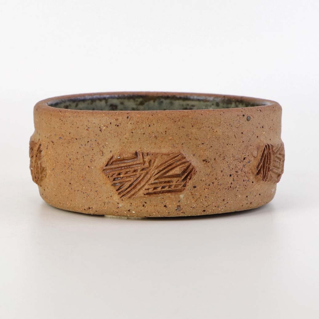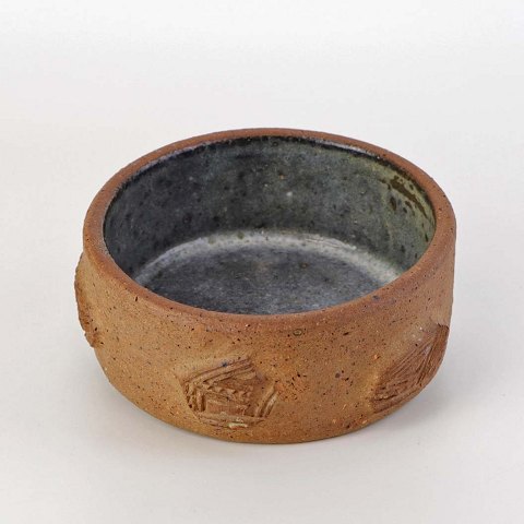 Lille rund skål i keramik med grå glasur på indersiden samt abstrakt mønstret yderside i uglaseret keramik.Formgiver Conny Walther