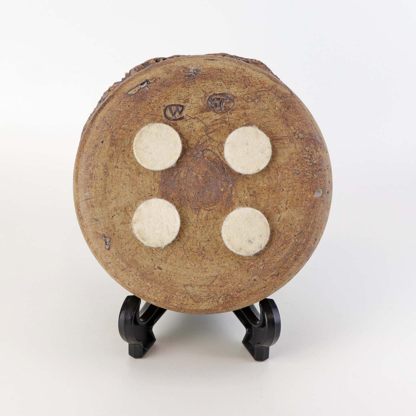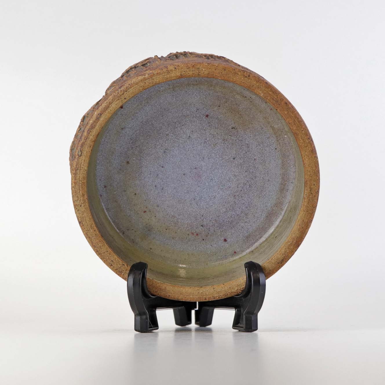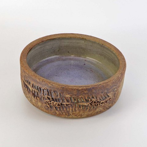Rund skål i keramik med beige, grå og lyseblå glasur på indersiden samt uglaseret abstrakt mønster på ydersiden.Formgiver Conny Walther