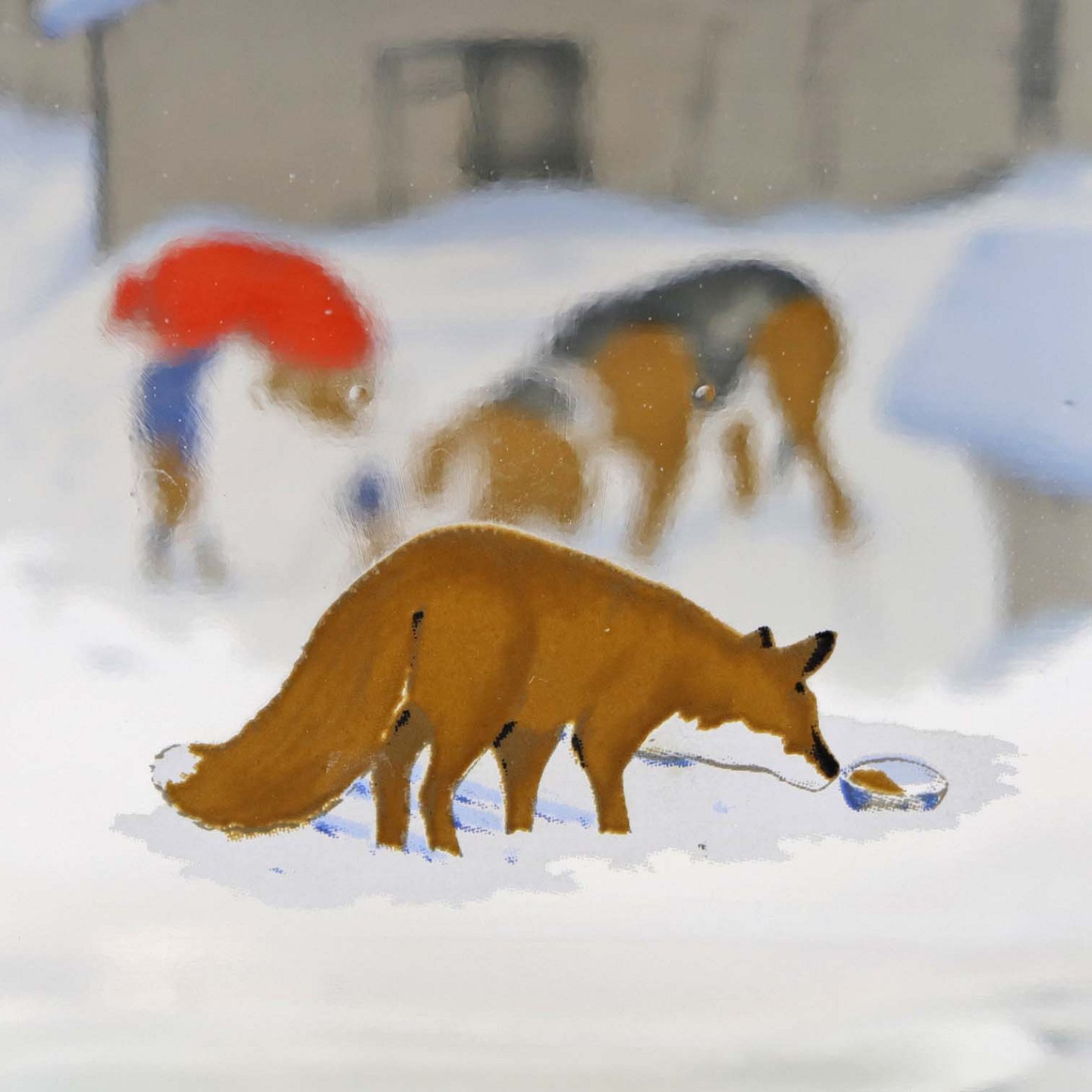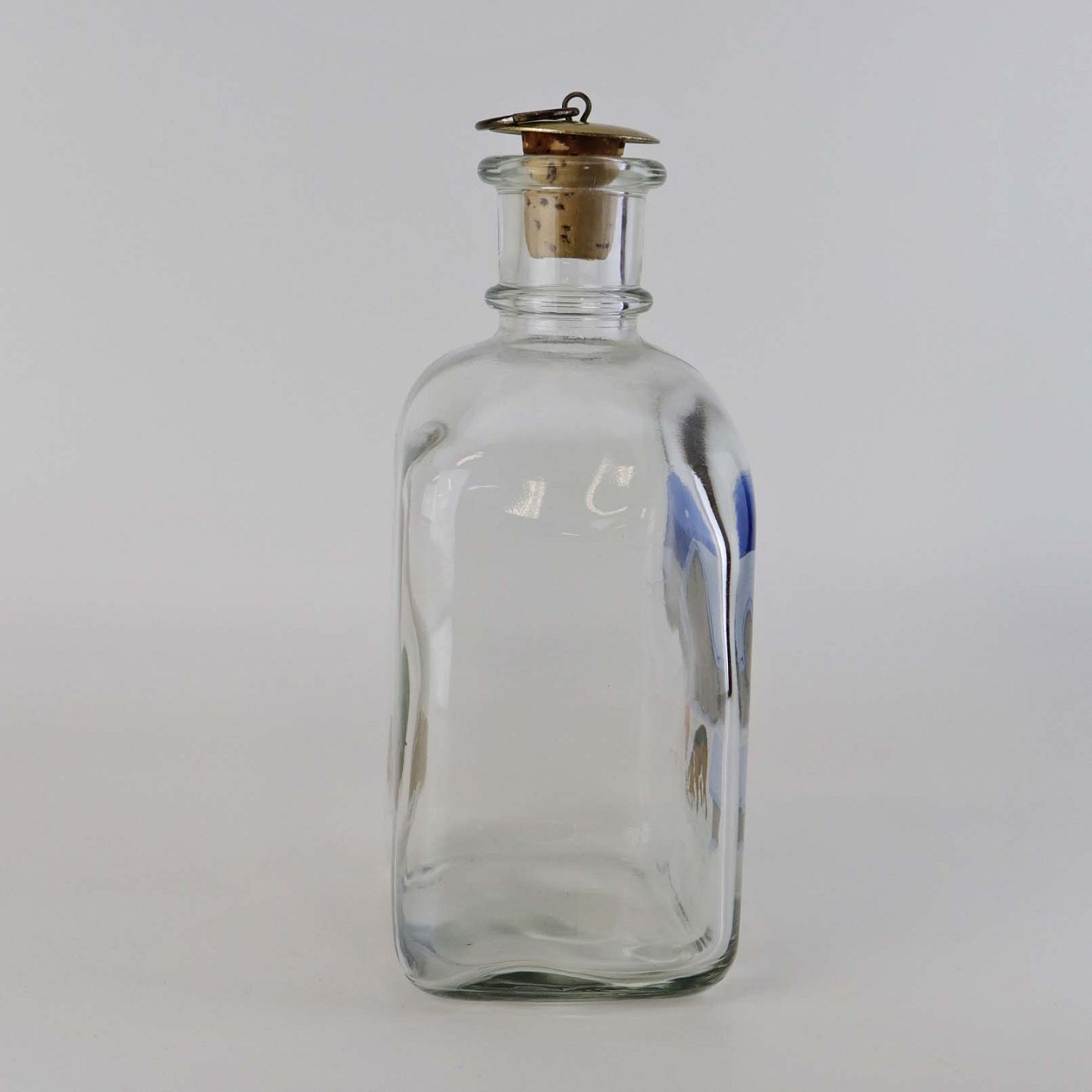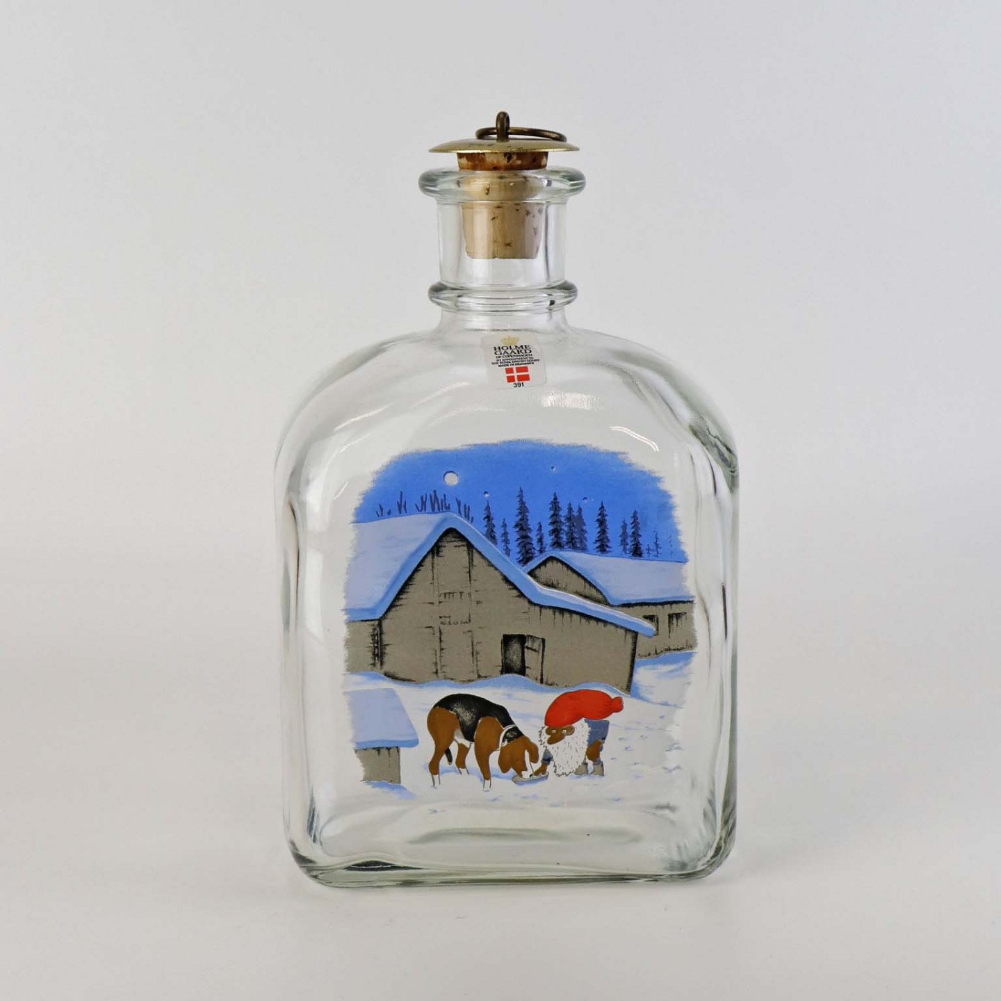 Dramflaske i glas med julemotiv af Nisse, hund og ræv efter tegning af Harald Wibergs. Snapseflasken kommer med korkprop.Producent Holmegaard