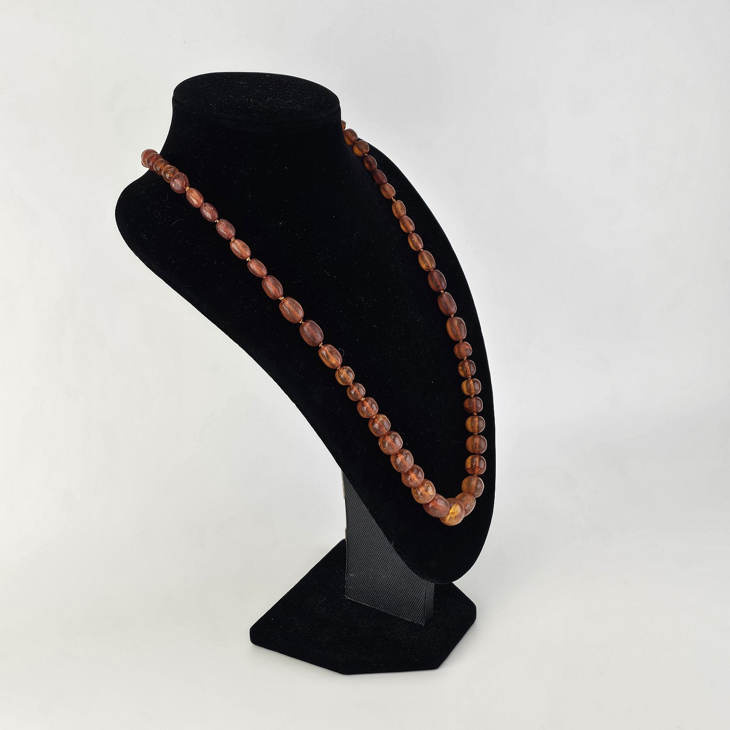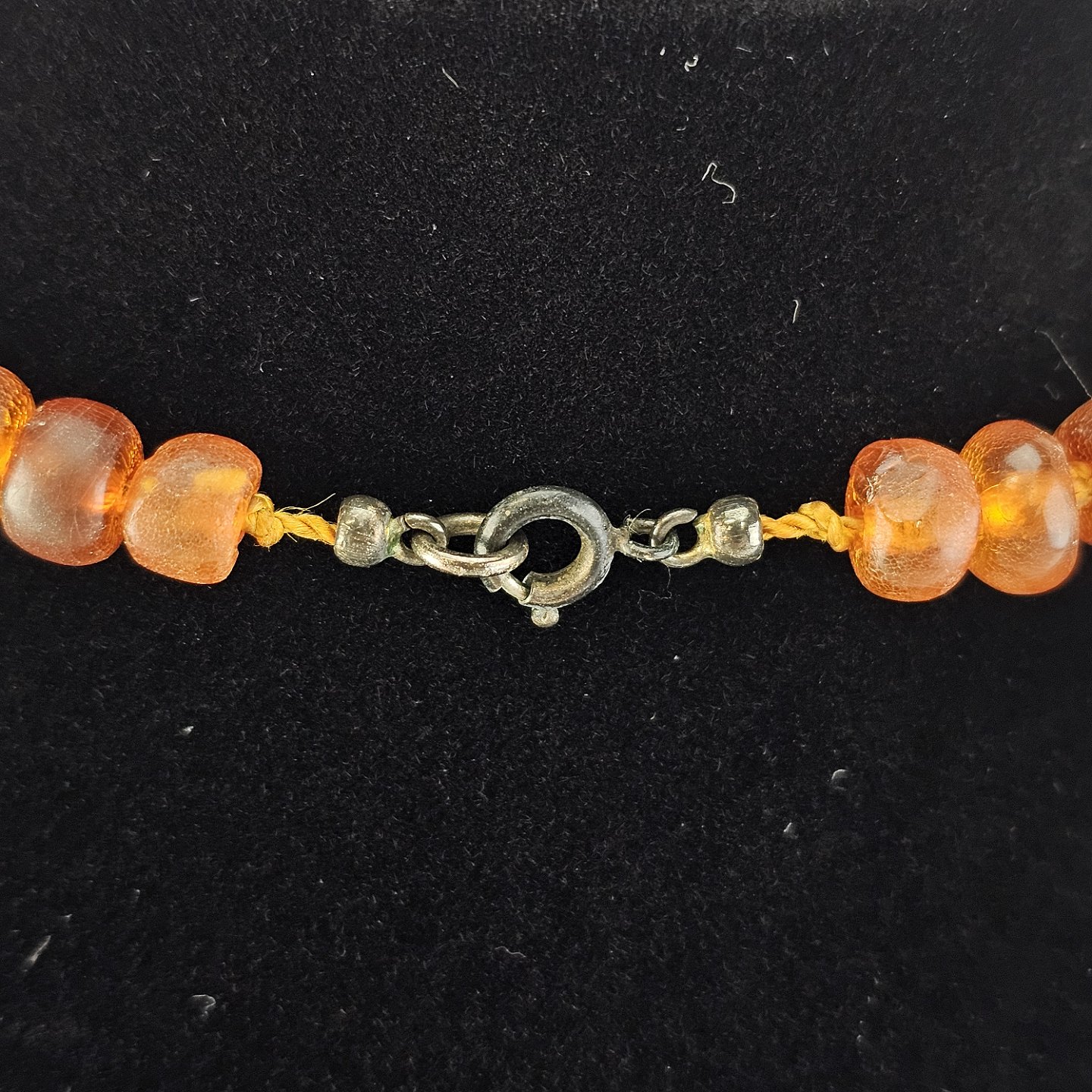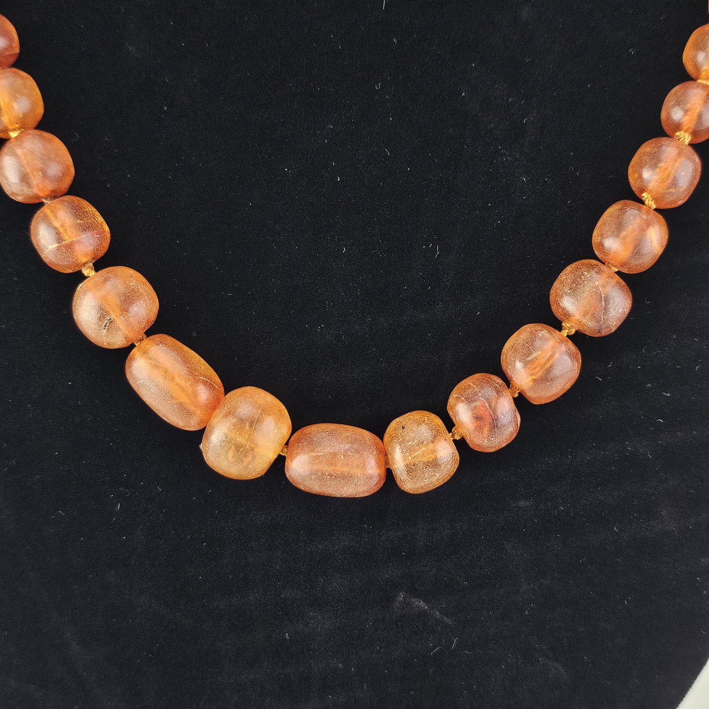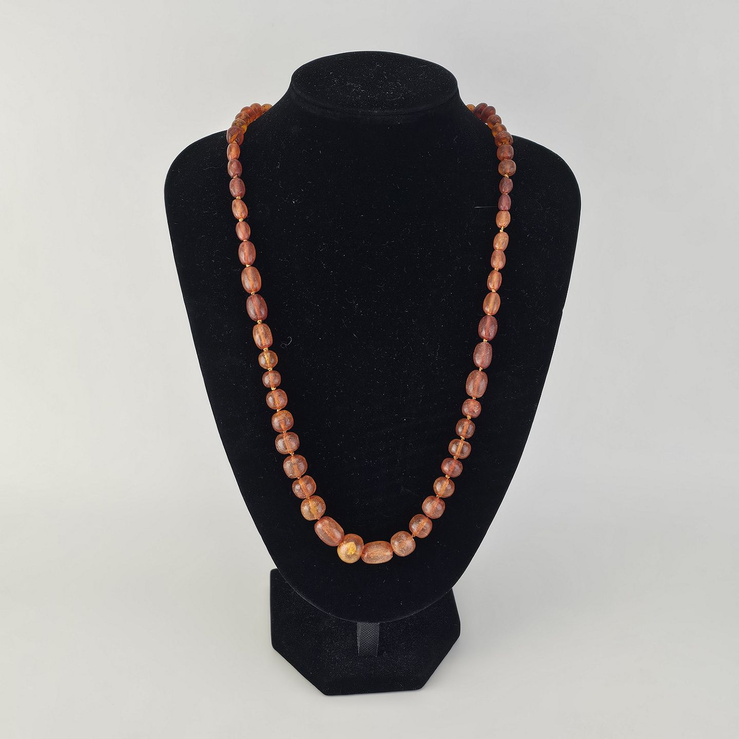 Halskæde med glatslebne ravstykker i varierende størrelse på snor, i alt 65 stykker ravProducent ukendt