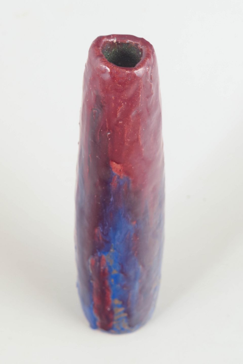 Høj og slank vase udført i stentøj med levende, flerlaget glasur i rødlige og blålige nuancer med tydelige lodrette løb. Overfladen har et dynamisk og ekspressivt præg, hvor glasurens bevægelse spiller en central rolle. Den stramme, opretstående form understreger det skulpturelle udtryk.
