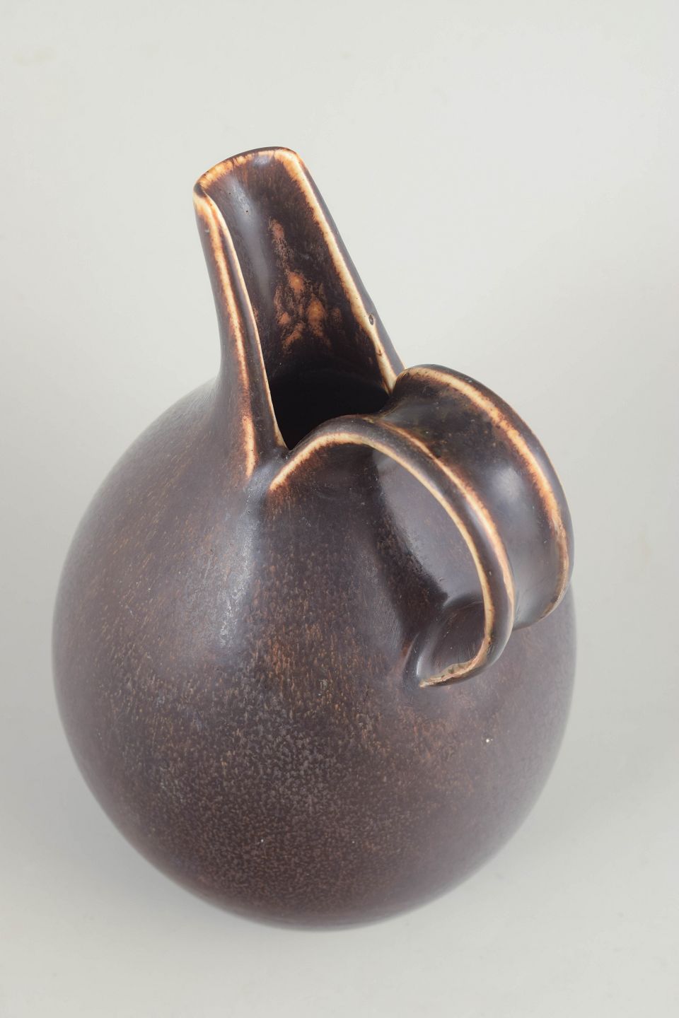 Saxbo, Danmark, stor spaltekande, midten af det 20. århundrede.Sjælden og stor spaltekande i stentøj med karakteristisk organisk, pæreformet krop, markant tud og integreret hank. Udført med Saxbos klassiske matte til let skinnende glasur i dybe brunlige toner med subtilt farvespil. Formen fremstår skulpturel og velafbalanceret og repræsenterer Saxbos mest eftertragtede udtryk.