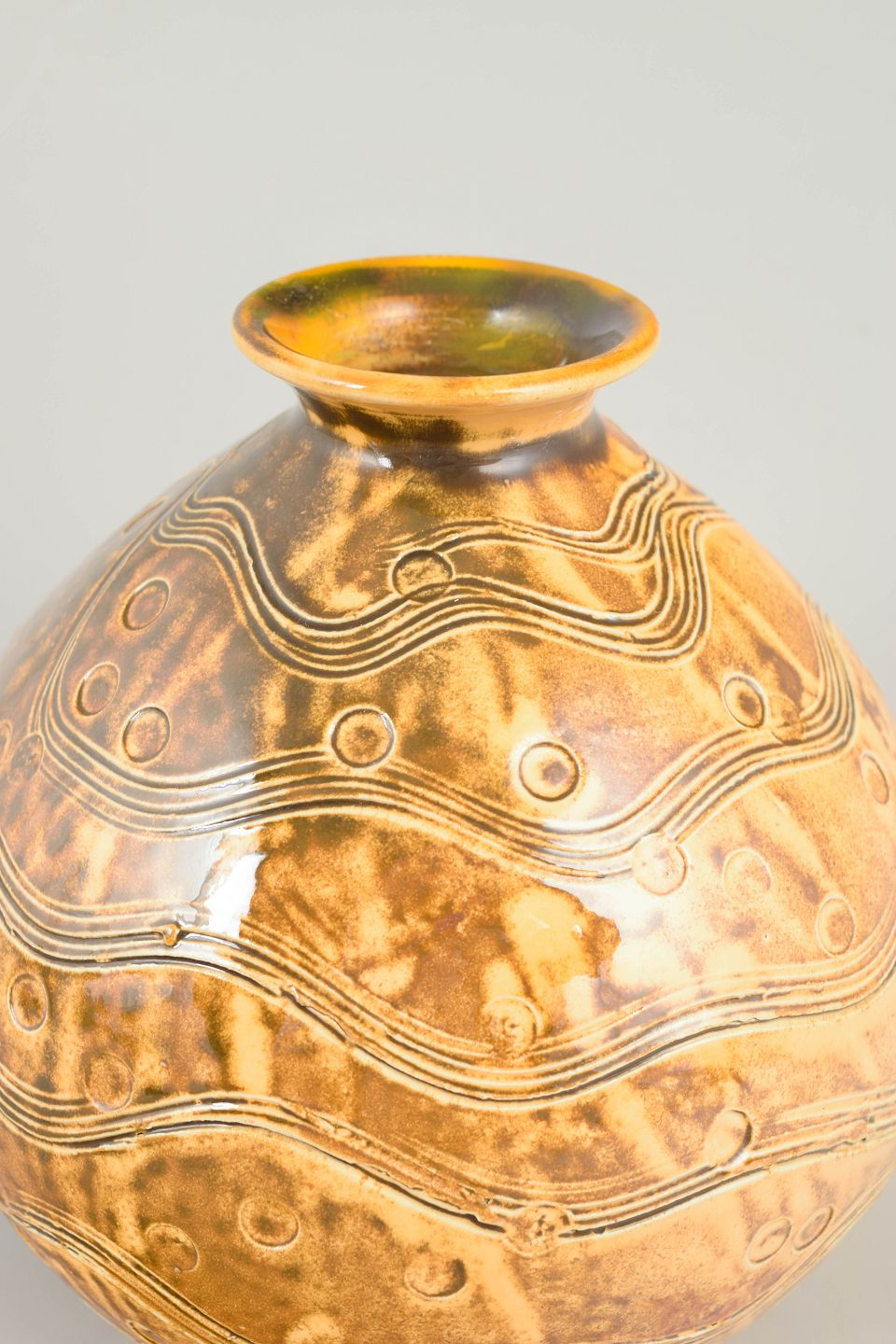 Kähler keramikvaseKugleformet keramikvase fra Kähler, udført i drejet stentøj med indridset bølgeornamentik og cirkulære detaljer. Vasen er dækket af en varm, gyldenbrun glasur med smukt spil og dybde, karakteristisk for Kählers dekorative produktion i perioden. Den bløde, afrundede form kombineret med den taktile overflade giver vasen et markant, men harmonisk udtryk.