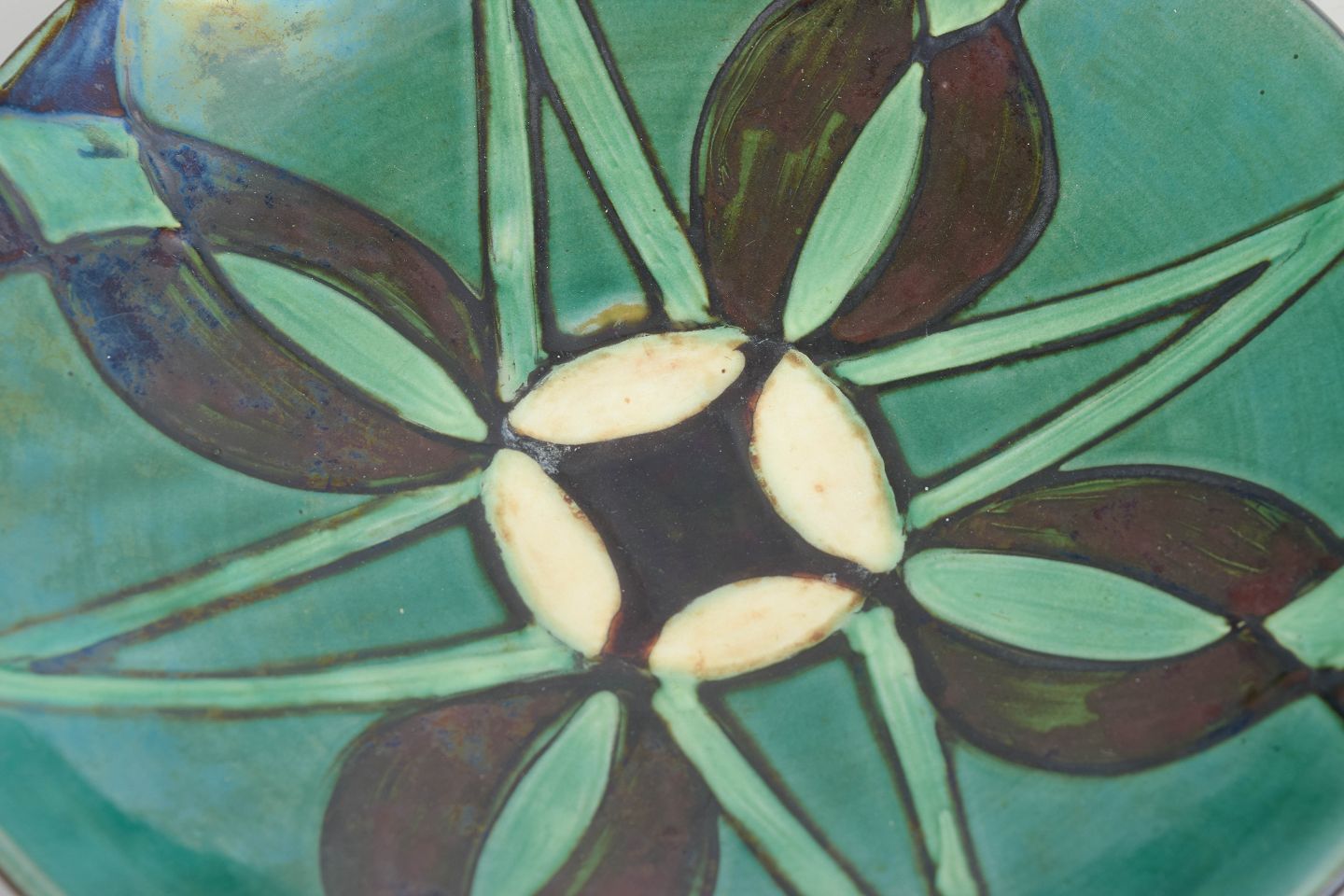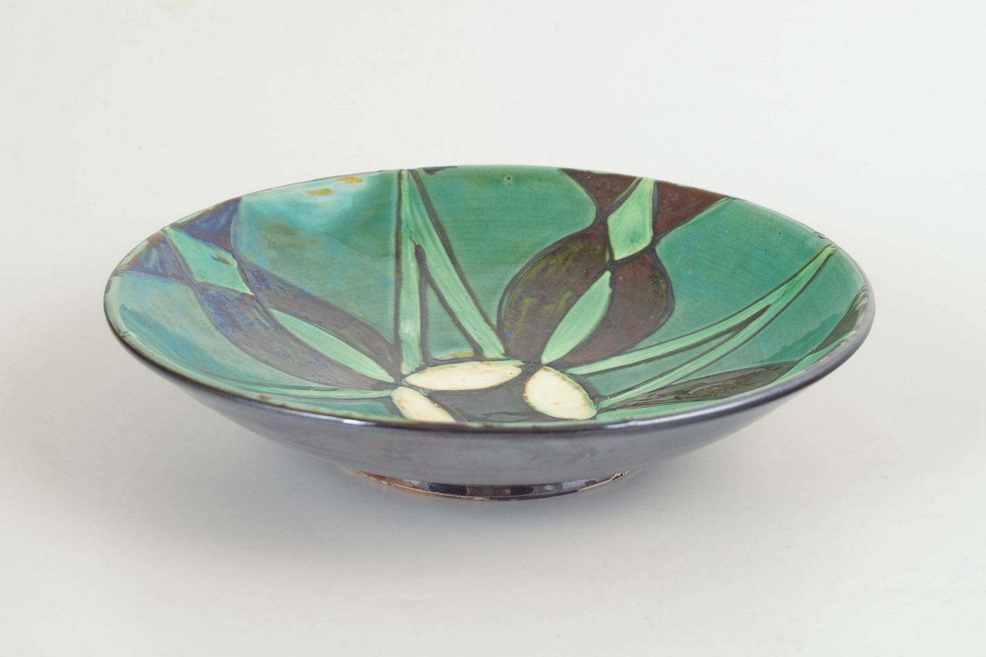 Kähler skål, 1930’erne.Håndglaseret skål i keramik med geometrisk dekoration i grønne og brune nuancer. Klassisk Art Deco-udtryk med tydelig værkstedsmæssig karakter, udført med levende glasur og håndmalede detaljer.