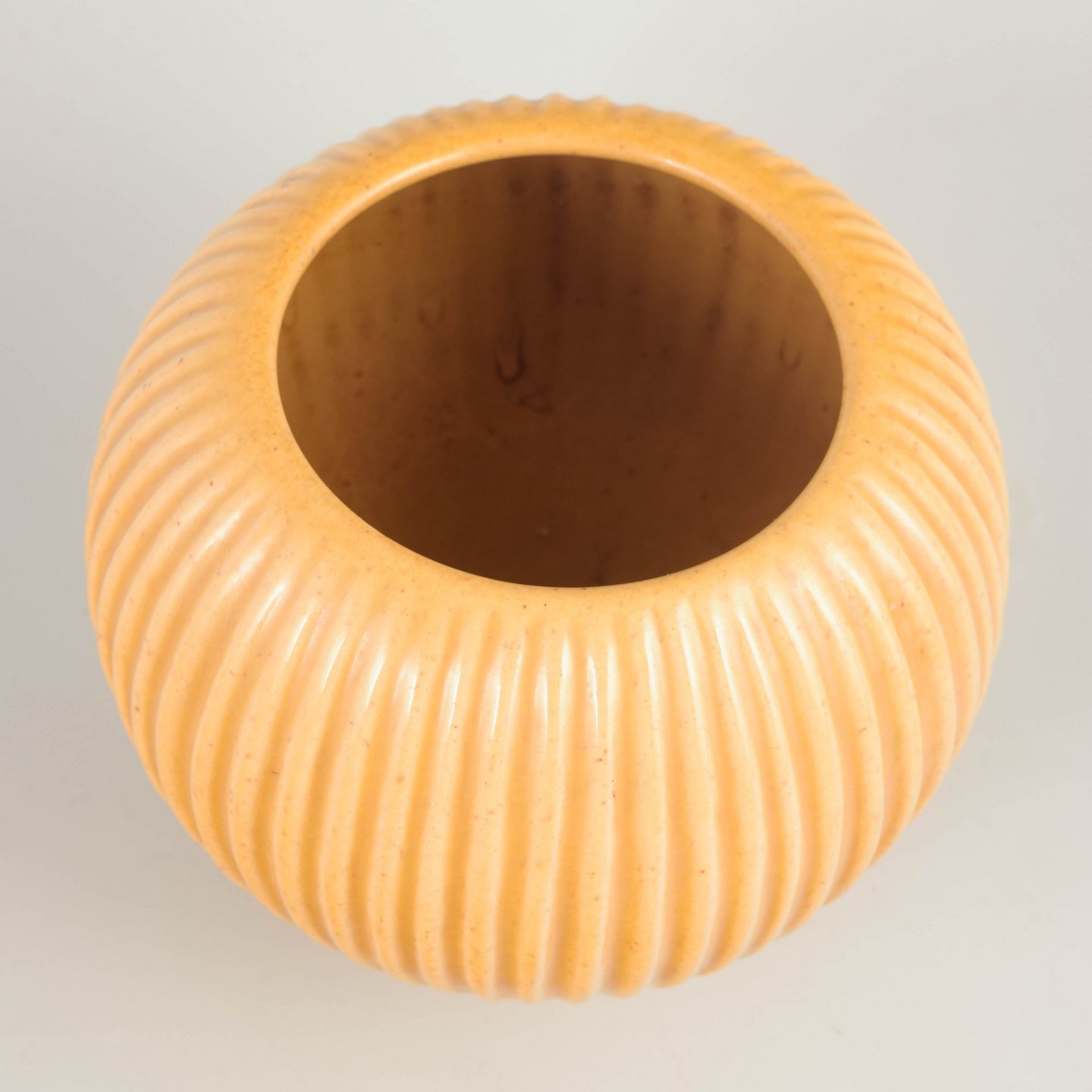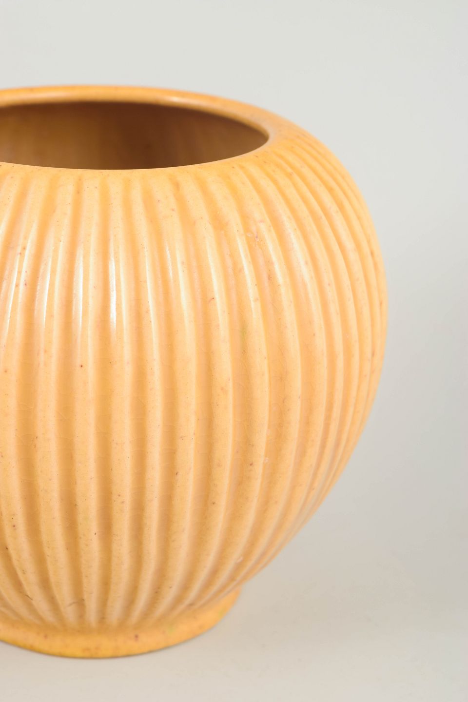 Skandinavisk studiokeramiker vase, 1940’erne, Art Deco.Skulpturel vase i drejet stentøj med markant lodret riflet korpus og afrundet, balusterformet silhuet. Den matte okker- til sandfarvede glasur understreger formens stringente, geometriske udtryk, karakteristisk for nordisk Art Deco og tidlig modernisme. Modellen er markeret 4616-3.