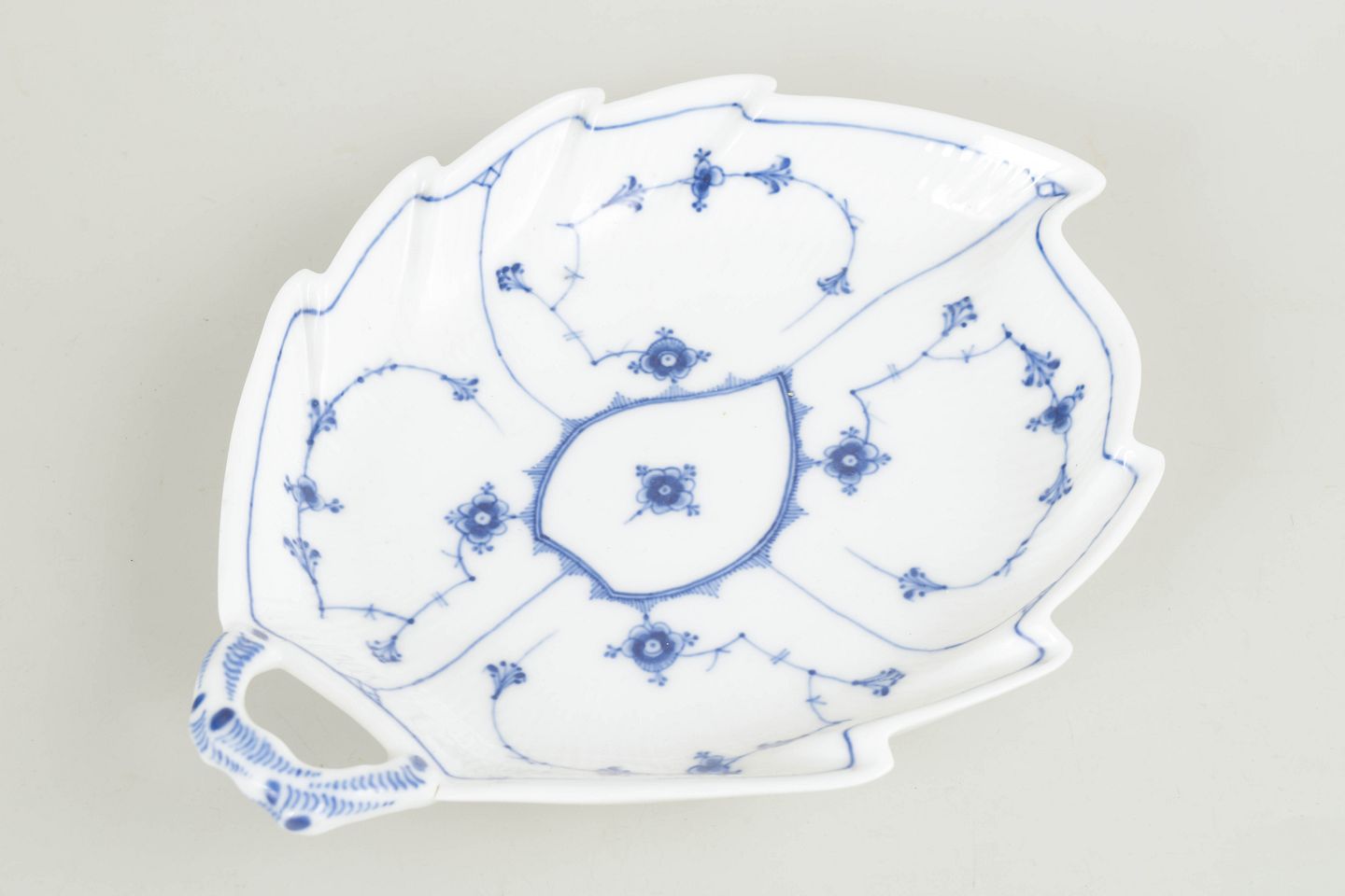 Musselmalet riflet er Royal Copenhagens ældste stel, introduceret i 1775, og har siden været et grundelement i dansk porcelænshistorie. I 1800-tallet blev stellet produceret i et bredt udvalg af specialformer, herunder bladformede fade, der afspejler periodens sans for naturinspirerede former og raffineret bordkultur. Disse tidlige dele er i dag særligt eftertragtede blandt samlere.