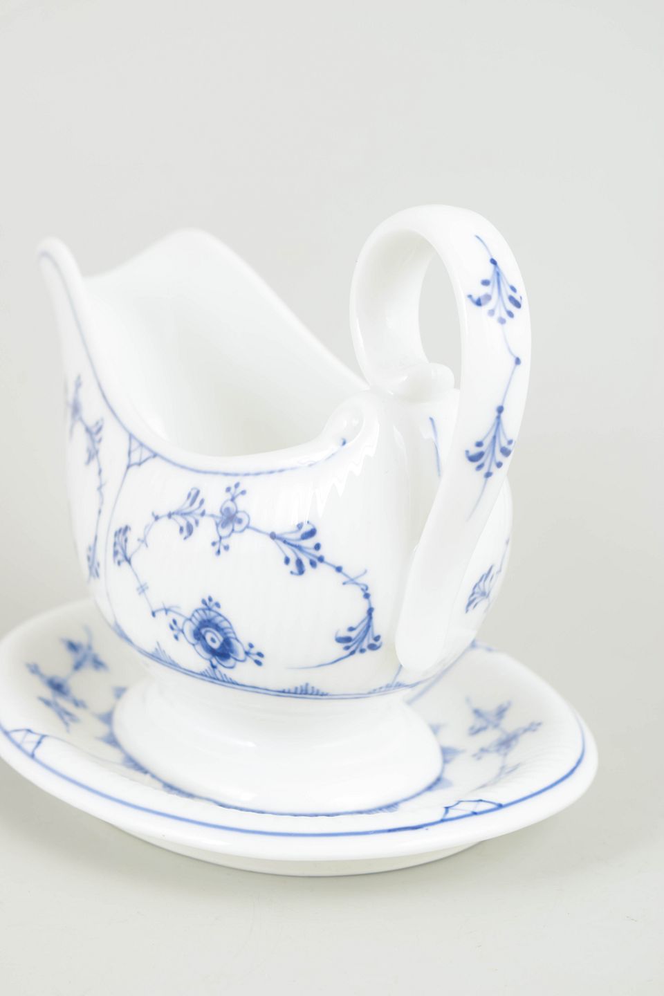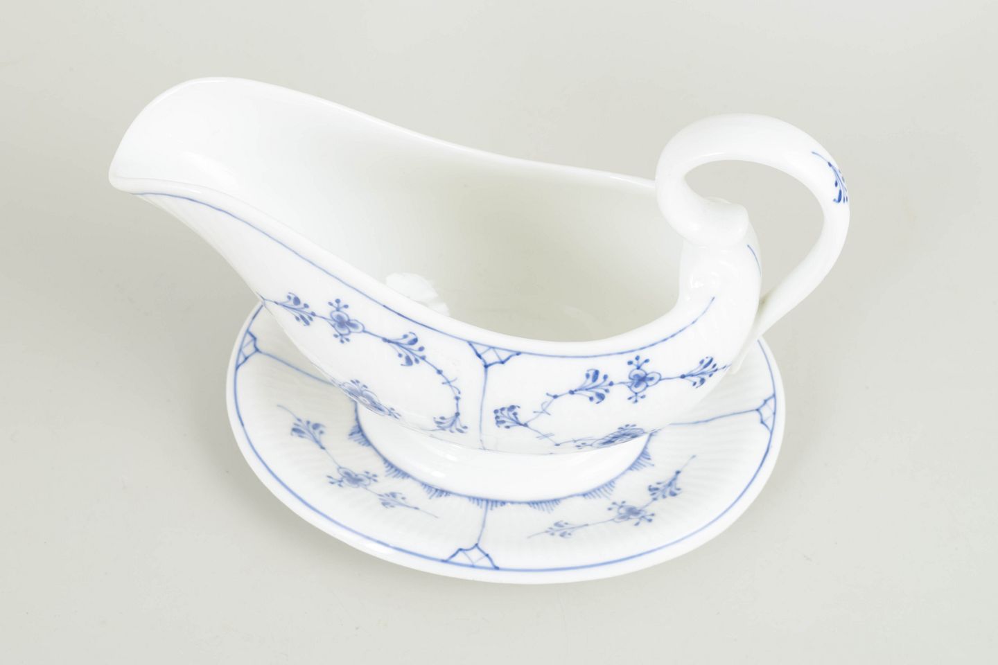 Elegant saucebåd i det klassiske stel Musselmalet riflet, dekoreret med håndmalet koboltblå underglasur på riflede porcelænsformer. Formen er harmonisk og velafbalanceret og beregnet til det formelle middagsbord i begyndelsen af 1900-tallet. Model 1/200, med tilhørende originalt underfad.
