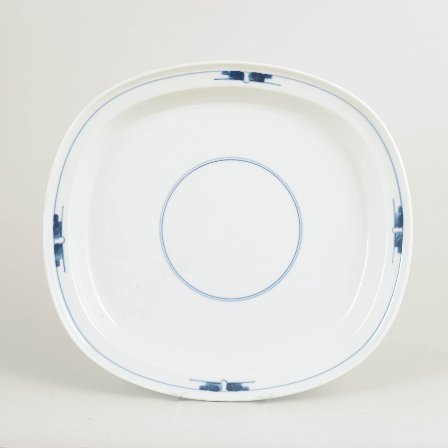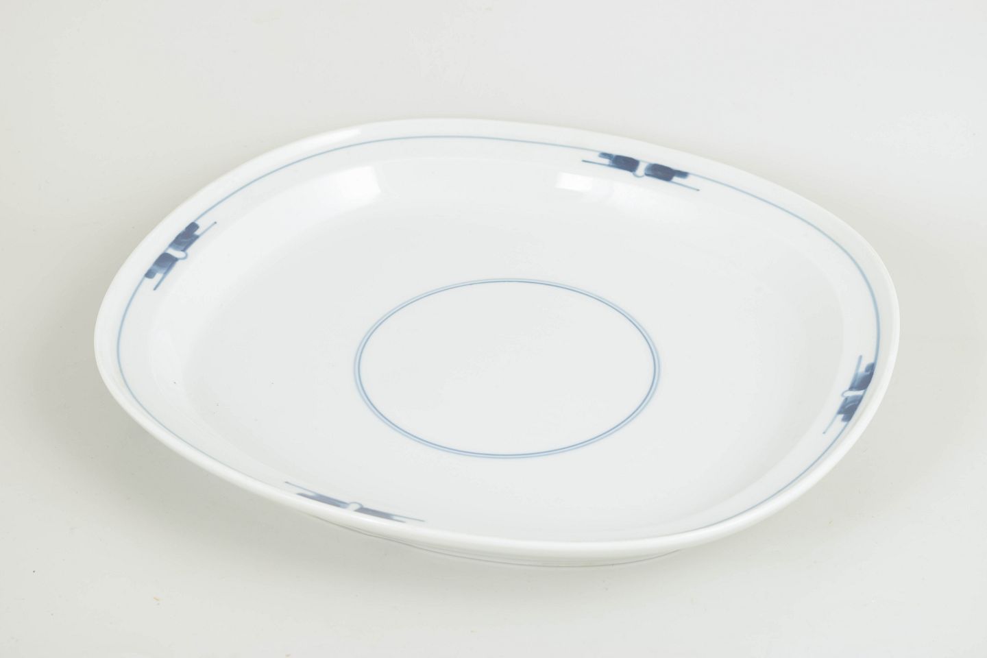 Stort serveringsfad i Gemina-stellet, udført i hvidt porcelæn med diskret, grafisk dekoration i blå underglasur. Den stramme, næsten arkitektoniske form understreger stellets modernistiske udtryk og gør fadet velegnet til servering og præsentation.