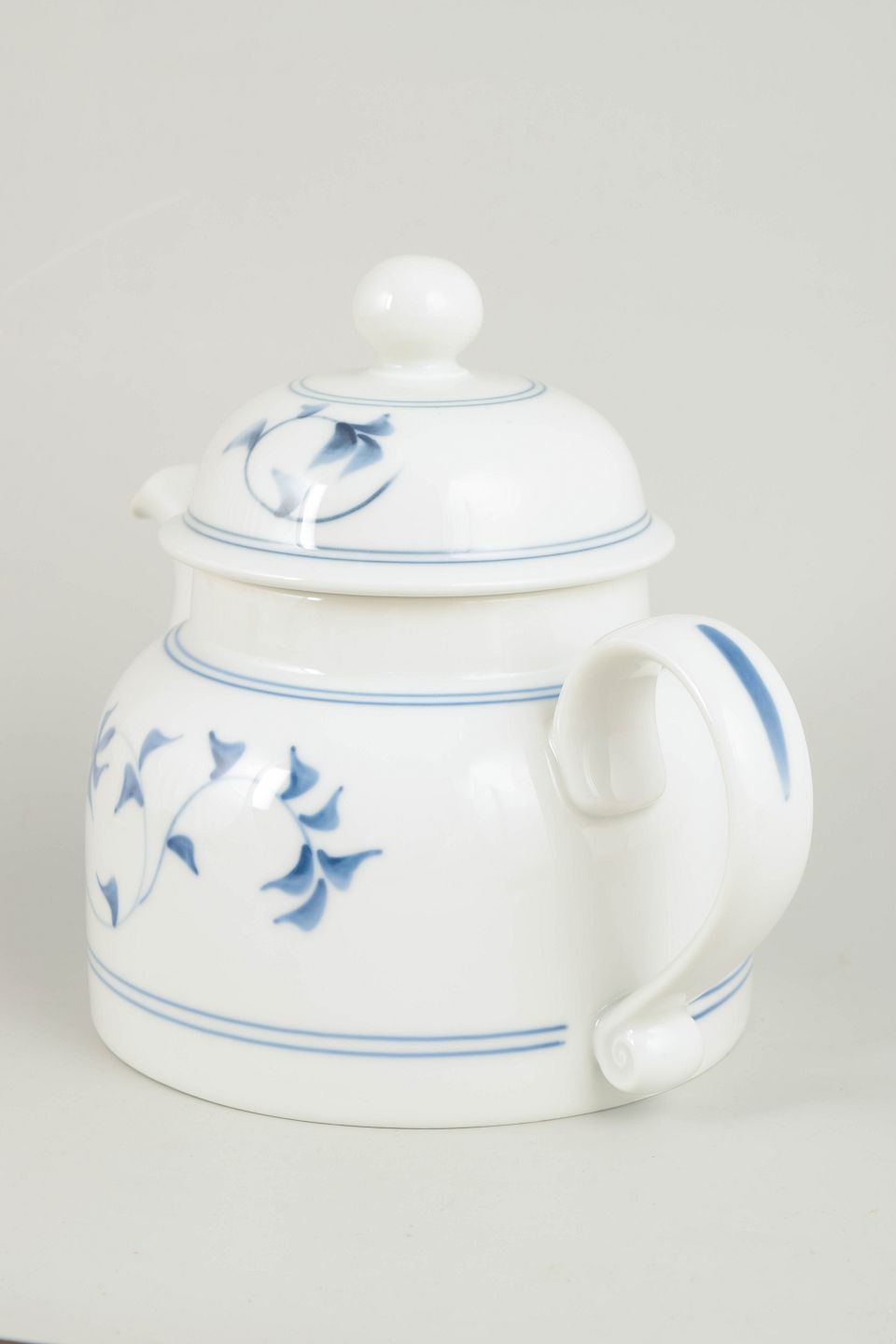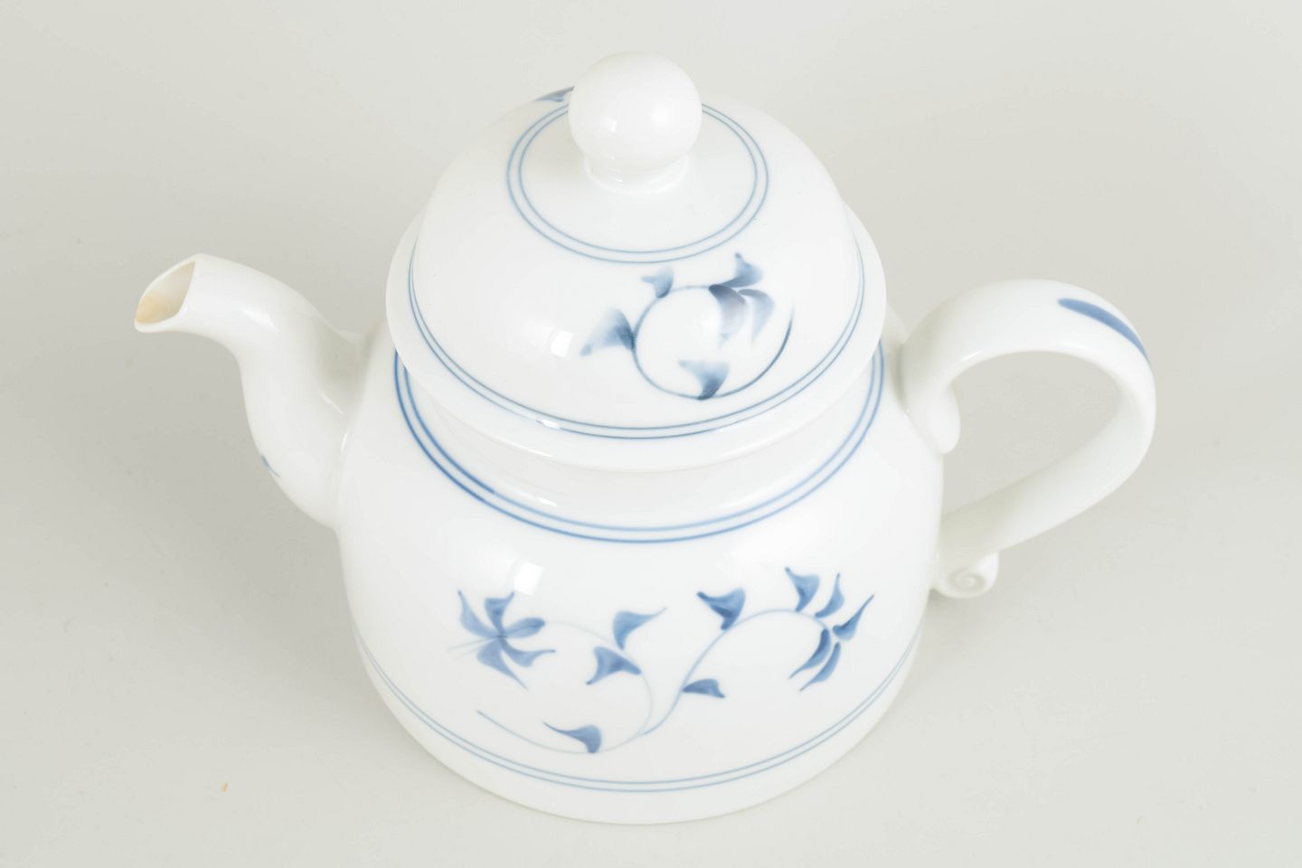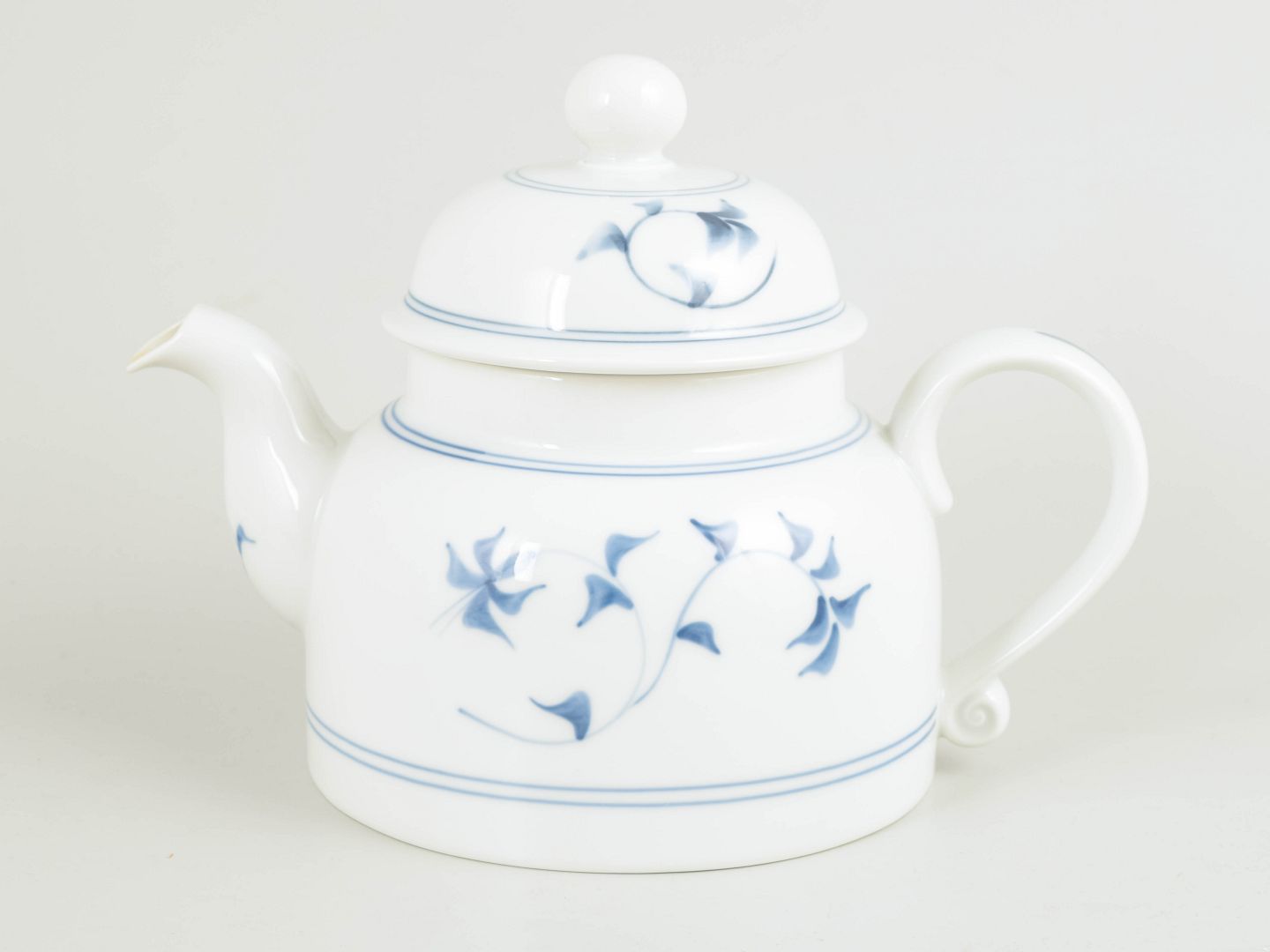 Royal Copenhagen Noblesse tekande, 1980’erne.Elegant tekande i porcelæn dekoreret med det karakteristiske Noblesse-mønster i blå underglasur. Klassisk, harmonisk form med låg og svungen tud, typisk for Royal Copenhagens formsprog i midten af det 20. århundrede.