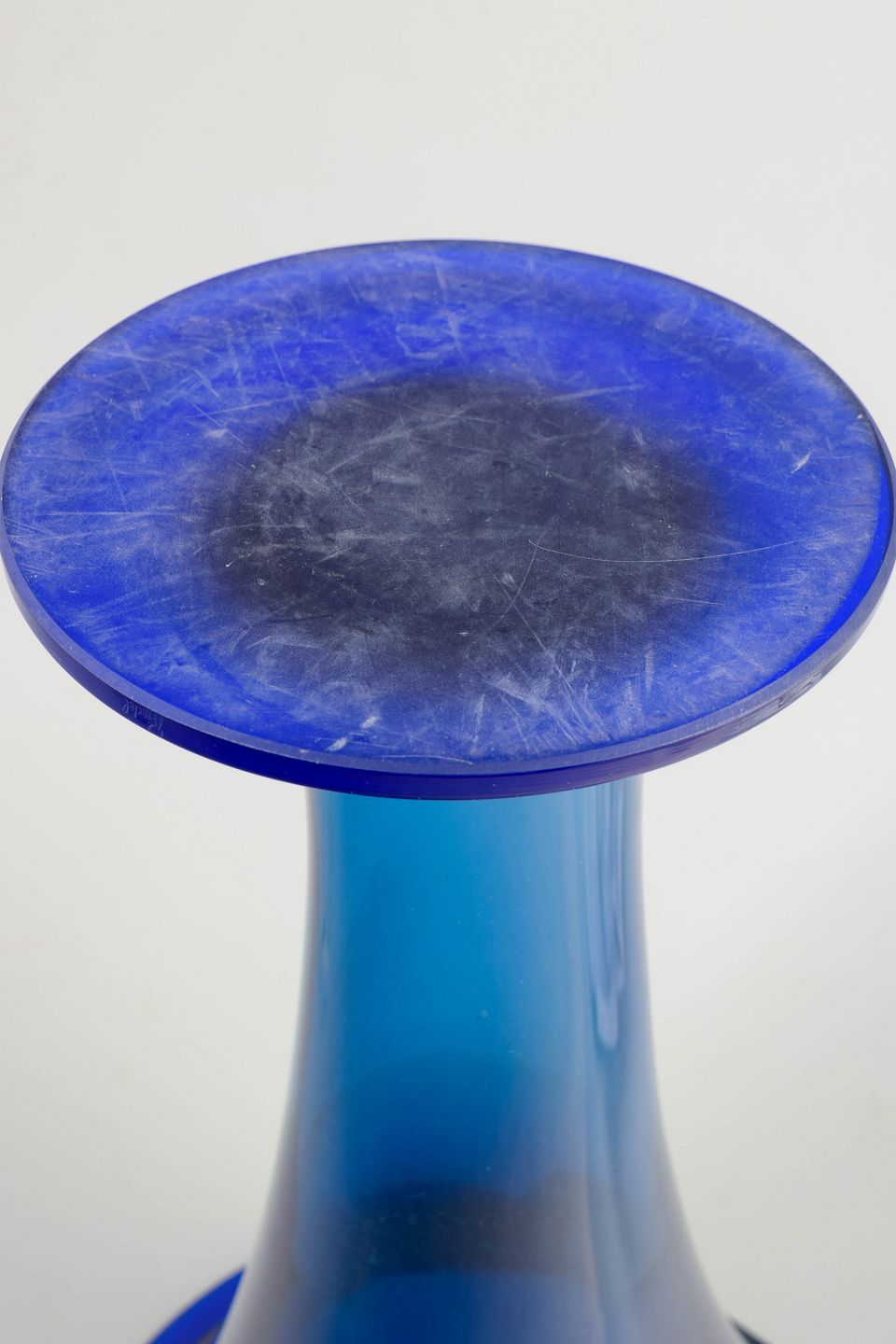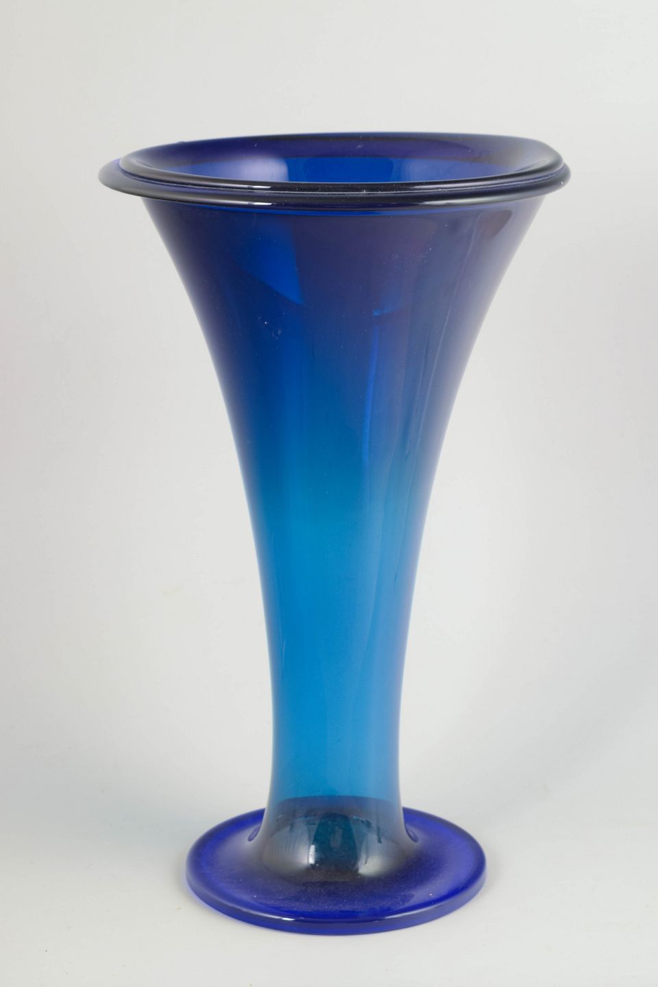 Monumental trompetformet vase i mundblæst, tungt krystalglas med dyb blå farvegraduering. En markant Art Deco-model med kraftig fod, slank stamme og bred, udadbøjet munding.