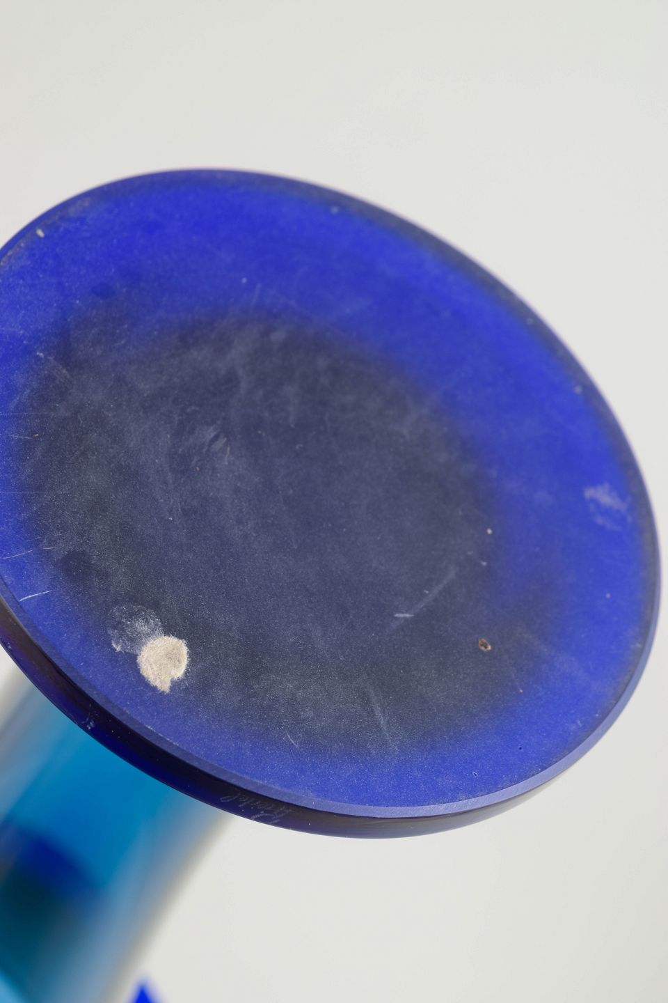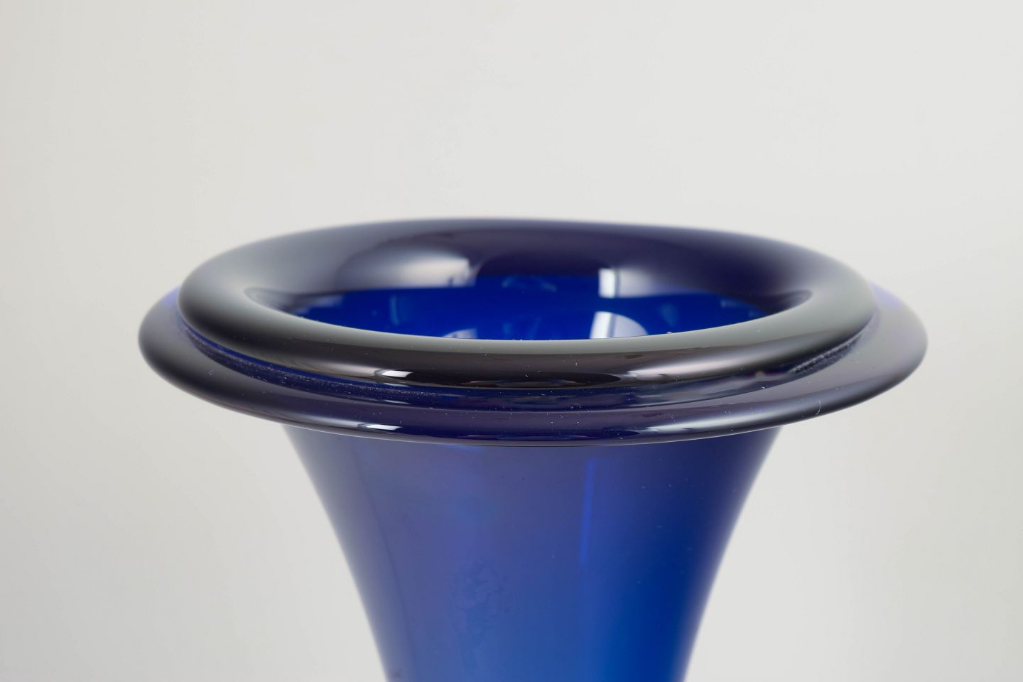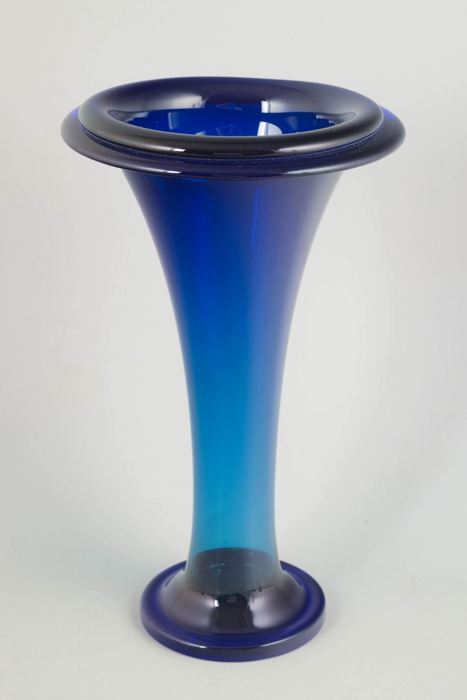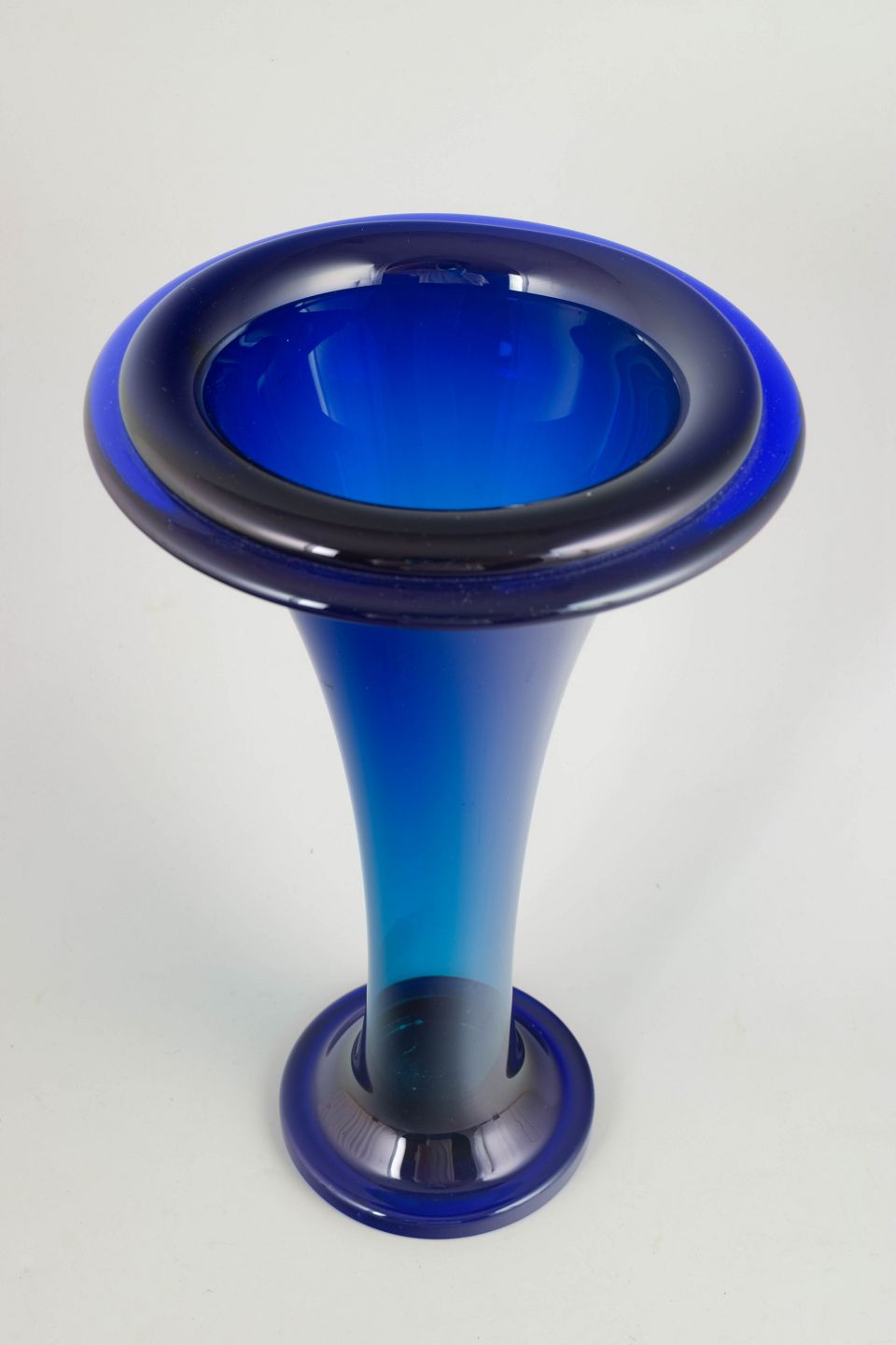 Elegant trompetformet vase i mundblæst, tungt krystalglas med dyb blå farvegraduering. Et markant eksempel på tjekkisk Art Deco-glas med kraftig fod og bred, udadbøjet munding.