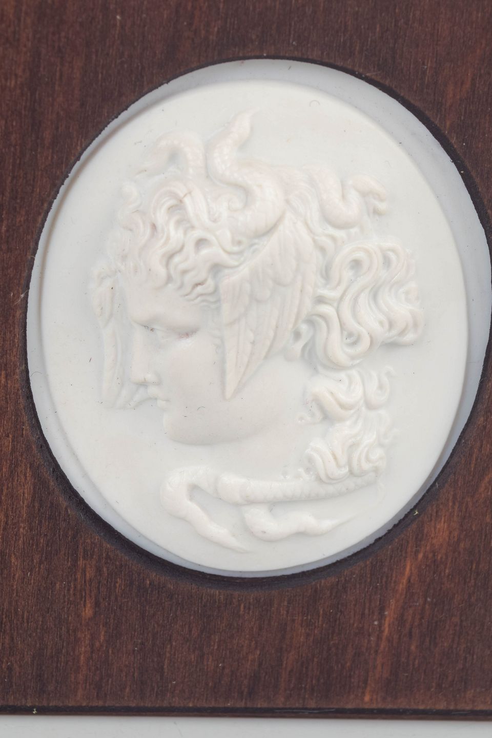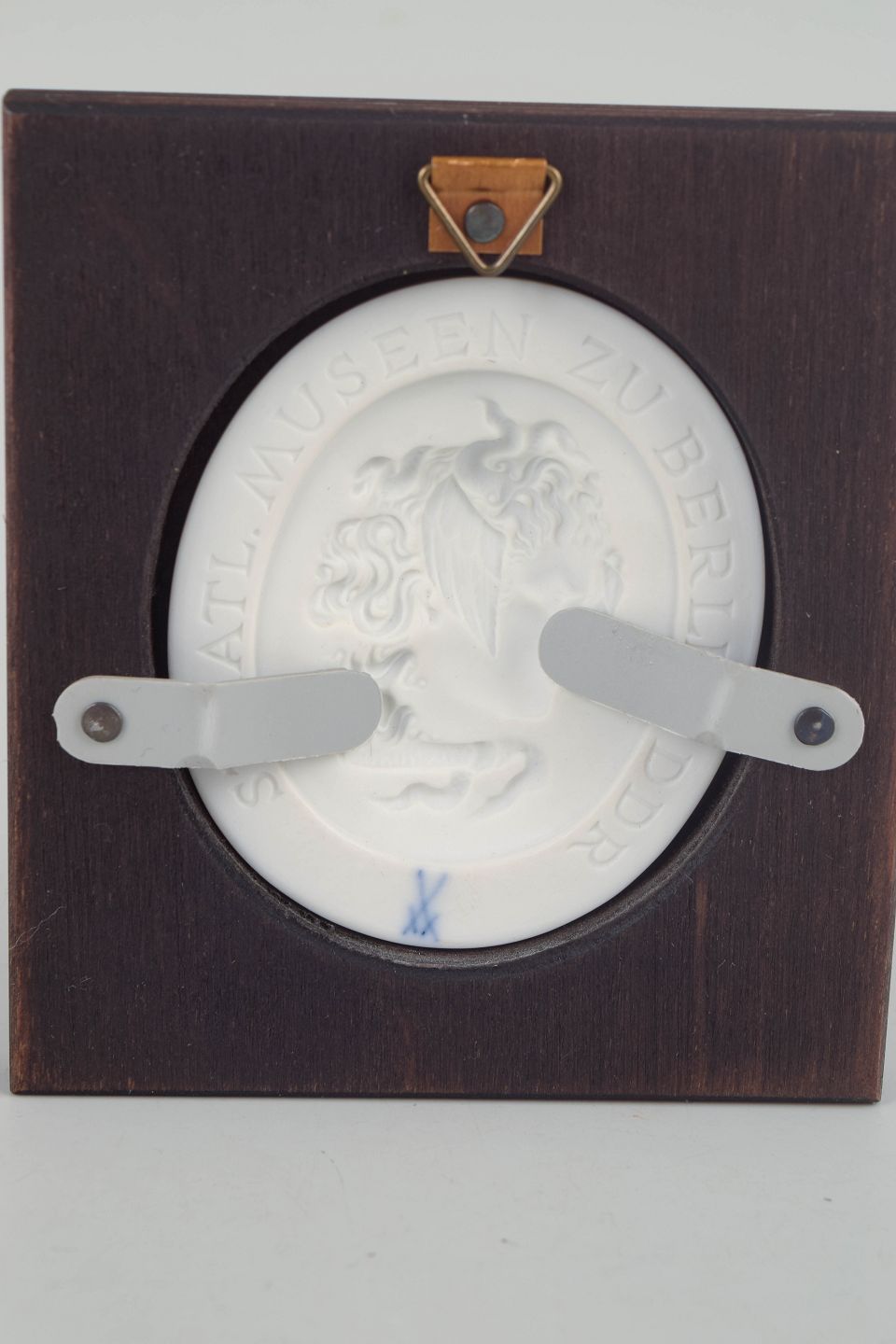 Meissen Biscuit plakette, ca. 1970’erne.Lille reliefplakette i hvid biscuit porcelæn med klassisk profilportræt, monteret i kvadratisk træramme med ovalt udsnit. Den matte biscuit overflade giver motivet et fint, skulpturelt præg og fremhæver den bløde modellering af ansigt og hår.