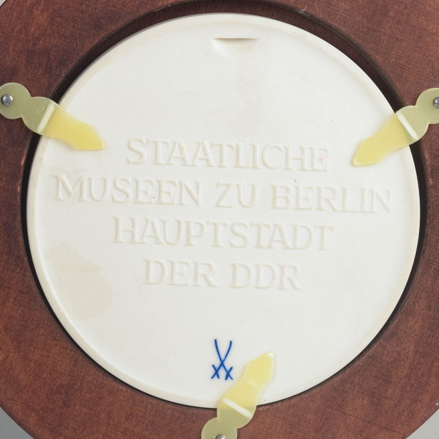 Meissen Biscuit plakette, ca. 1970’erne.Rund reliefplakette i hvid biscuit porcelæn med klassisk profilportræt og cirkulær inskription, monteret i bred, rund træramme. Udført som en medalje lignende, neoklassisk komposition, hvor den matte biscuit overflade fremhæver portrættets fine modellering og historiske karakter.