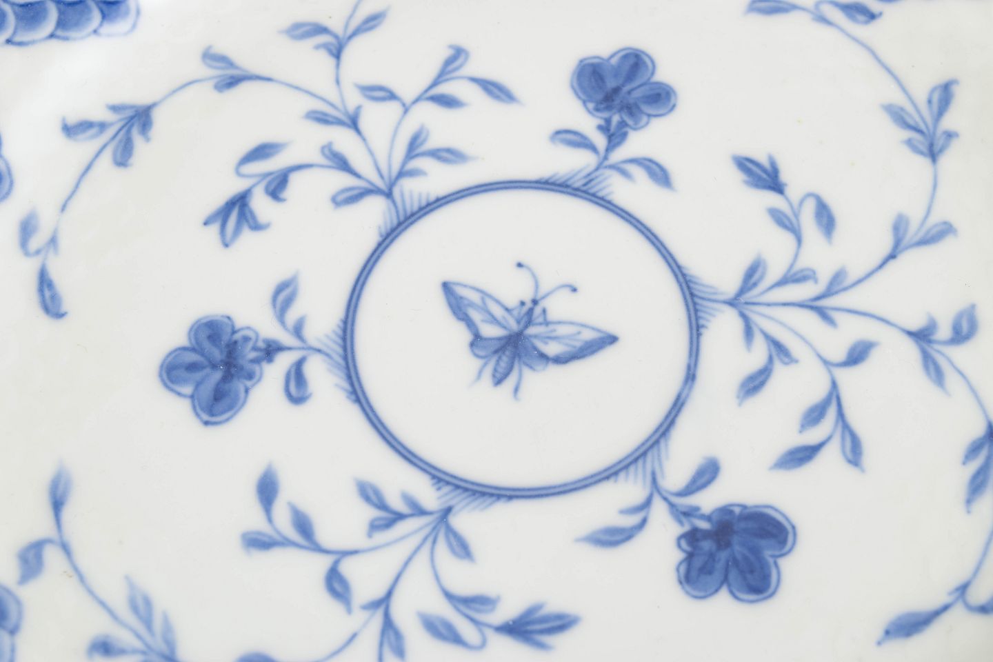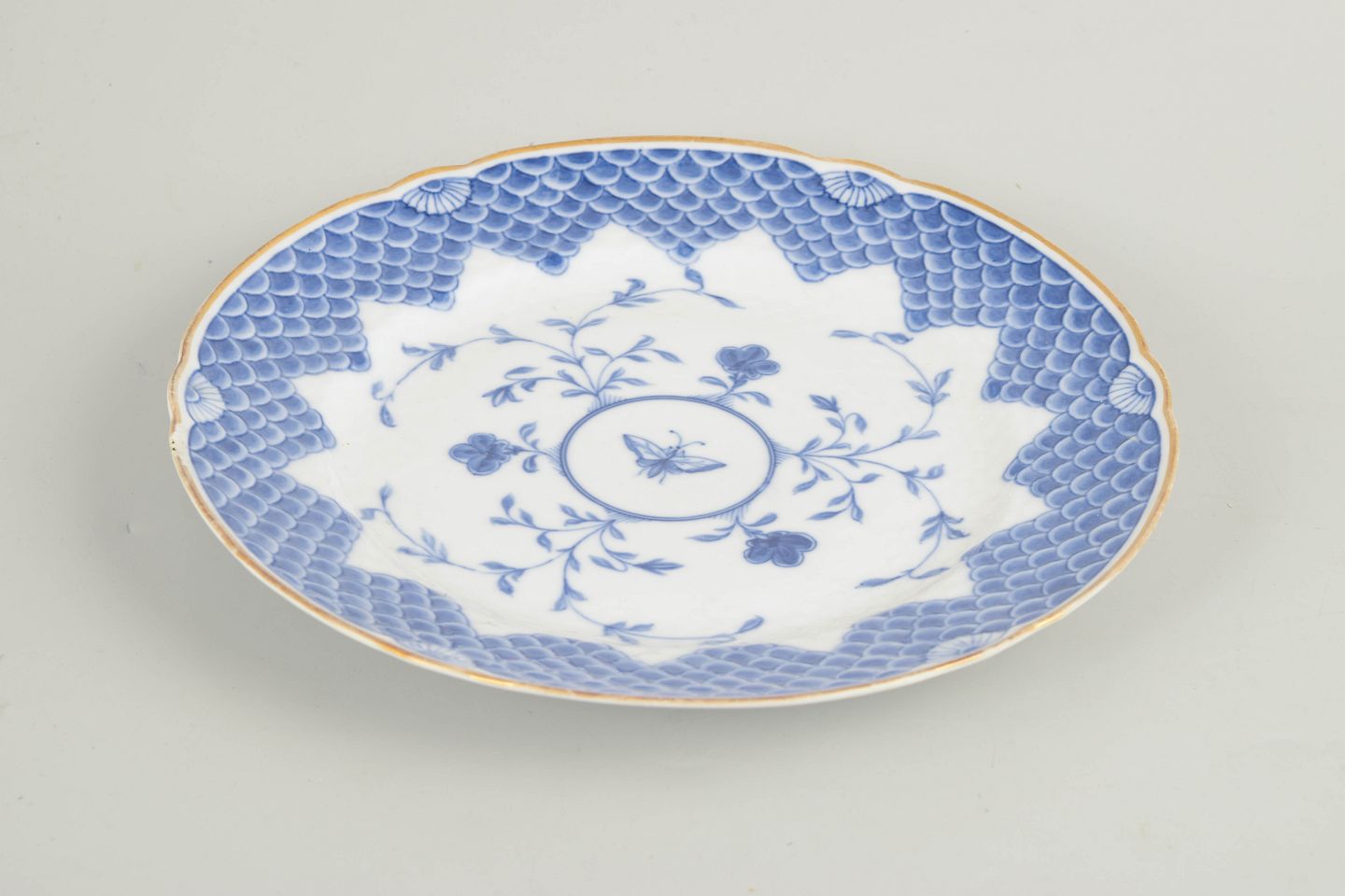 Bing & Grøndahl sommerfugl middagstallerken med guldkant, 1880’erne.Antik rund porcelænstallerken dekoreret med blå underglasur i det klassiske Sommerfugl-mønster. Dekorationen er centreret omkring en medaljon med sommerfugl og florale ranker, omgivet af den karakteristiske skællede rand og afsluttet med håndpålagt guldkant. En sjælden og tidlig tallerken fra Bing & Grøndahls produktion i slutningen af det 19. århundrede.