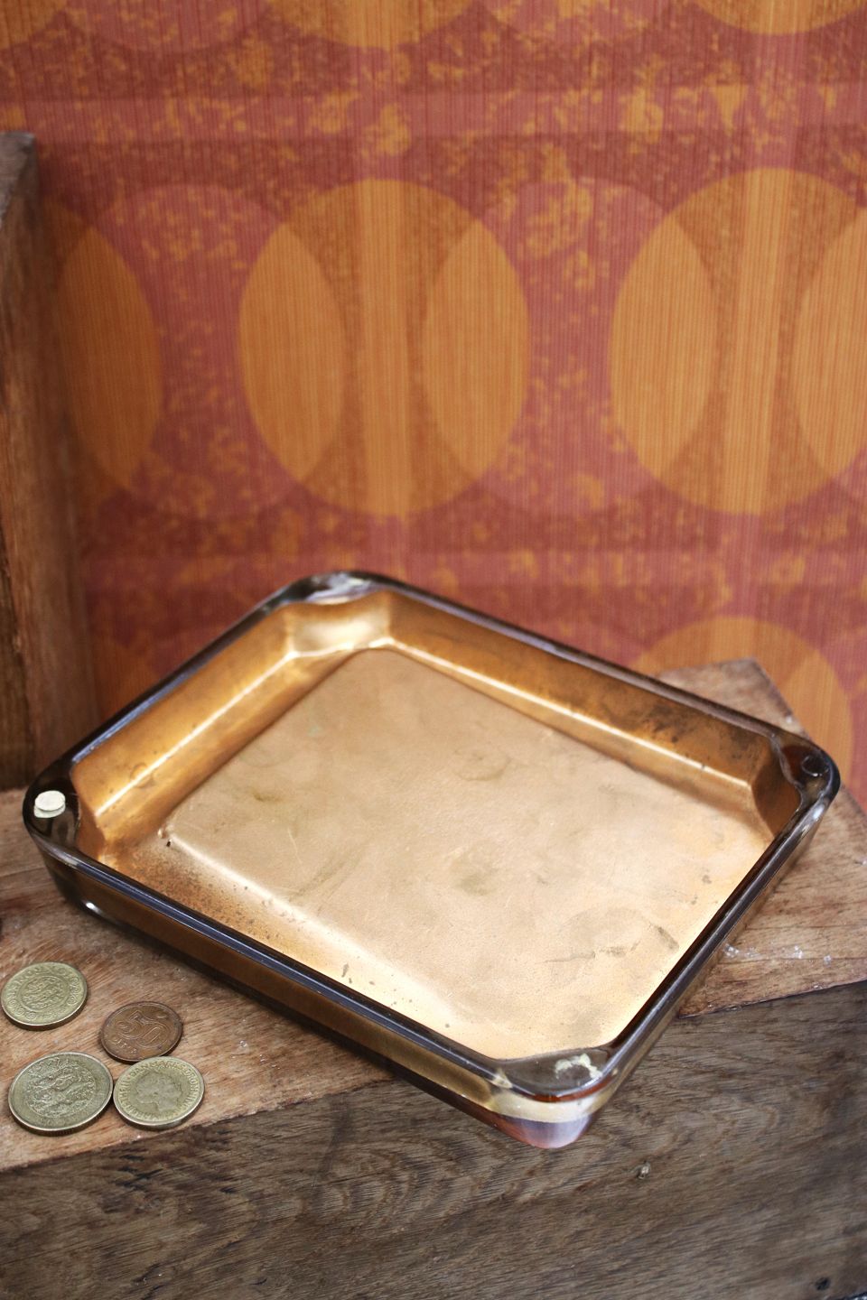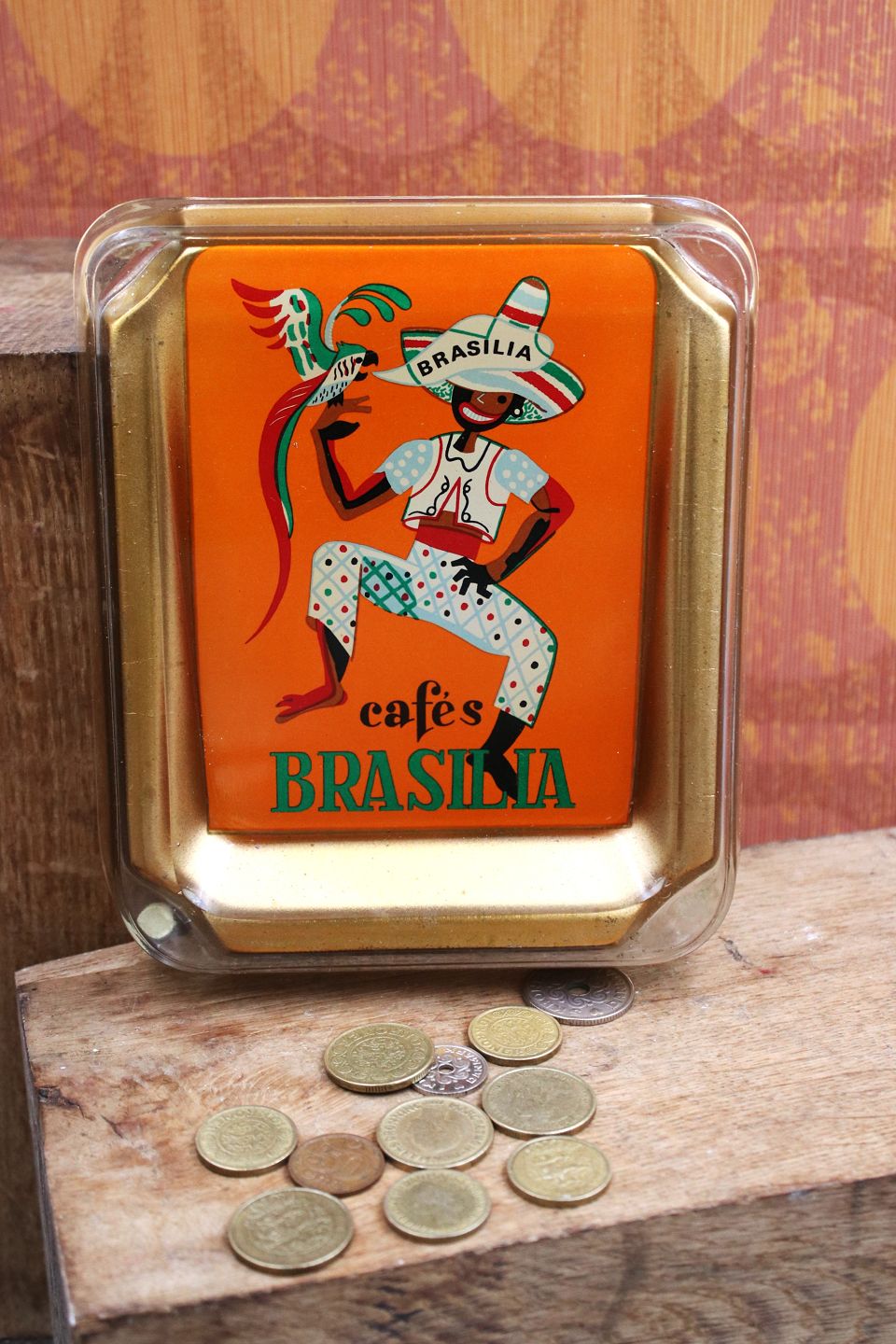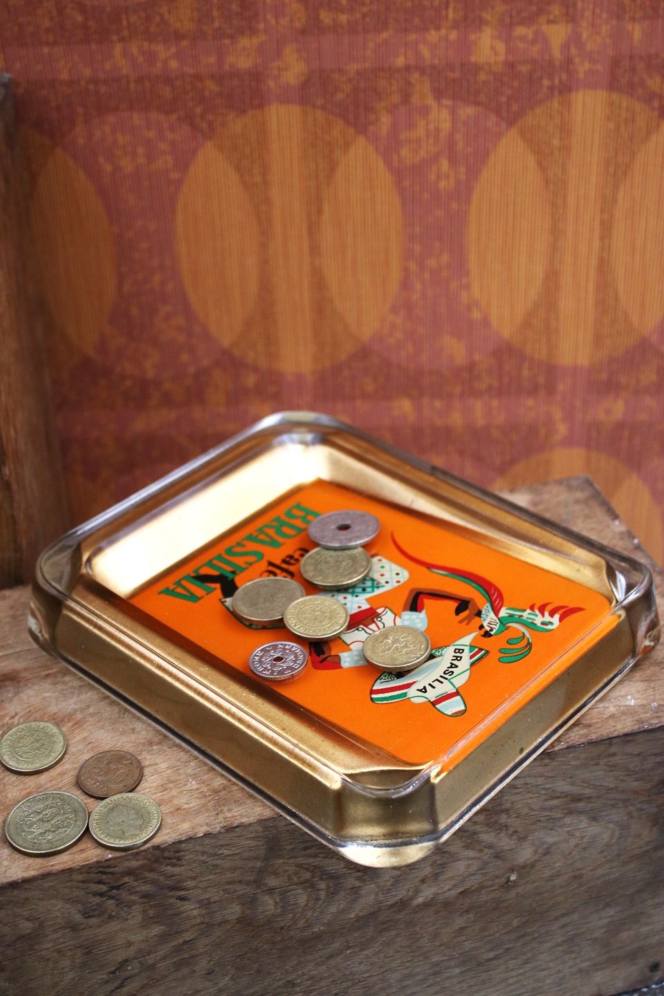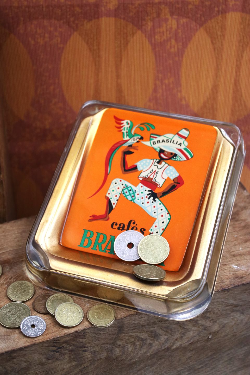 Gammelt penge fad fra kaffebar i 50/60erne i tykt glas med motiv af brasiliansk mand med papegøje. H: 3cm. 19x15,5cm.Pengefadet har stået på disken i caféen til at lægge betalingen på.