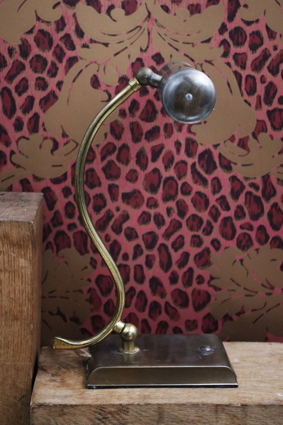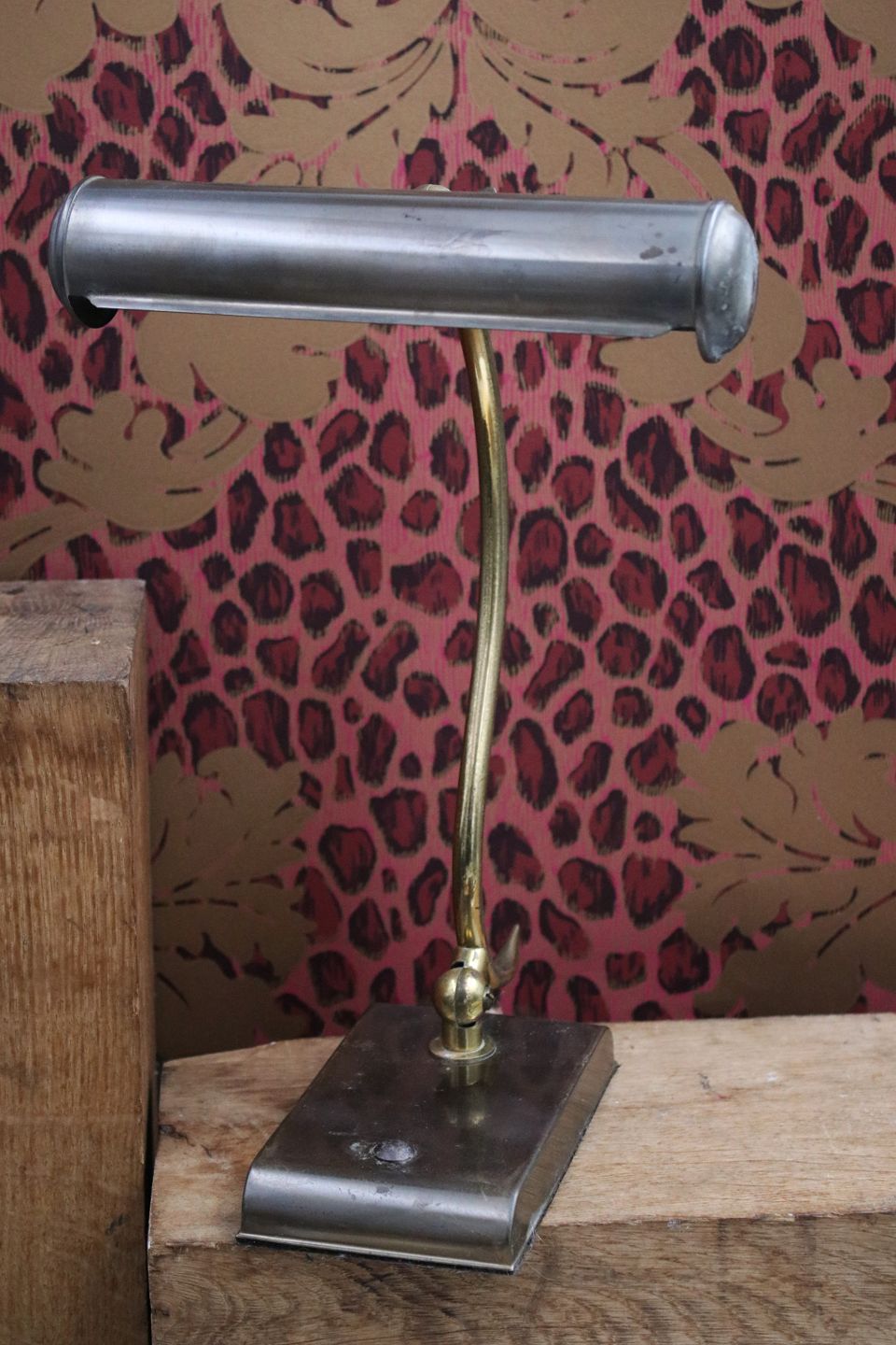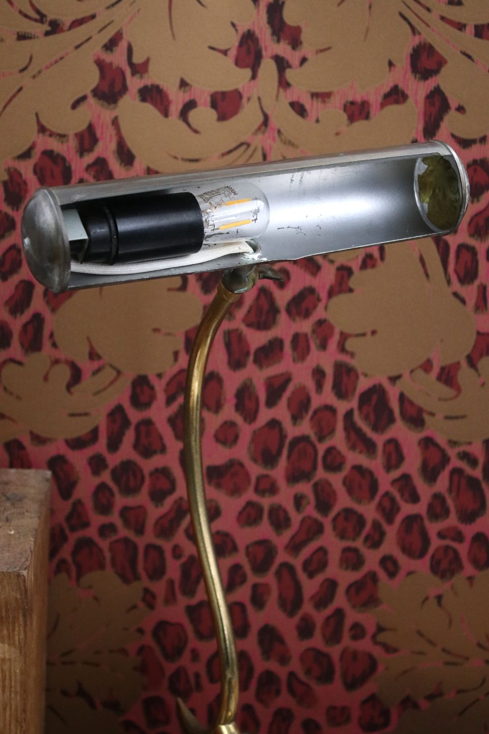 Gammel skrivebordslampe i patineret messing.H: 31cm. Skærm Dia.: L: 20,5cm. Dia.: 4,5cm.