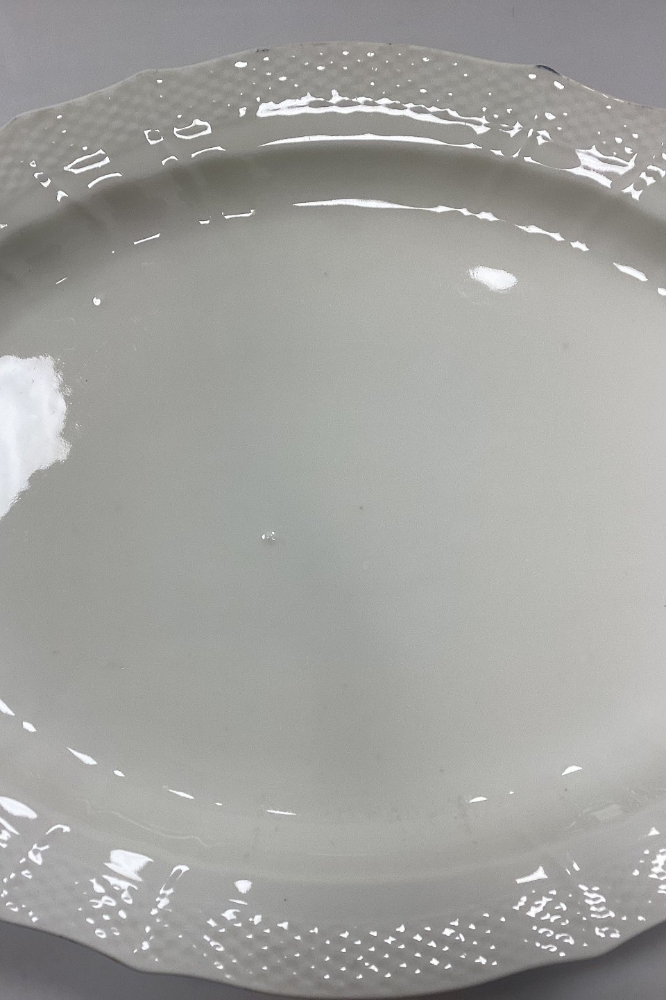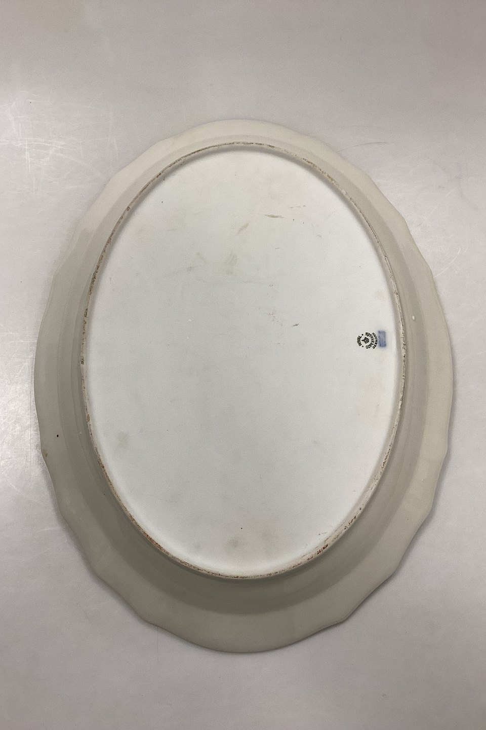Royal Copenhagen Josephine Creme Ovalt Fad No. 1558. Måler 45 cm x 34,5 cm / 17,71 in. x 13,58 in. I fin stand, dog med glasur - og brændingsfejl, se foto.