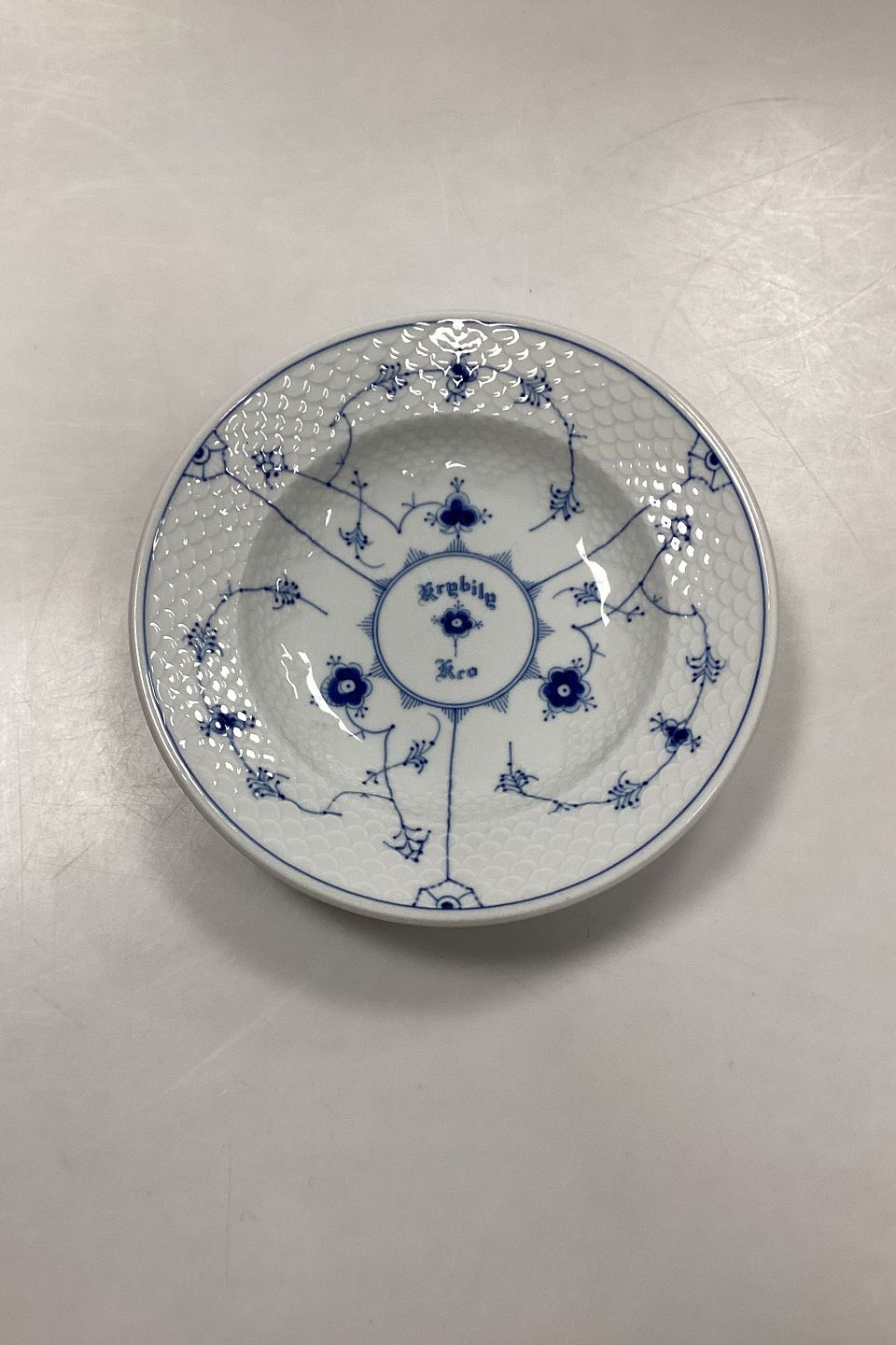 Bing og Grøndahl Blåmalet Musselmalet Hotel med Logo Lille Dyb Tallerken No. 710/1006. Logo fra Kryb i Ly Kro. Måler 21,7 cm / 8.54 in.