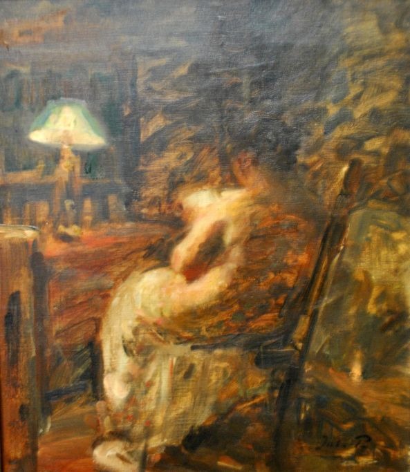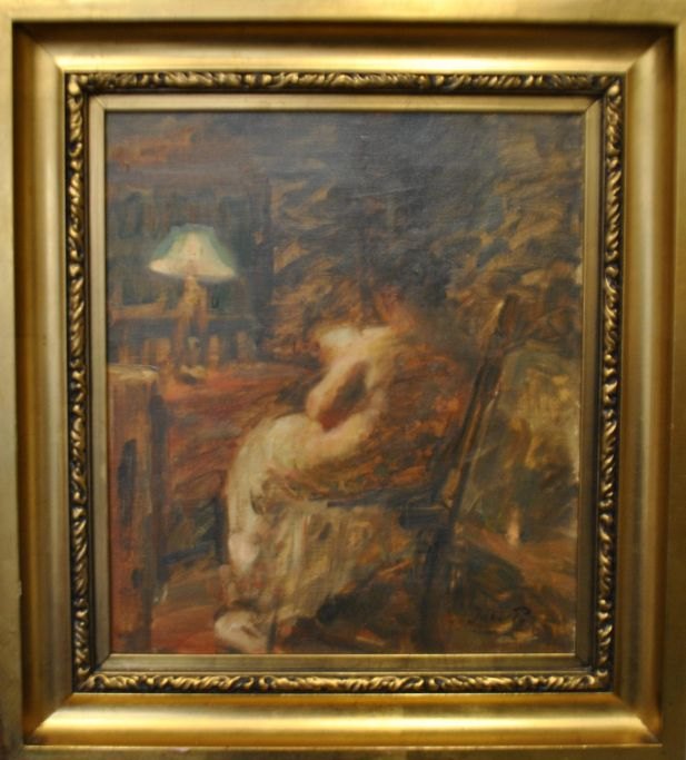 Paulsen, Julius (1860–1940) Dänemark: Lampenlicht, Interieur. Öl auf Leinwand. Signiert. 38 x 33 cm.Gerahmt: 54 x 45 cm. Gerahmt in einem Kleis-Rahmen mit Eckkeilen.
