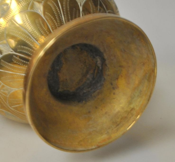 Indische Messingvase mit Henkel, um 1950. Mit gravierten Verzierungen eines sitzenden Prinzen und Blumen. Höhe: 21 cm.Bestellnummer: 28720