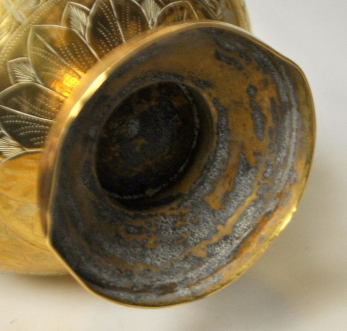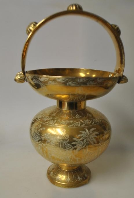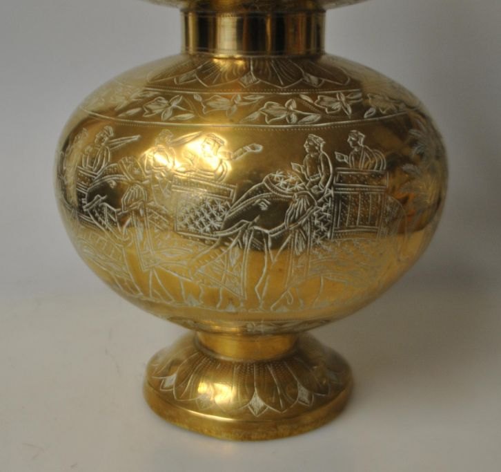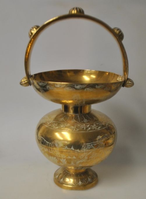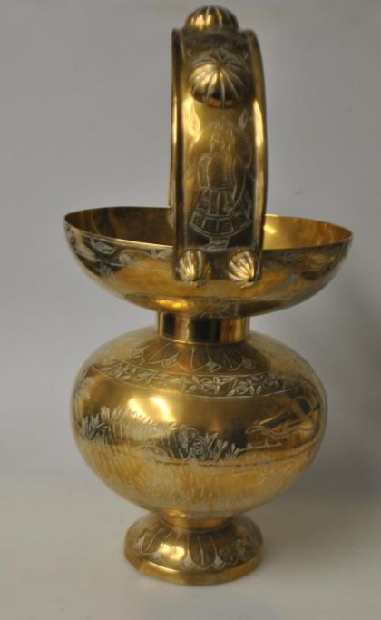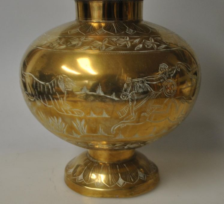 Große indische Messingvase mit Henkel, ca. 1950. Mit gravierten Darstellungen einer Elefantenjagd auf einen Tiger. An der Seite sind vier Tiger abgebildet. Außerdem sind florale Motive eingraviert. 32 cm hoch, 21 cm breit.Bestellnummer: 28721