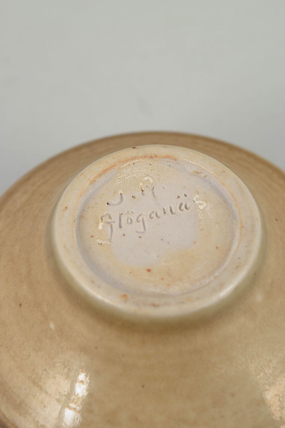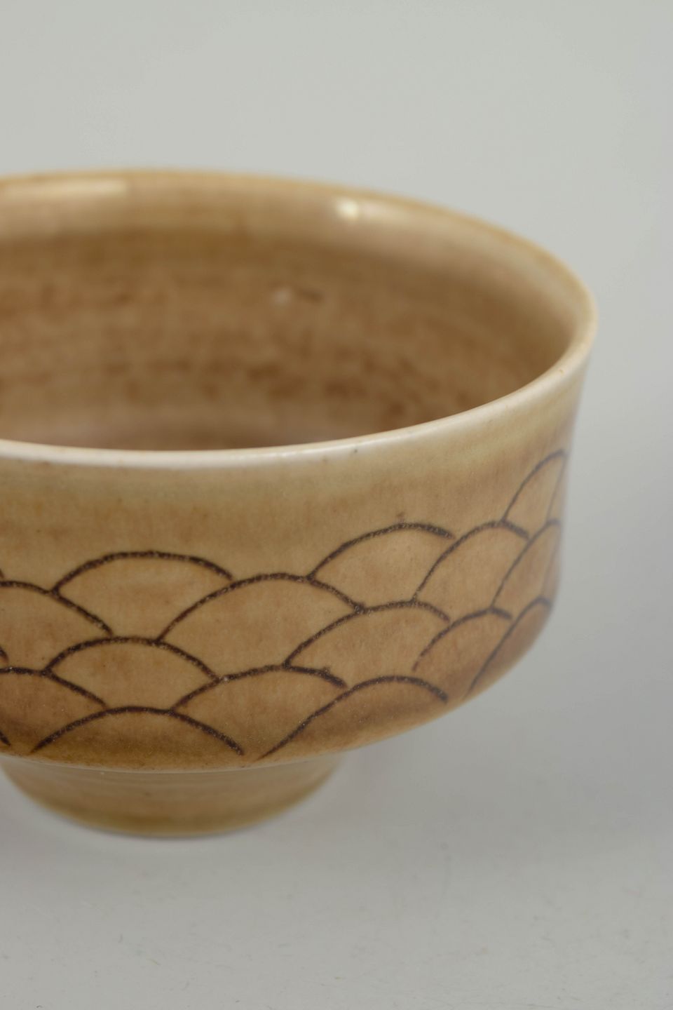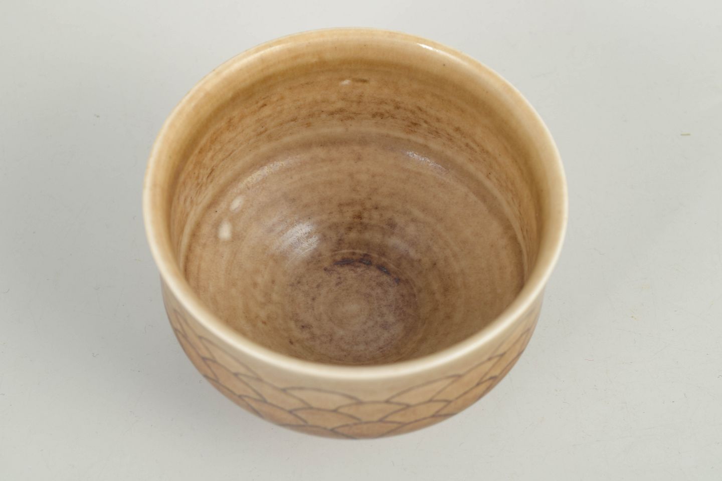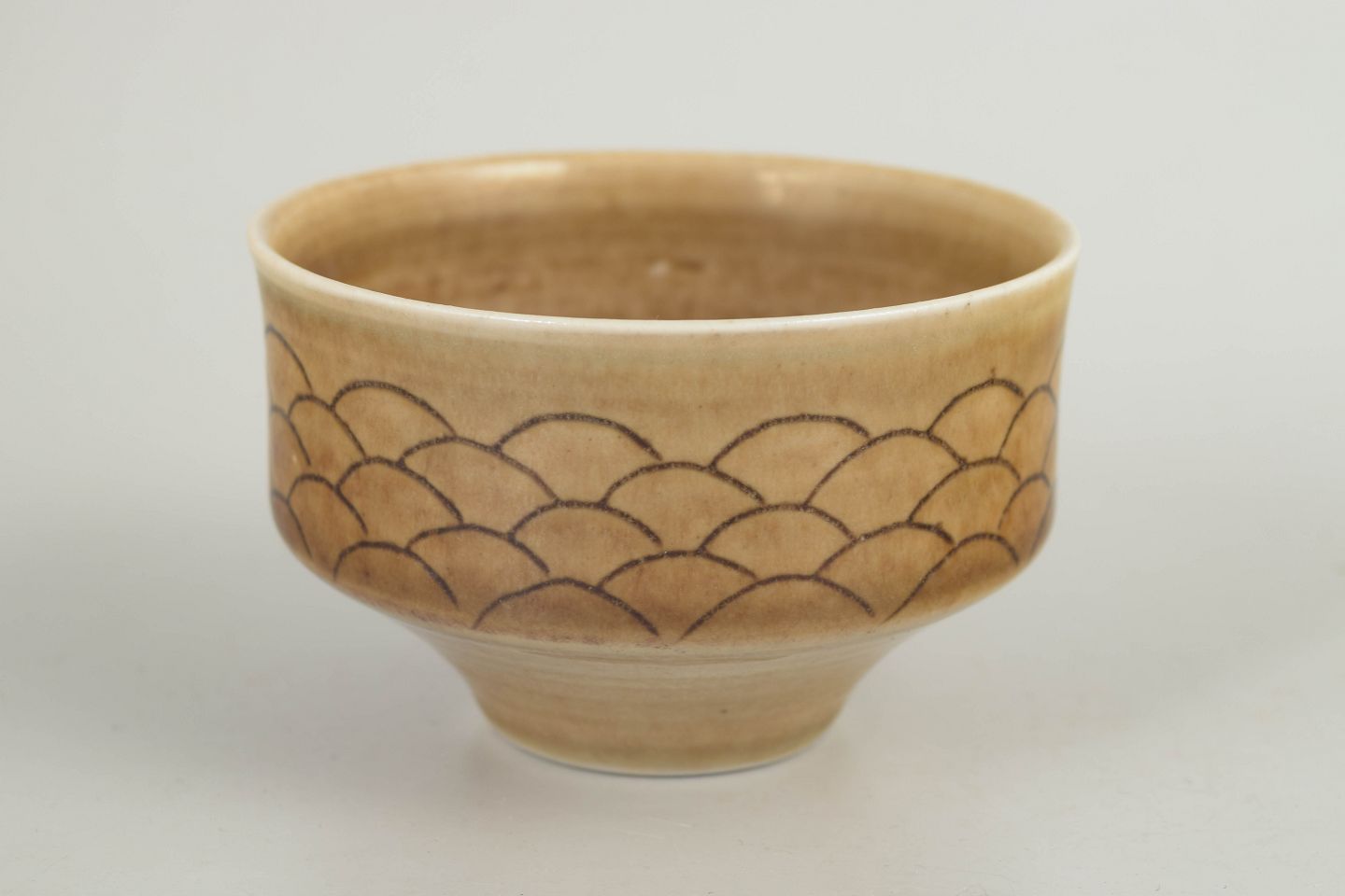 John Andersson for Höganäs, skål.Drejet skål i stentøj med let udadbøjet kant og varm, sandfarvet glasur, dekoreret med indridset, skælformet mønster langs ydersiden. Signeret i bunden, udført hos Höganäs i 1970’erne.
