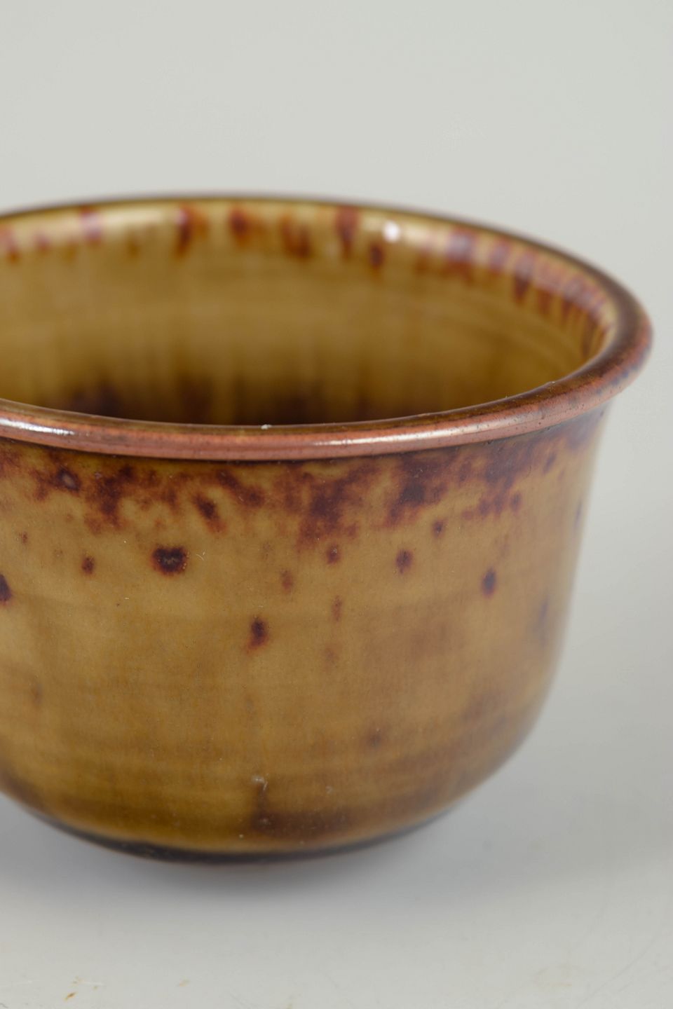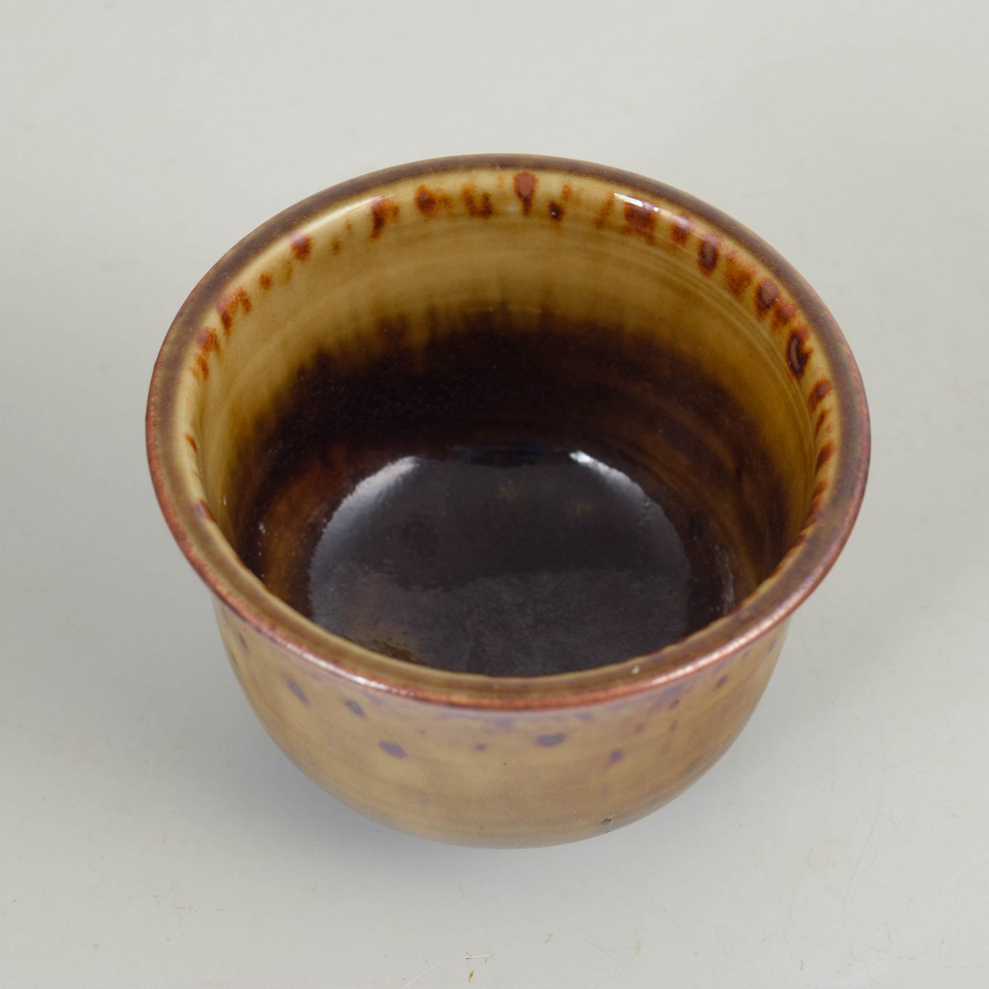 John Andersson for Höganäs, skål.Drejet skål i stentøj med let udadbøjet kant og varm honningbrun glasur, dekoreret med mørkere, spættede nuancer langs randen. Signeret i bunden, udført hos Höganäs i 1970’erne.