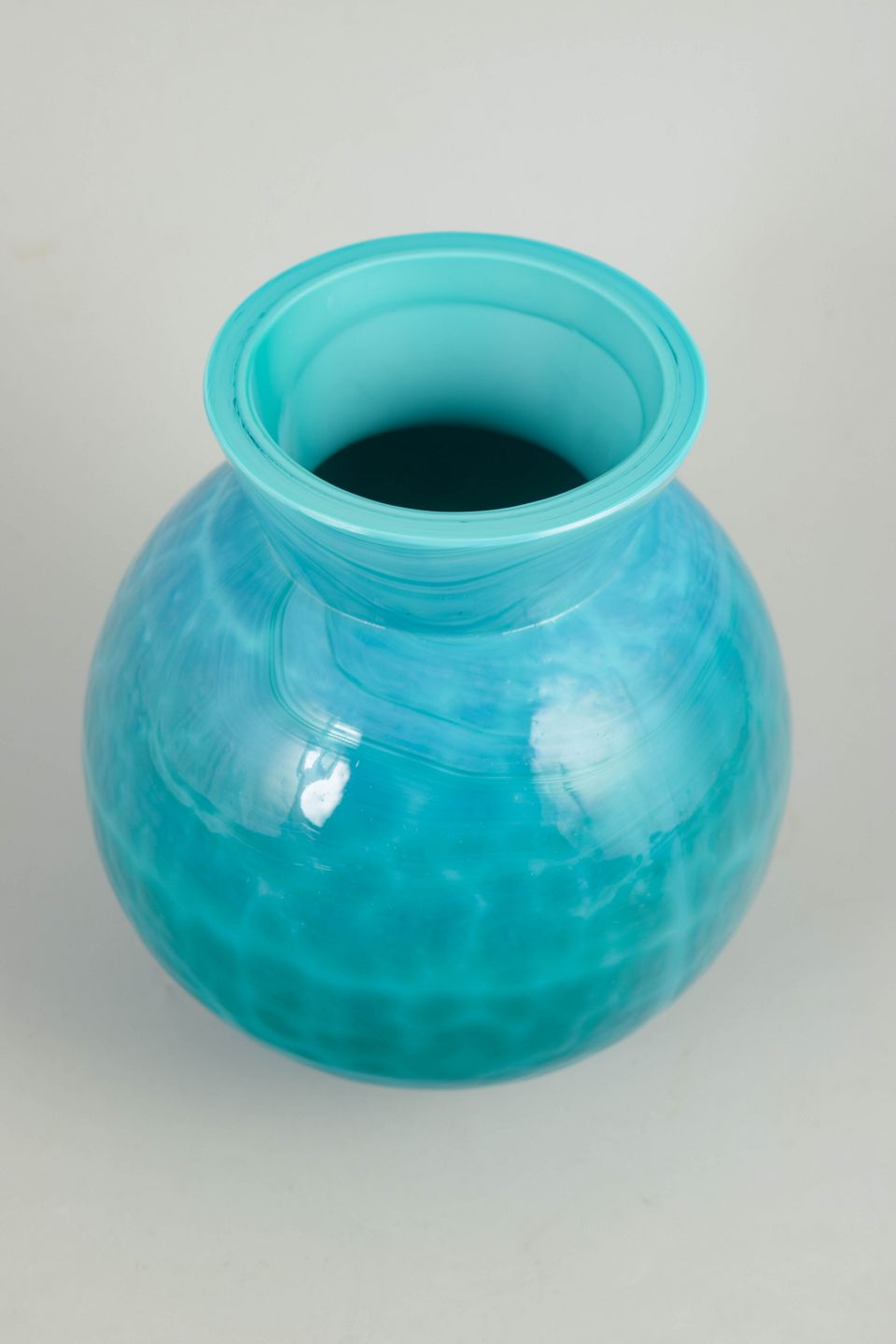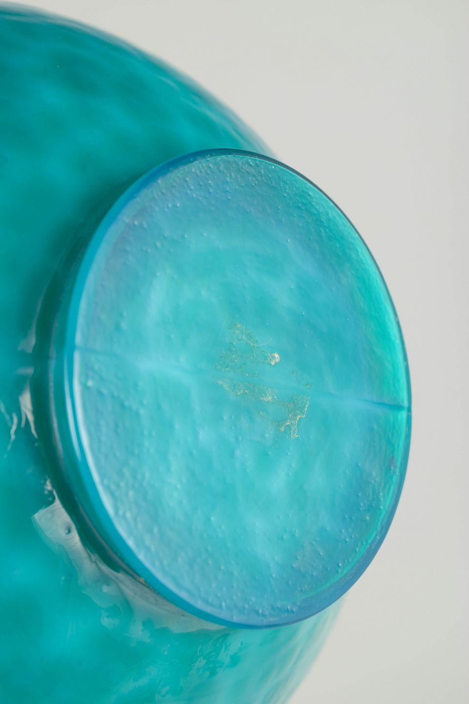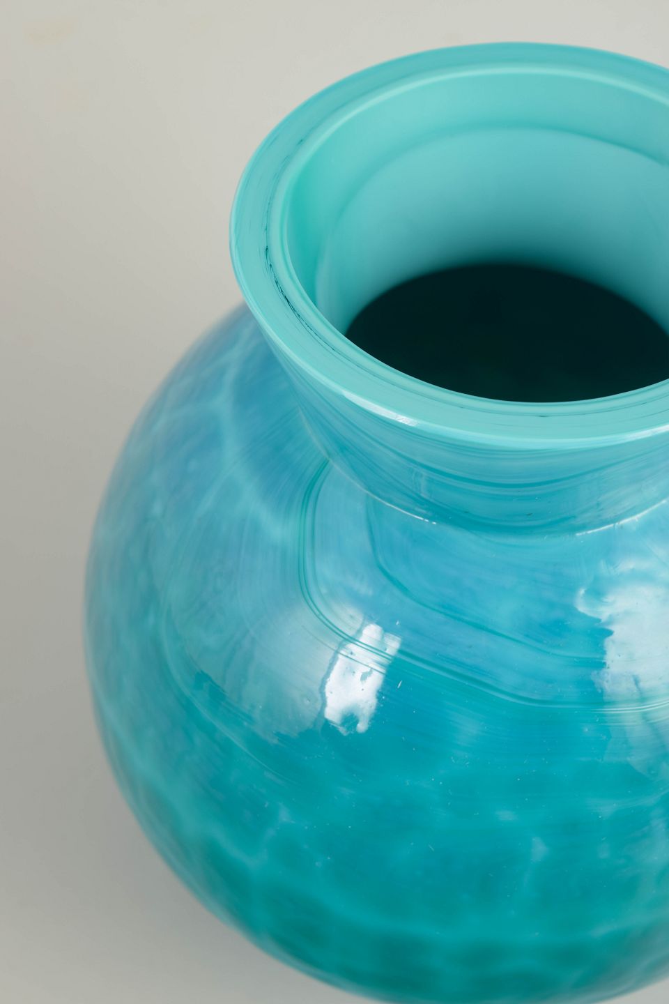 Eva Englund for Pukeberg, kunstglasvase.Rundbuget vase i turkisblåt kunstglas med levende, hvirvlende farvespil og blankpoleret overflade. Udført i serien “Malanit” med karakteristisk blød silhuet og let udadbøjet hals, typisk for svensk glasdesign fra 1980’erne.