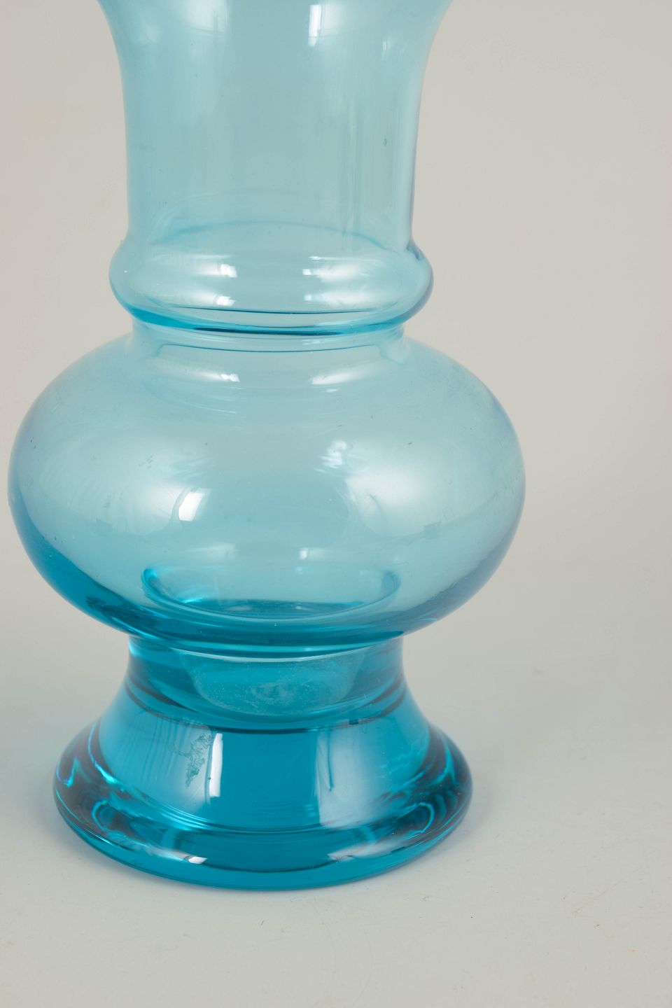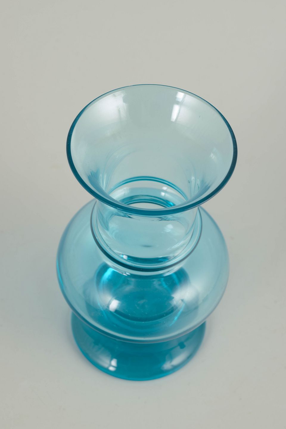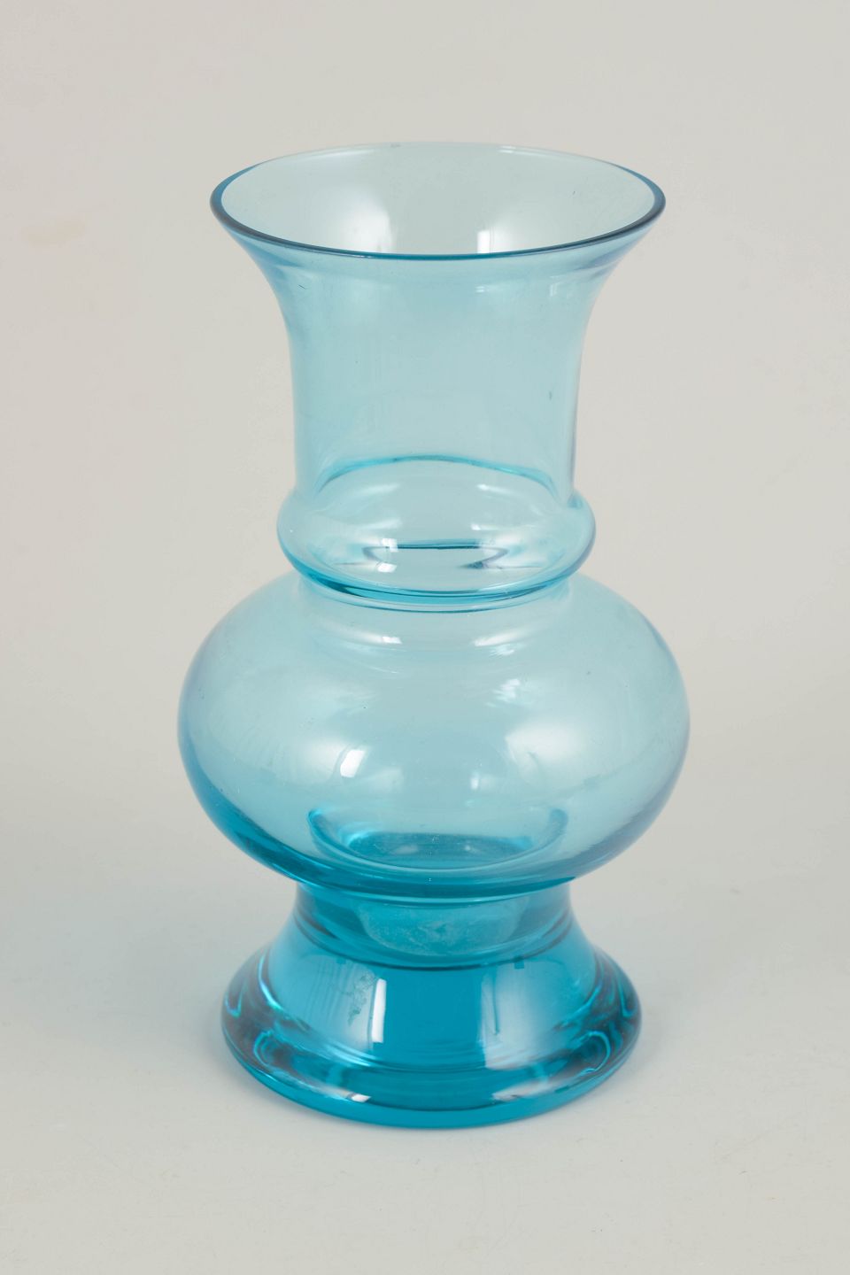 Tamara Aladin for Riihimäen Lasi, mundblæst kunstglasvase.Elegant vase i klart turkisblåt glas med balanceret, skulpturel profil og blød, rundet krop. Mundblæst udførelse med let udadbøjet hals og fod, typisk for finsk kunstglas fra 1970’erne.