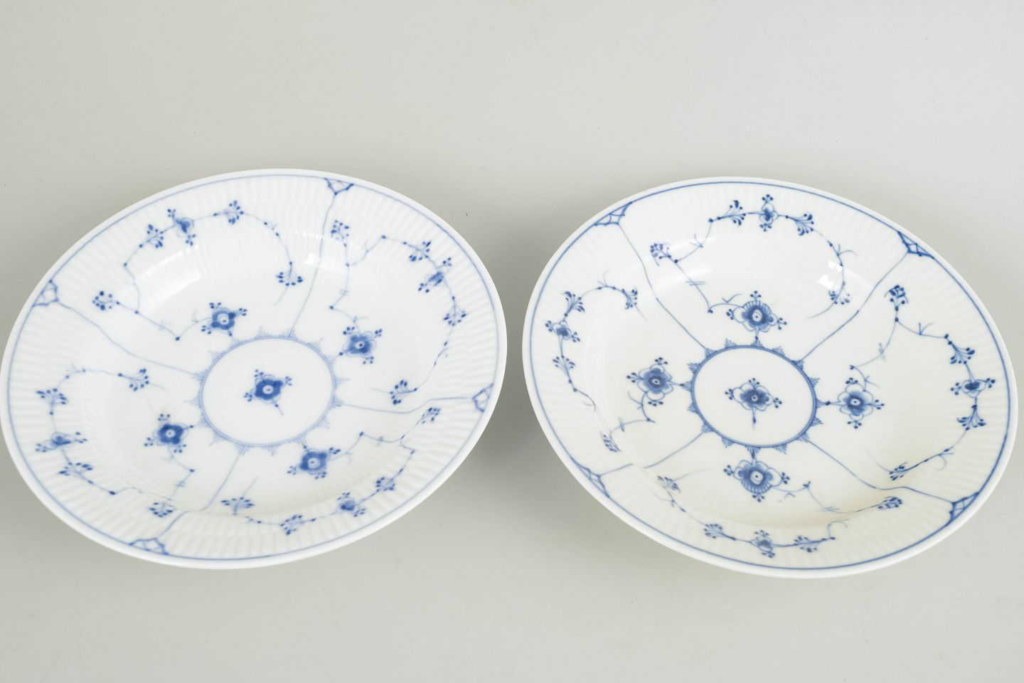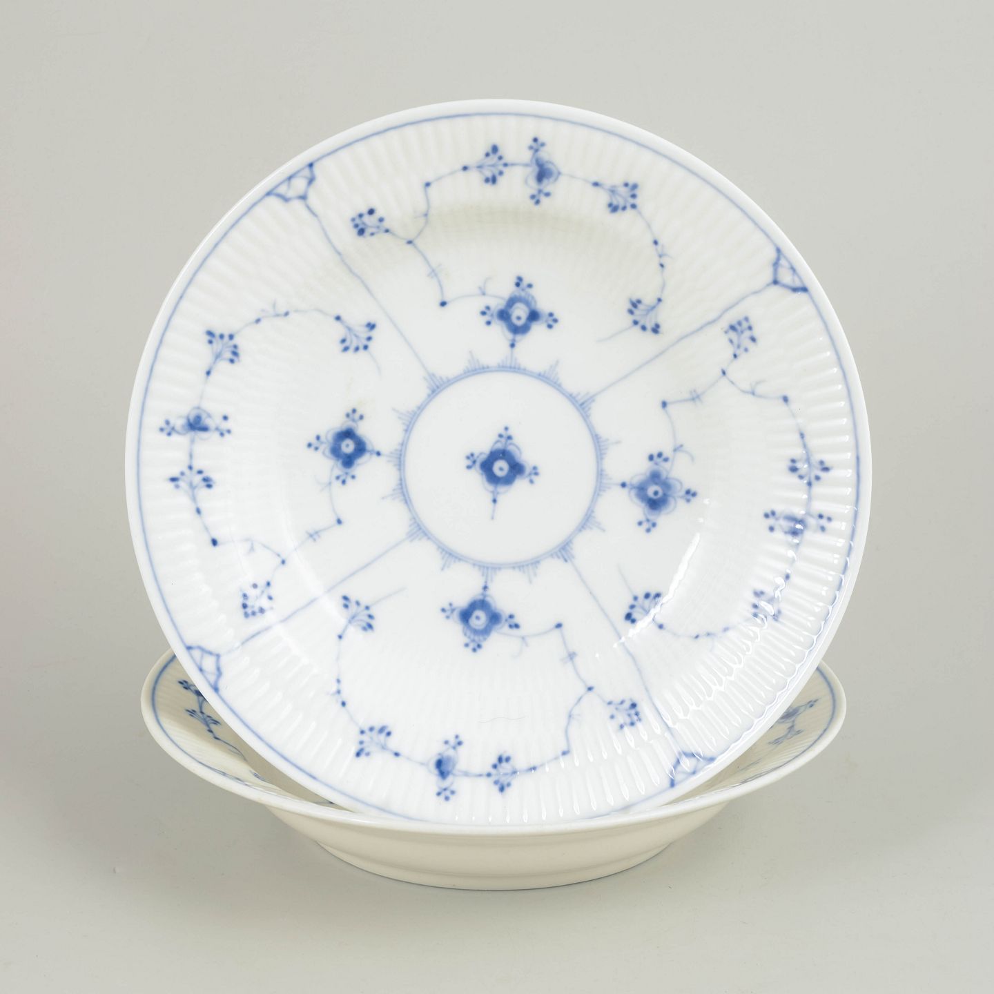 Bing & Grøndahl, Musselmalet dybe tallerkener, sæt af 2.To dybe tallerkener i håndmalet porcelæn med klassisk Musselmalet dekoration i underglasurblå. Det karakteristiske riflede porcelæn og det detaljerede blomster- og rankemotiv er udført i traditionel stil, som kendetegner Bing & Grøndahls produktion fra slutningen af 1800-tallet. Formen og dekorationen følger det historiske Musselmalet-mønster.