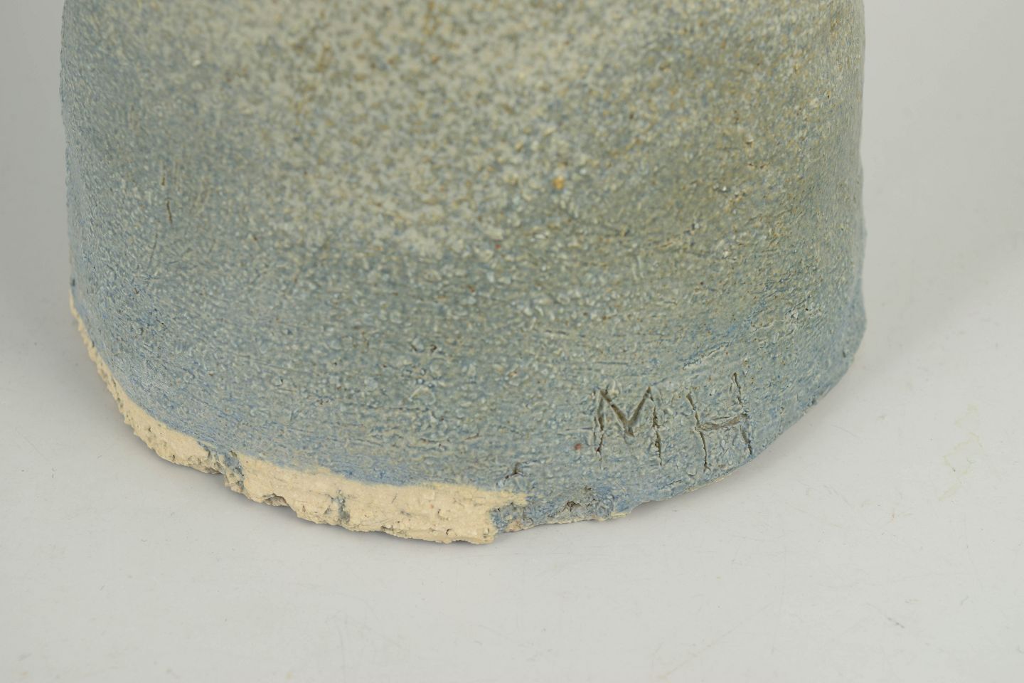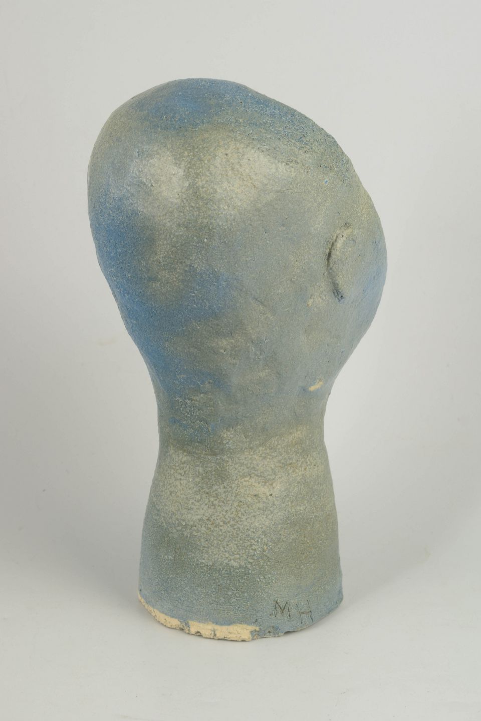 Europæisk studiokeramiker, skulptur.Unik, håndformet skulptur i stentøj med stiliseret hovedform og et roligt, skulpturelt udtryk. Overfladen er præget af en mat, let struktureret glasur i afdæmpede blå og grå nuancer. Signeret “M.H.”. Fremstår som et selvstændigt kunstnerisk værk inden for europæisk studiokeramik.