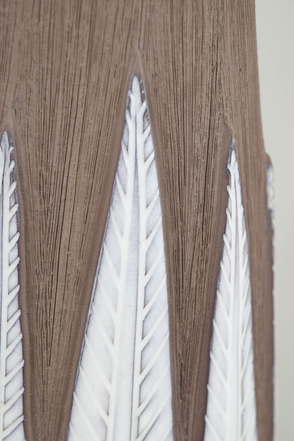 Anna-Lisa Thomson for Upsala Ekeby, Paprika vase.Elegant vase i stentøj med karakteristisk reliefdekoration inspireret af paprikaformede blade, udført i kontrasterende glasurer i jordfarvede og lyse toner. Et ikonisk design med klar tilknytning til svensk midten-af-århundredet keramik.