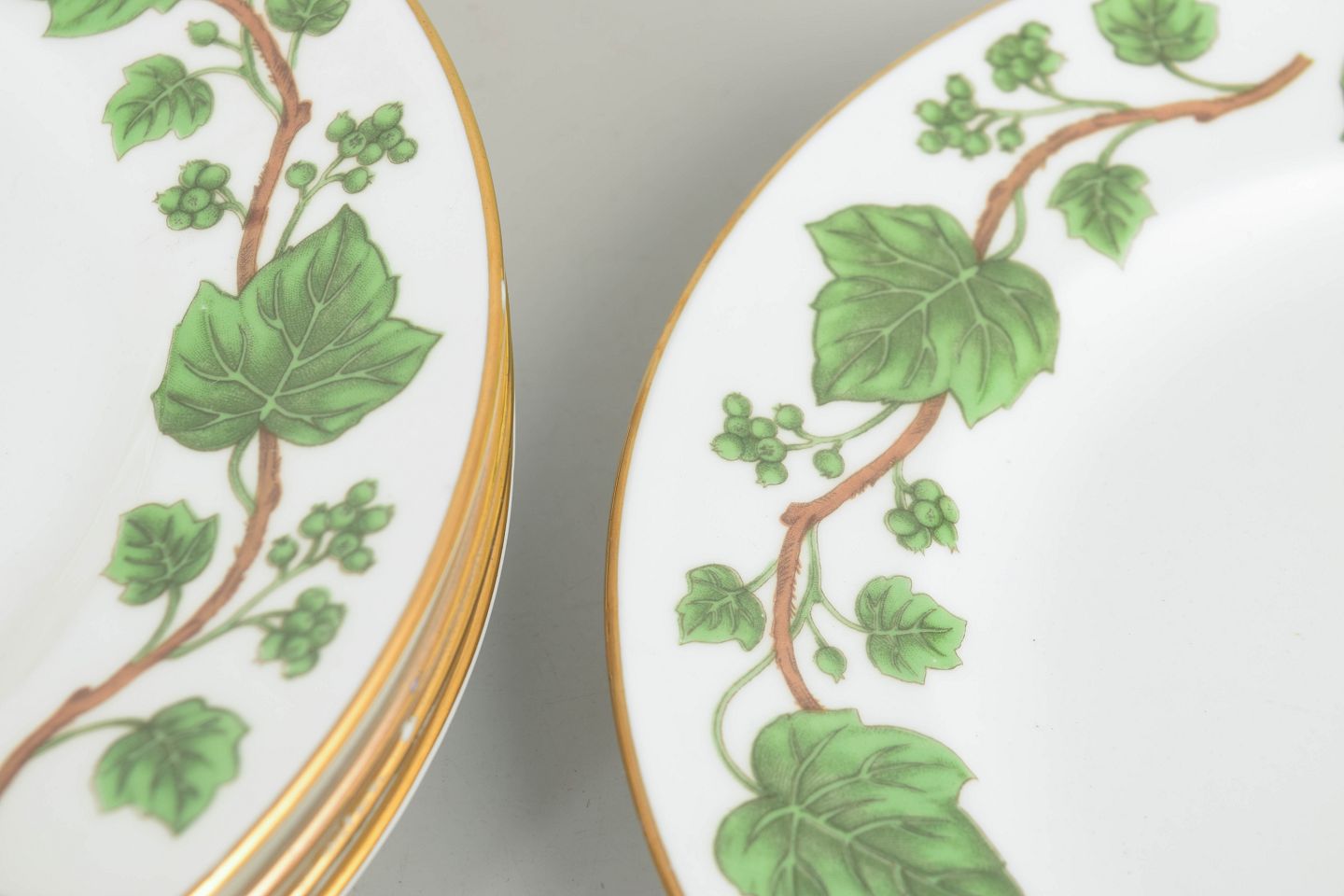 Staffordshire, England, Ivy serien, sæt med fem tallerkener.Dekorative fajancetallerkener med grøn vedbend dekoration og guldkant, produceret i Staffordshire, England.