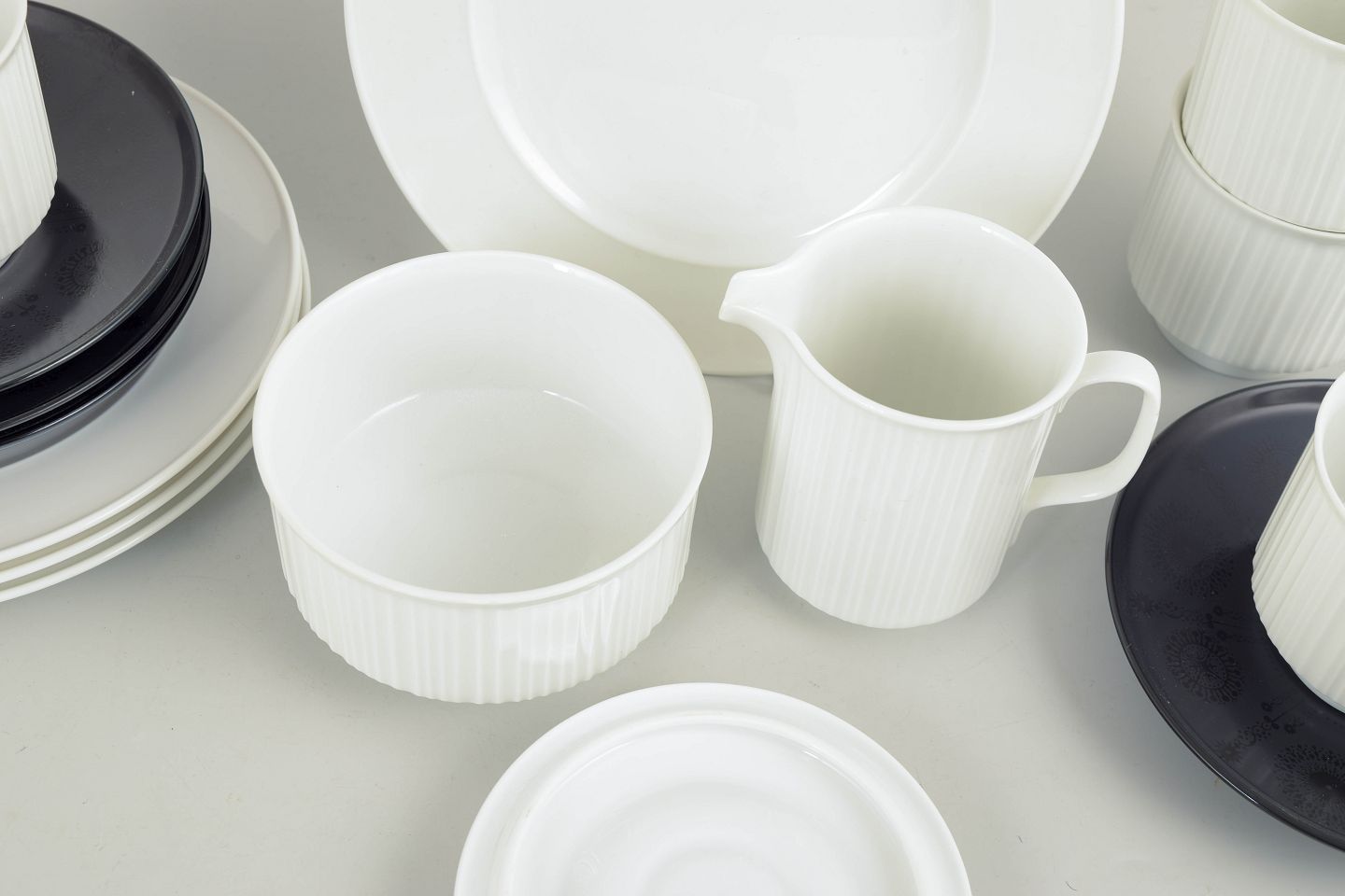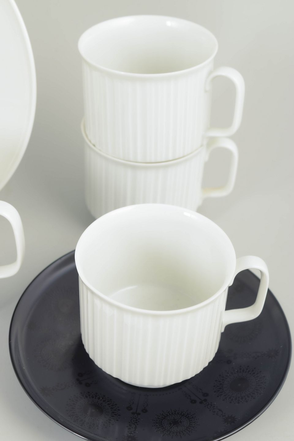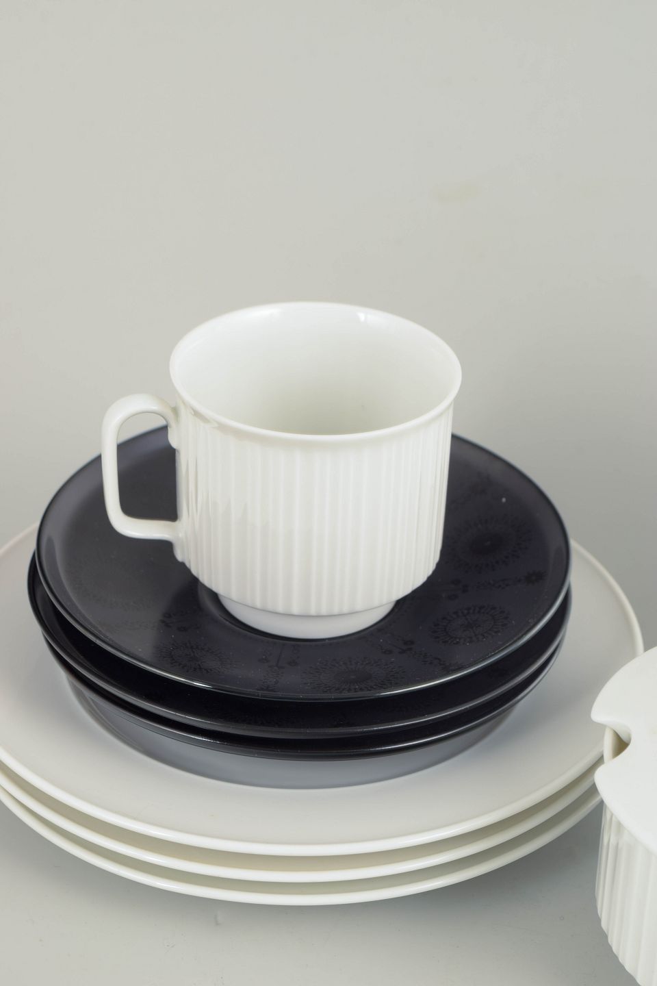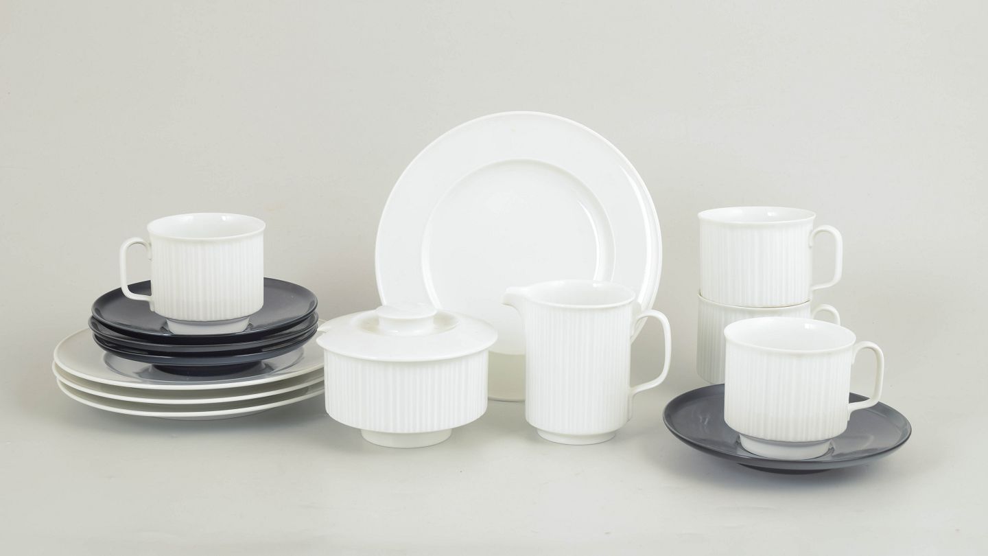 Tapio Wirkkala for Rosenthal, “Variation” kaffestel.Komplet kaffestel i hvidt porcelæn med karakteristisk rillet overflade, kombineret med kontrasterende underkopper og tallerkener. Elegant og funktionelt formsprog med tydelig nordisk modernistisk karakter.