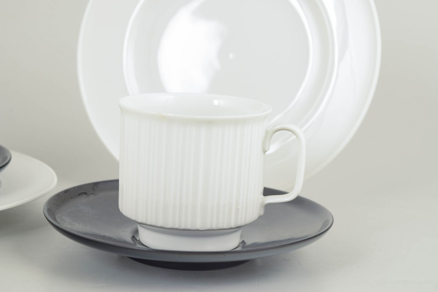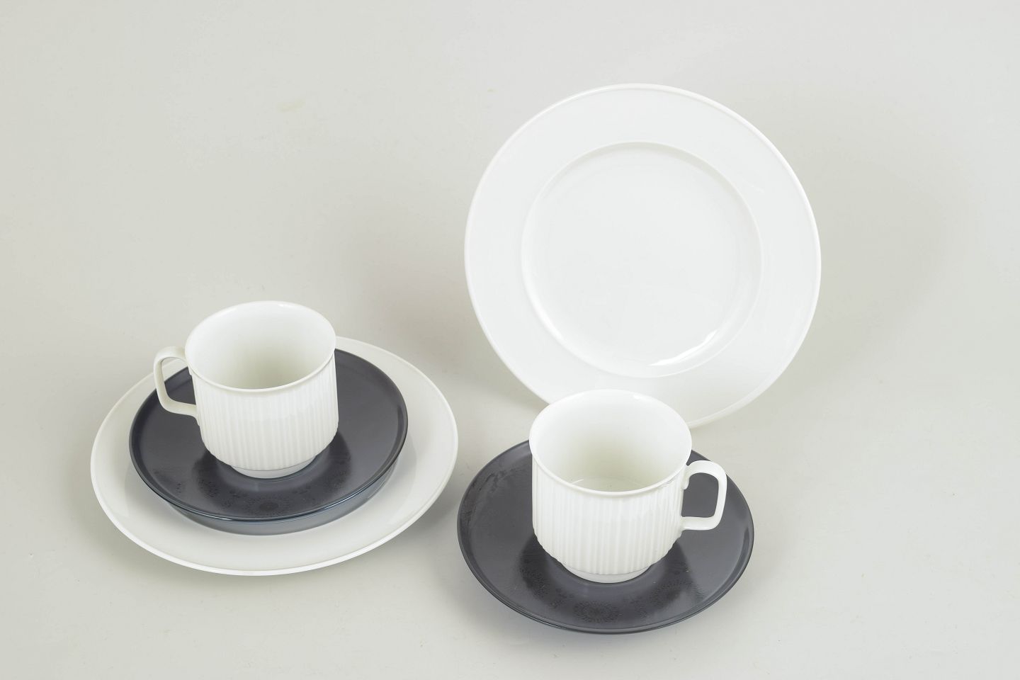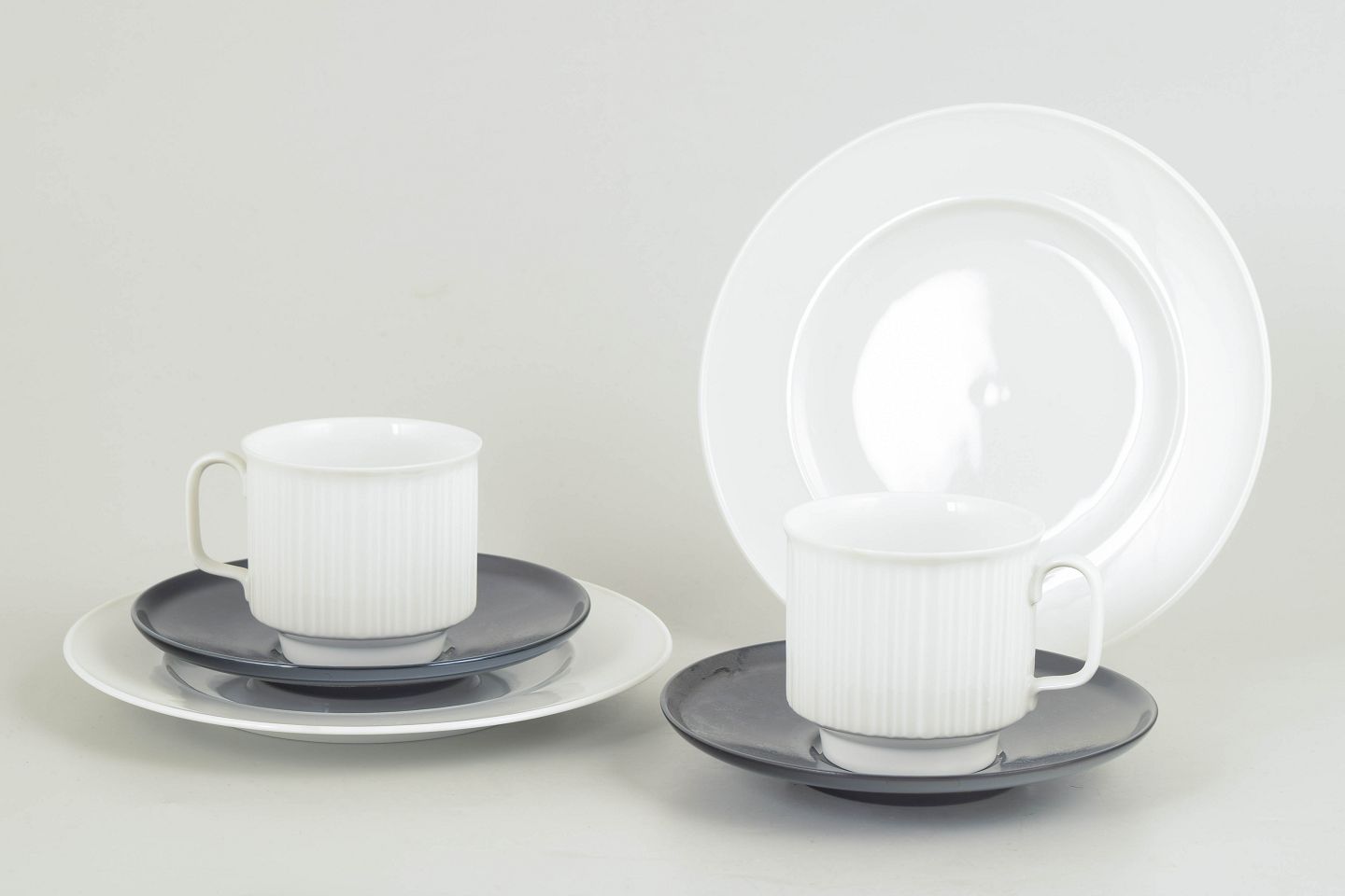 Tapio Wirkkala for Rosenthal, to kaffekopper med tilhørende underkopper og kagetallerkener.Sæt bestående af to kaffekopper i hvidt porcelæn med karakteristisk rillet overflade, hver med tilhørende underkop i kontrasterende glasur, samt to matchende kagetallerkener. Et funktionelt og stramt formsprog med tydelig nordisk modernistisk karakter.