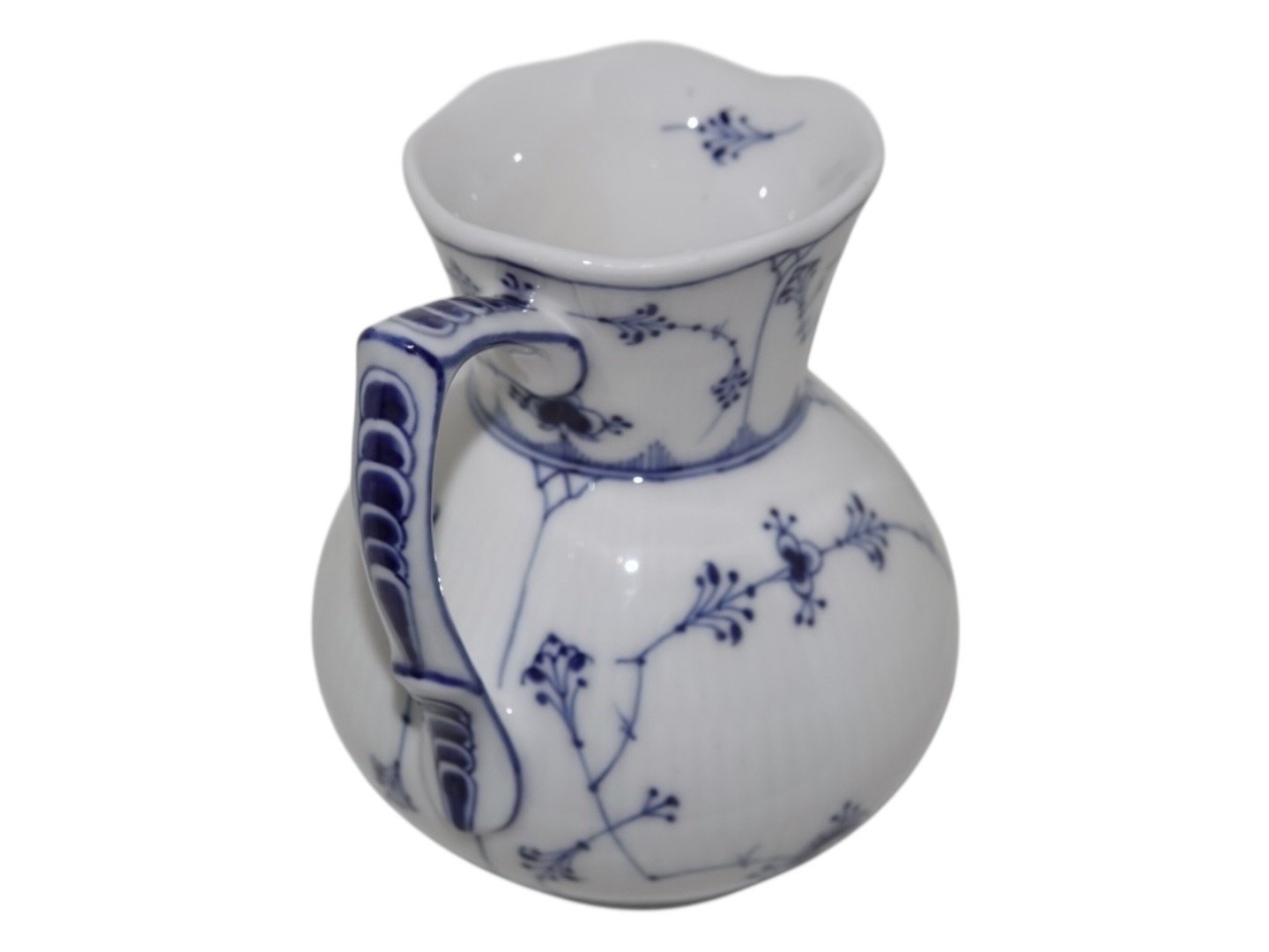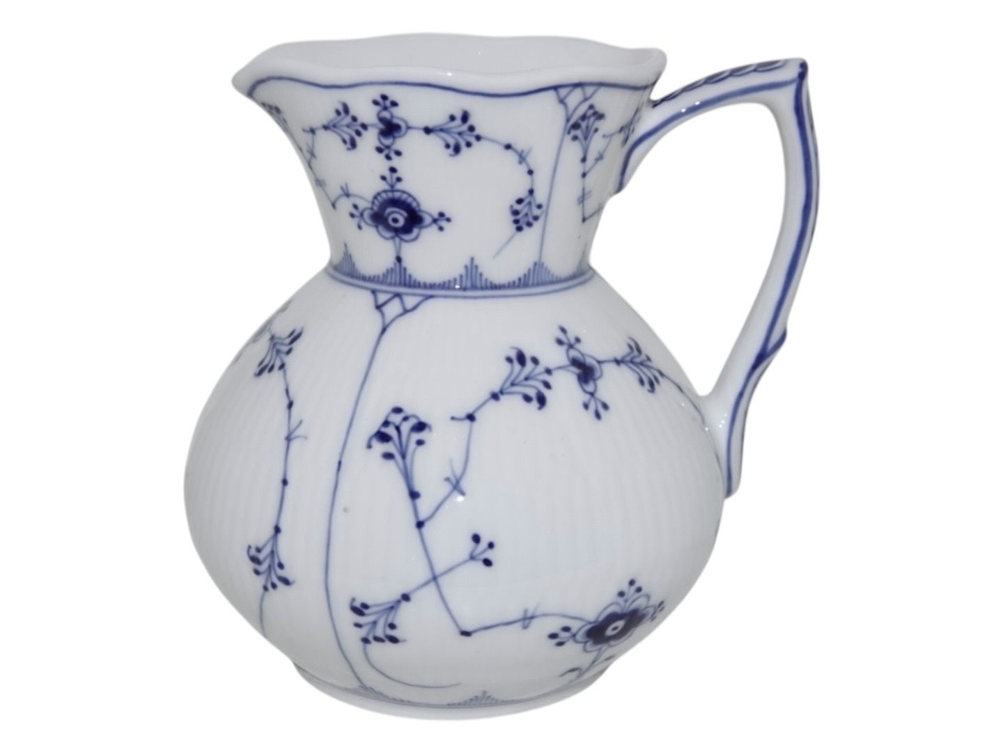 Royal Copenhagen Musselmalet Riflet, sjælden mælkekande.Af fabriksmærket ses det, at denne er produceret i mellem 1898 og 1923.