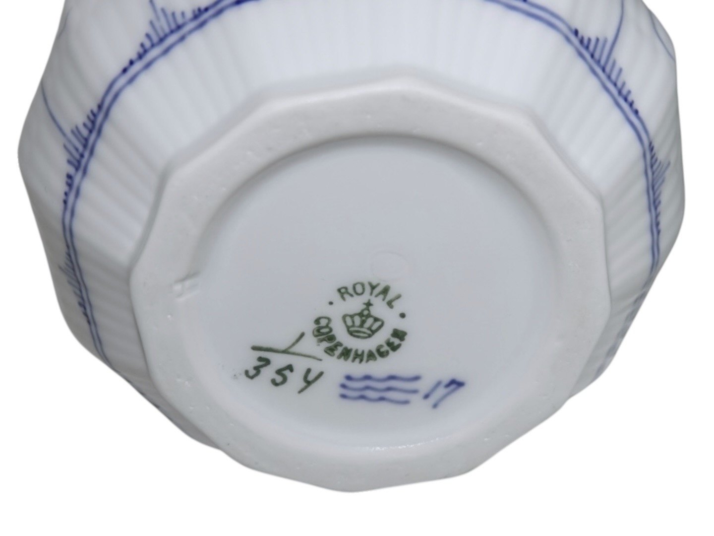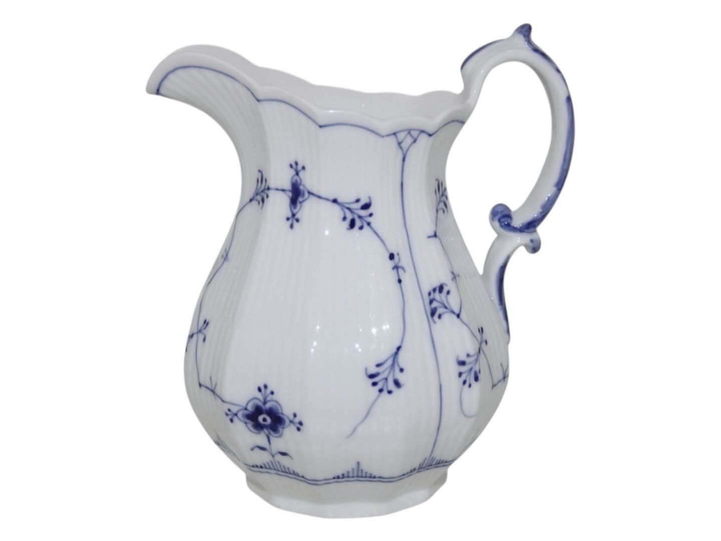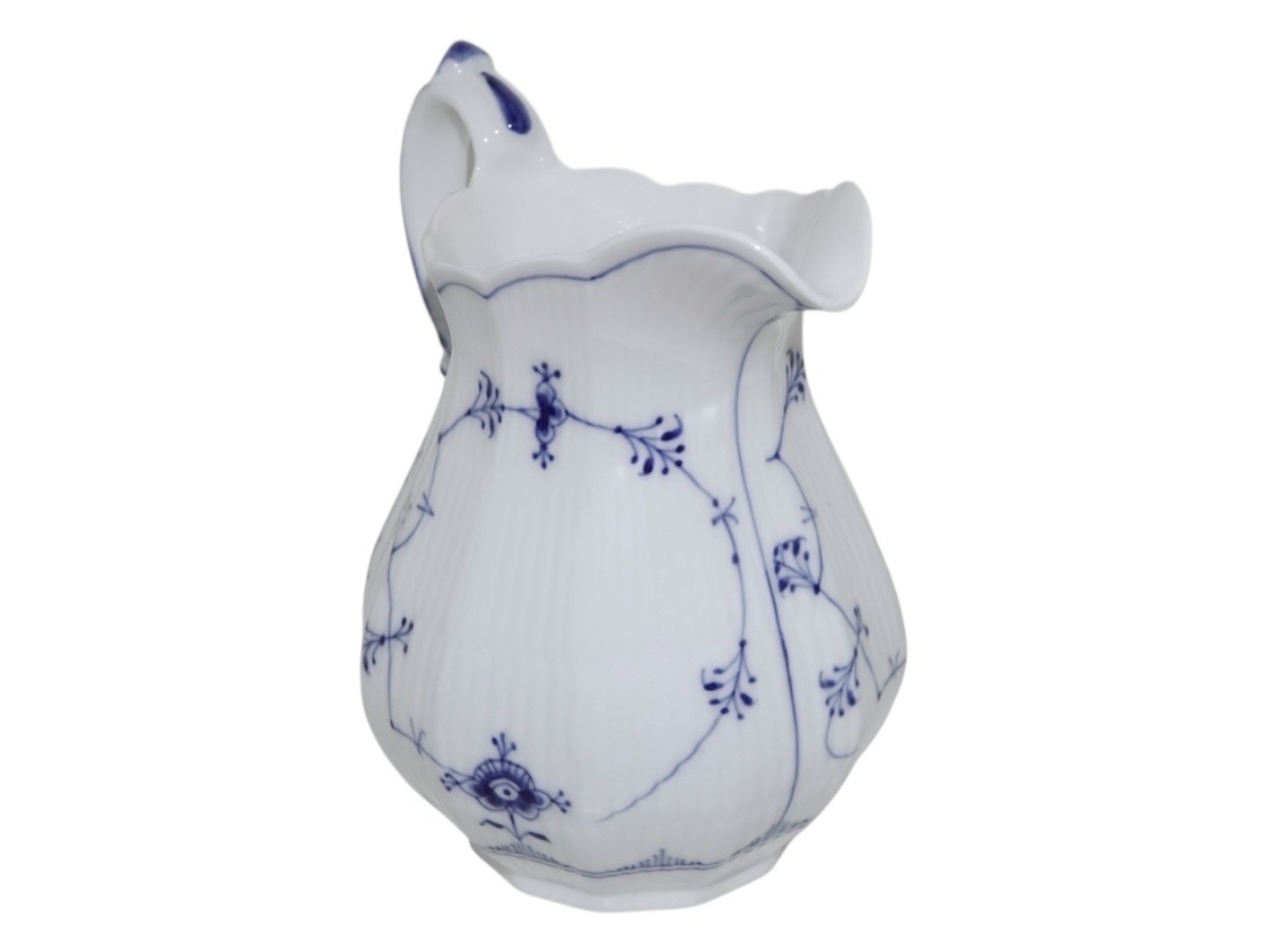 Kongelig Musselmalet Riflet, lille mælkekande.Af fabriksmærket ses det, at denne er produceret i mellem 1898 og 1923.