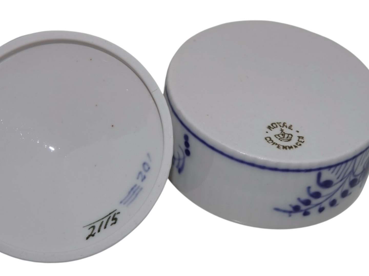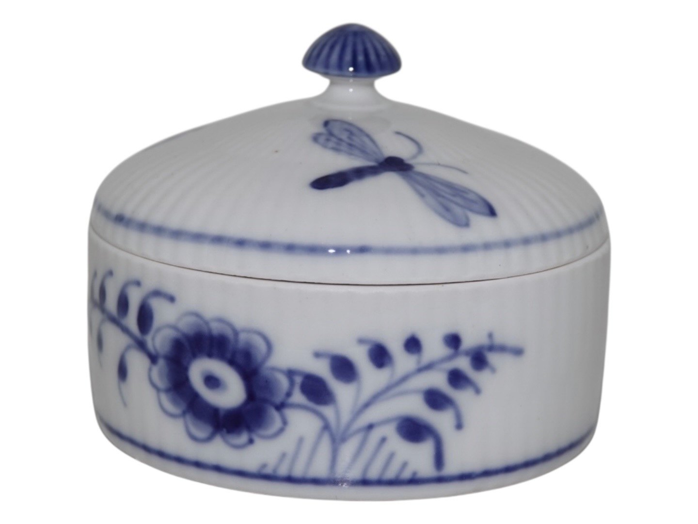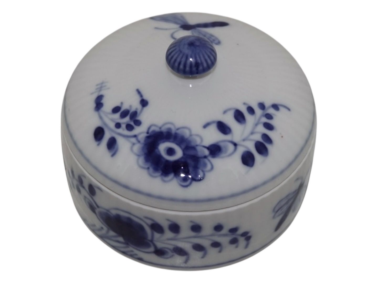 Royal Copenhagen Musselmalet Riflet, lille skål med låg.Af fabriksmærket kan det udledes, at denne er produceret mellem år 1898 og 1923.