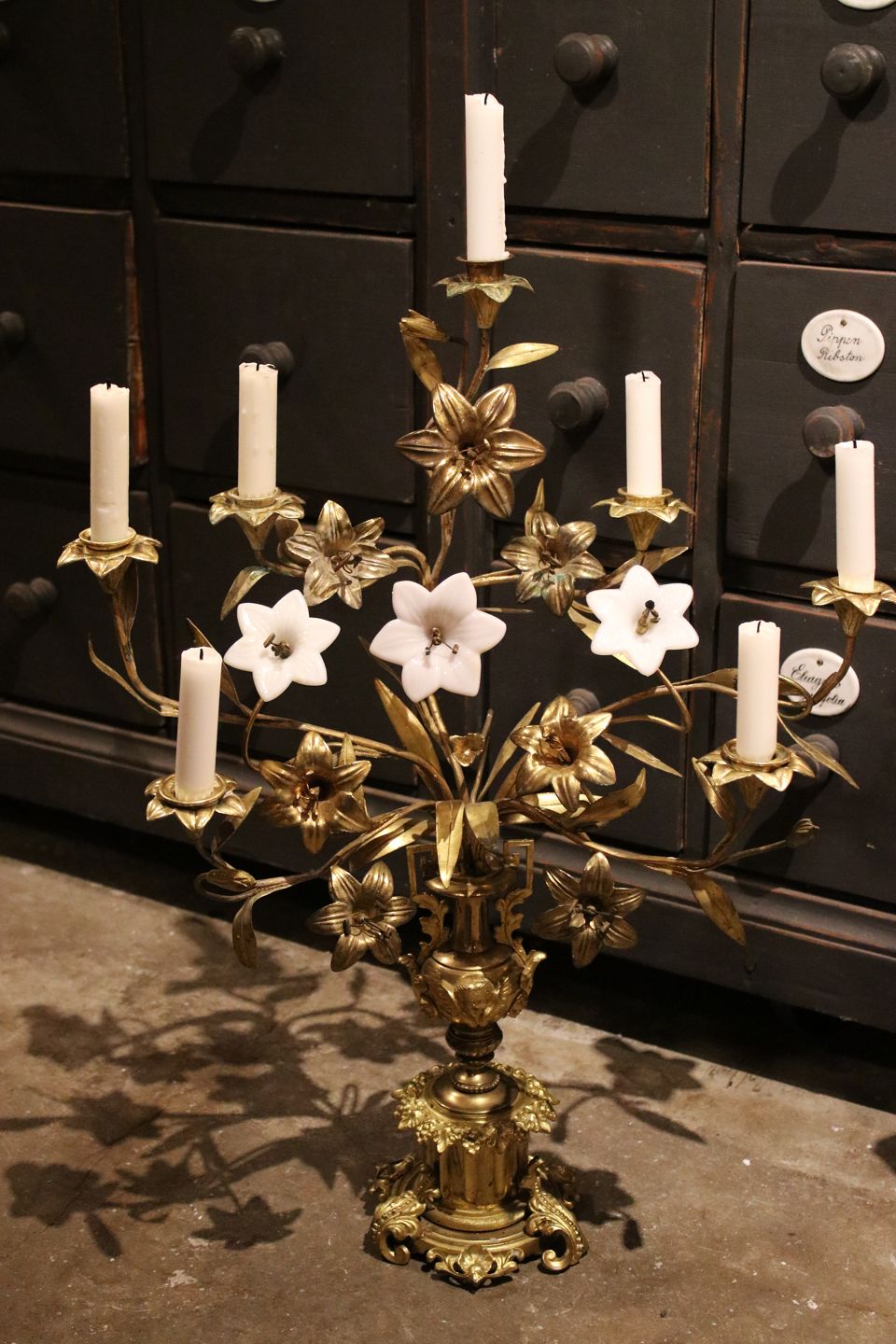 Gammel Fransk kirkelysestage i bronze , dekoreret med bronze liljer og 3 gamle hvide opaline glas liljer...