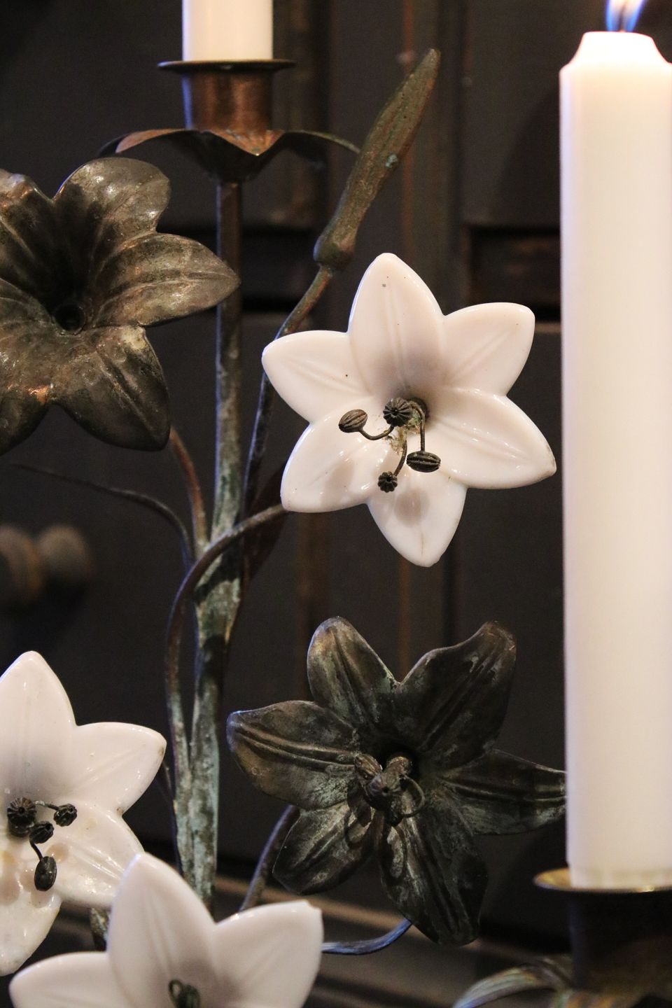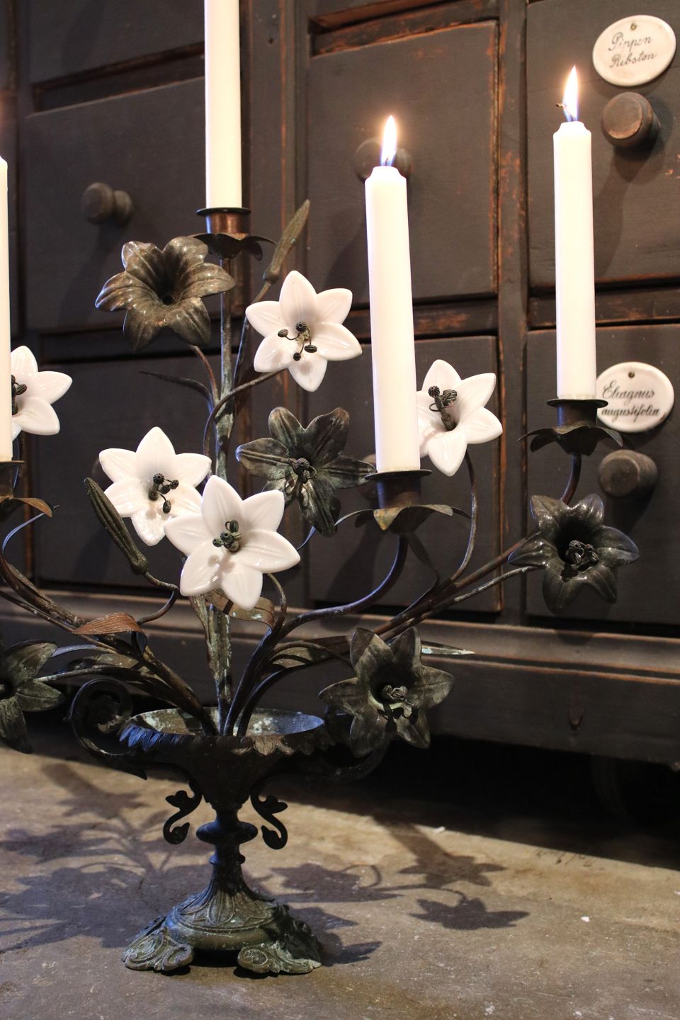Antik fransk kirkestage i helt mørk patina , dekoreret med 5 gamle hvide opal glas blomster...