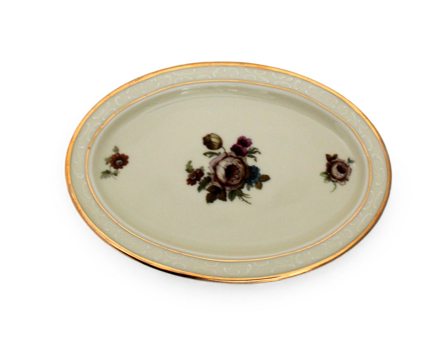 Kjøbenhavns Porcellains Maleri, Rosenborg, Ovalt lille fad. Længde 25,5 cm. Bredde 18 cm. Lettere brugsslid på guldkant. Pris: 150 kr. stk. Lager: 1