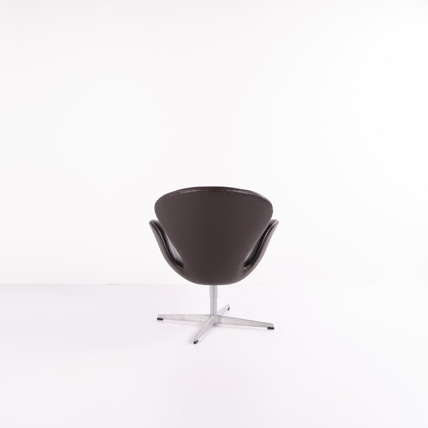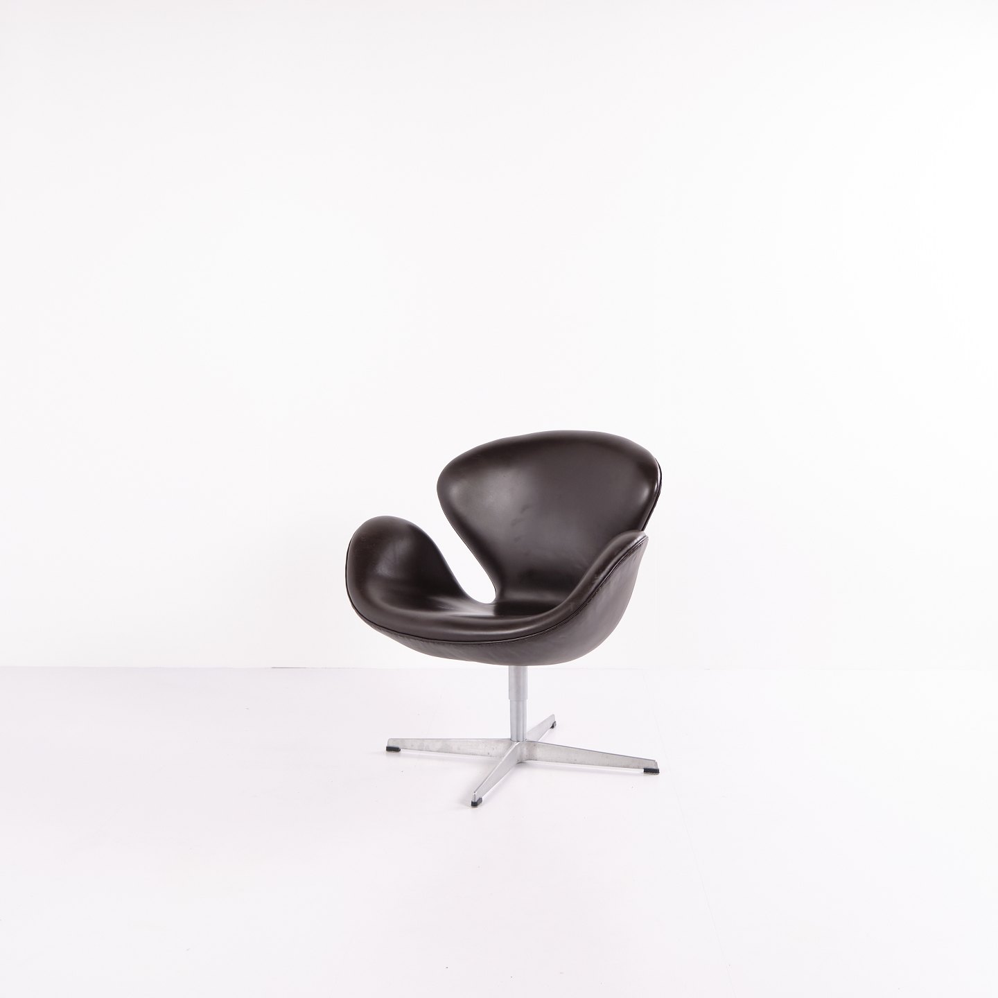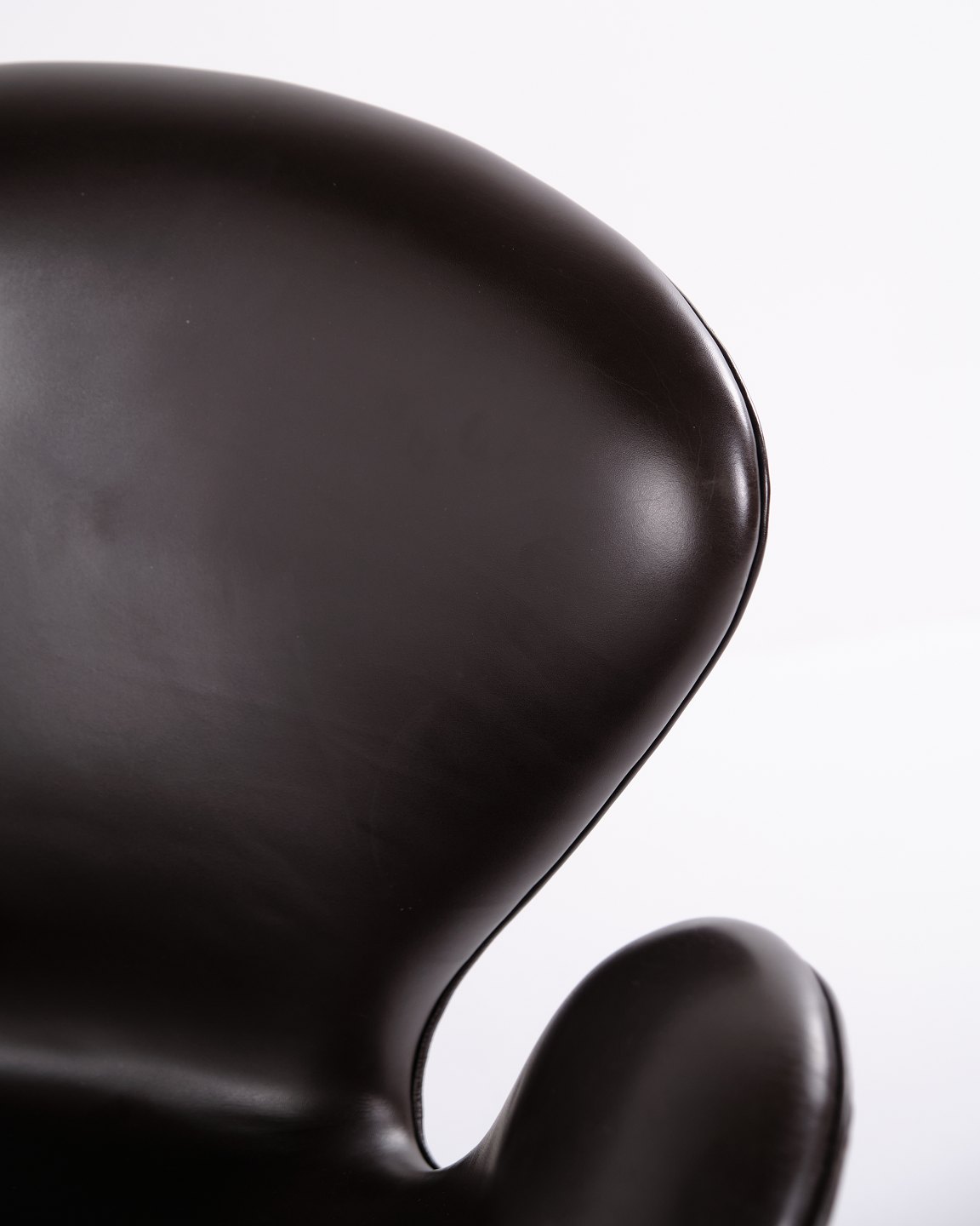 Swan-Sessel Modell 3320, entworfen von Arne Jacobsen und produziert von Fritz Hansen. Ausgeführt in braunem Leder. Produziert im Jahr 2007. Ein ikonischer Klassiker des dänischen Designs.— Designer: Arne Jacobsen
