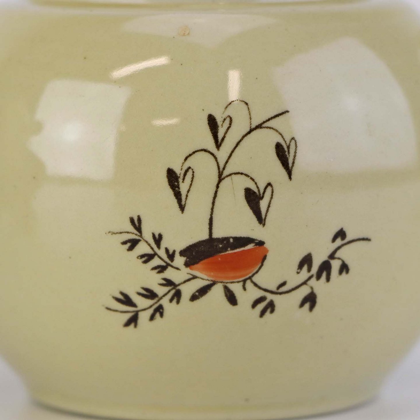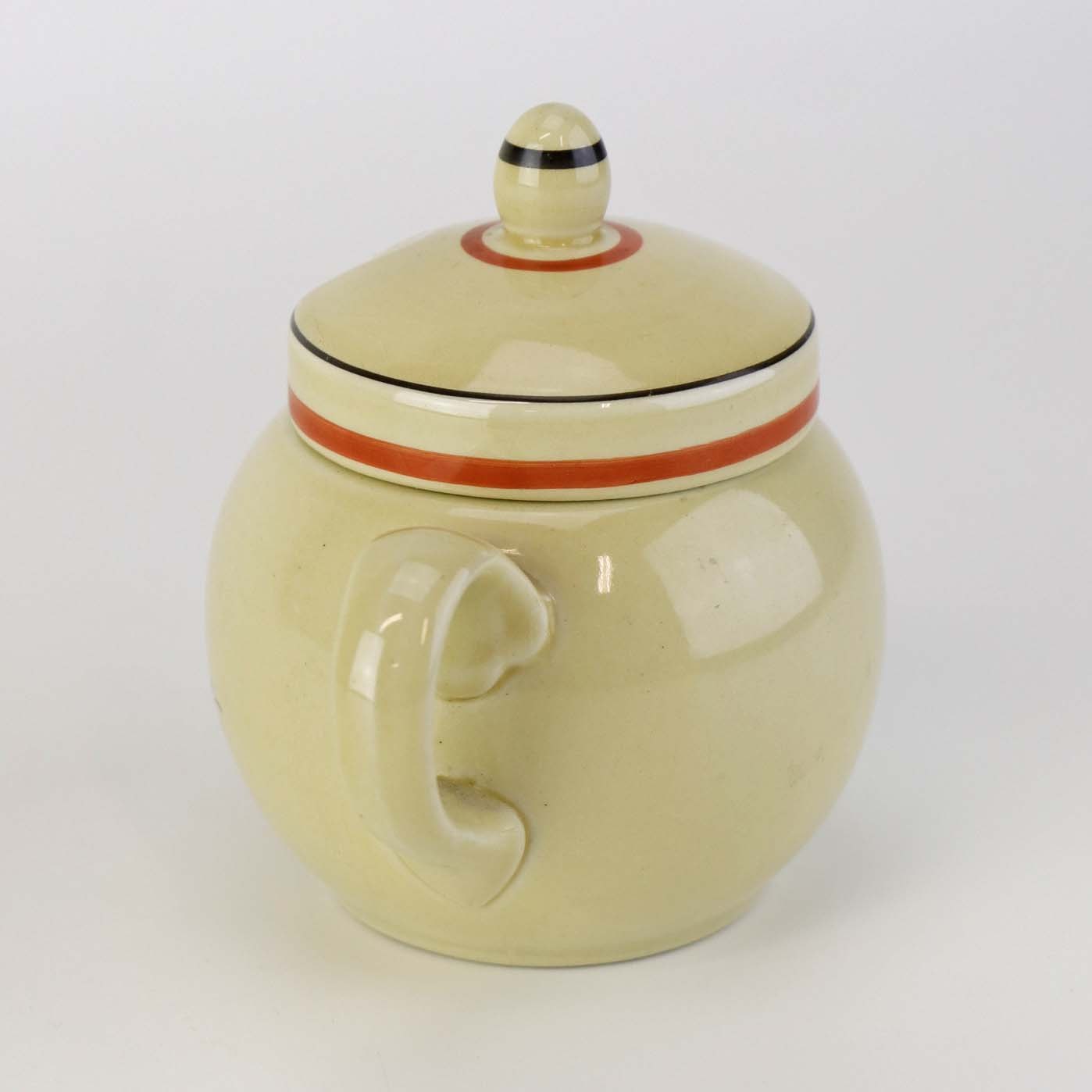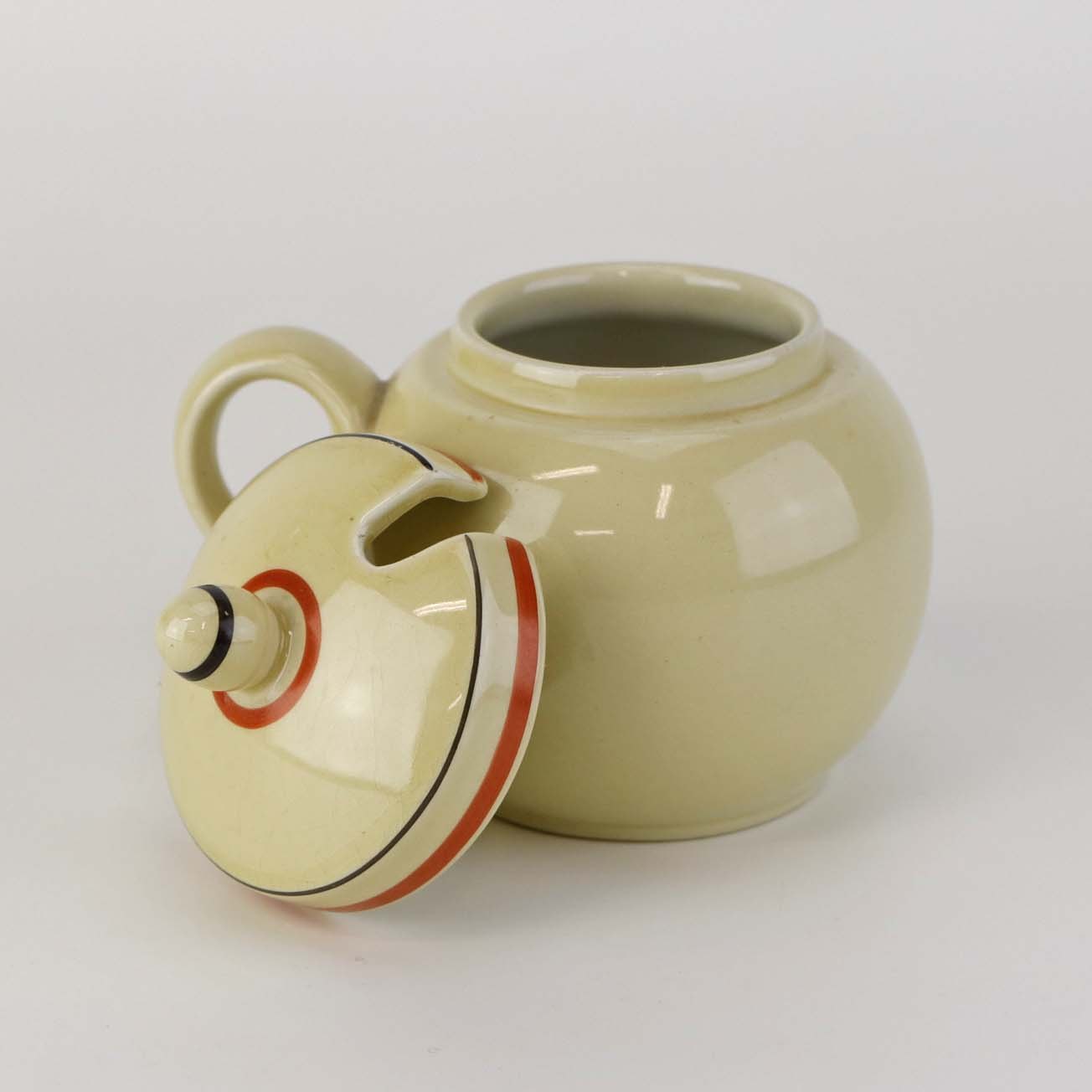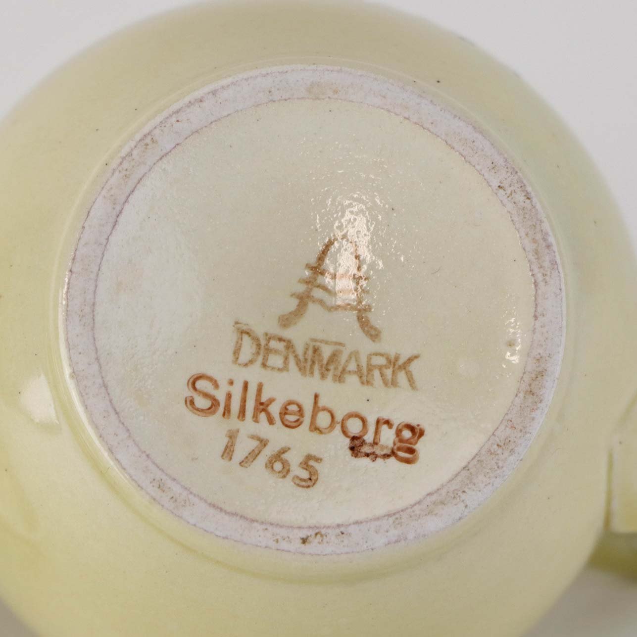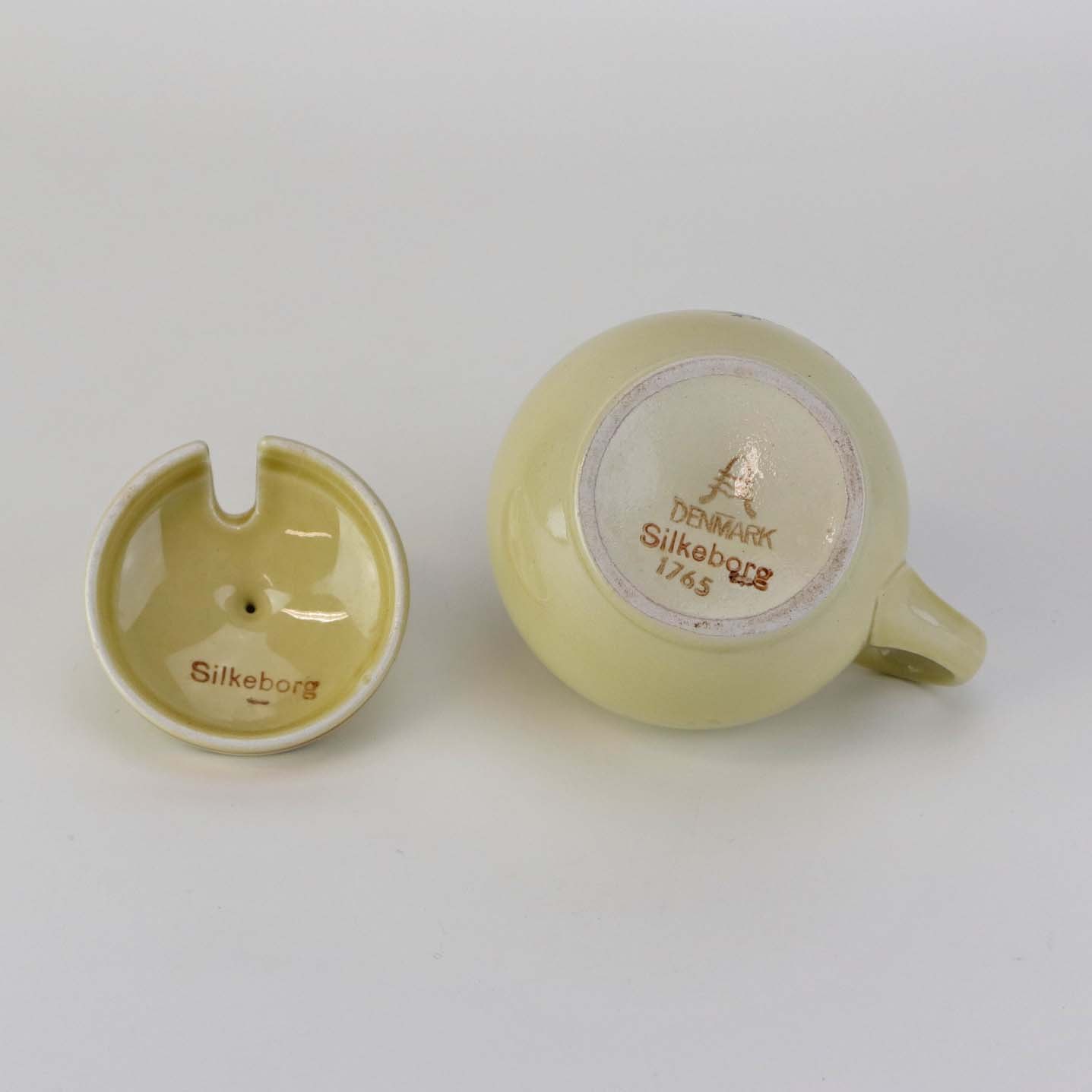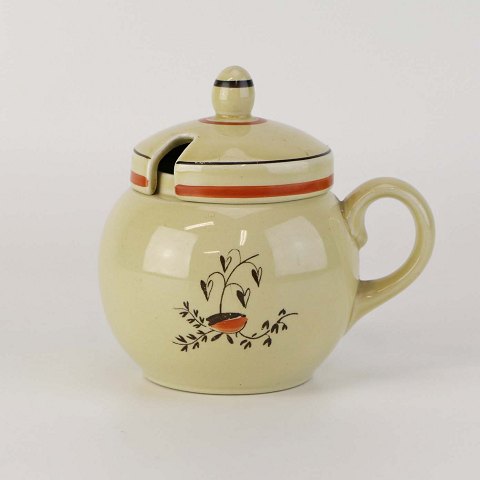 Kop med låg og hank til sennep i fajance fra stellet Silkeborg fremstillet i perioden 1937-1939. Nr. 1765Formgiver Thorkild Olsen