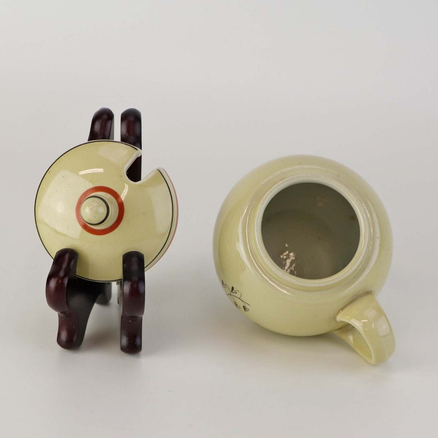 Fajancestel i stelform E med orangerød og brunt dekoration på gul baggrund og med orangerød kant.